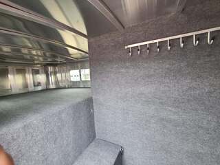 Platinum Coach 6 horse Perfect Trainer / Side Tack!! 7’6” wide x 27’ long x 7 tall Side tack with 6 saddles, 6 bars, 4 brush trays, 30 bridle hooks!!!! Dressing room with boot box, carpet on walls, and hooks on slant wall Clothes rod in dressing room nose area, curb side Full width shelf above saddle racks & blanket bars Plexiglas & Track on driver and passenger side, not rear gates Flow through dividers and stud divider with rubber on first divider Glued stall mats on driver and passenger side Break divider on last stall, allows divider to fully open when rear gates are closed 6 two-way roof vents in horse compartment...MAX AIR FLOW!! Flow through steps for side tack and dressing room 6’ hay rack 7 lights on top rail 7 halogen load lights 7200# axles & 14 ply tires Aluminum 16” wheels Stainless Steel on Nose White Exterior Skin