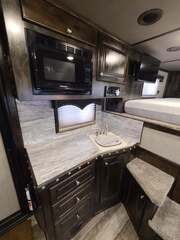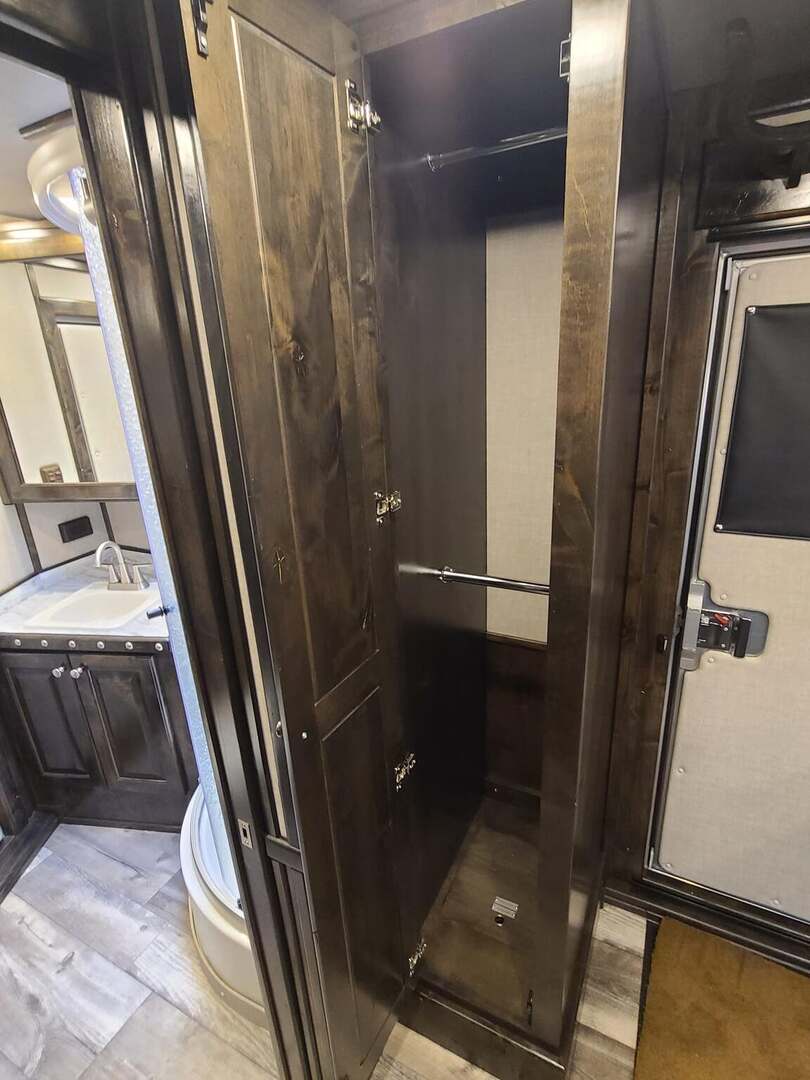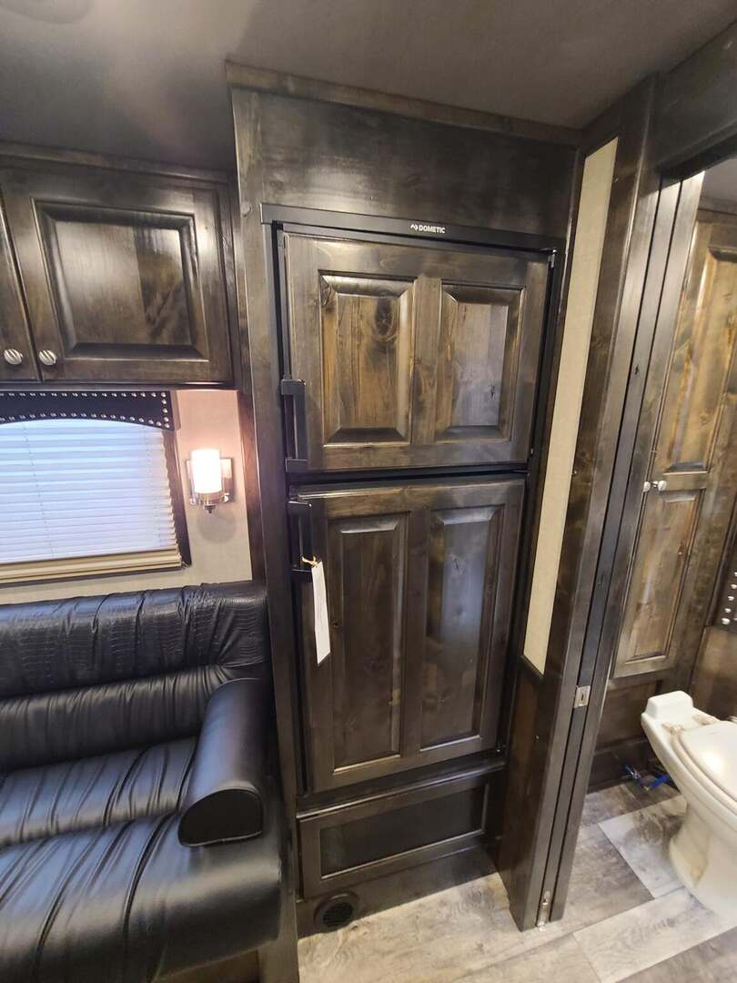 THIS TRAILER IS ON ORDER AND WILL ARRIVE IN DECEMBER Proline XP by Outlaw Conversions features: Onan 4.0 MicroQuiet generator Ebony Alder Brio wood with Custom Cabinetry 15,000 BTU A/C with HEAT PUMP 72” sofa sleeper 6.0 propane / electric refrigerator 20,000 BTU propane furnace 6 gallon 12VDC / 120VAC water heater 60 gallon fresh water tank 24” LED Smart TV on arm AM/FM/CD/DVD player with 2 exterior speakers Power awning with cover Single leg hydraulic jack Double 30# propane bottles Microwave over kitchen sink 32” radius shower with power vent above Large vanity next to shower Porcelain toilet in front of large closet Platinum Coach features: 8 x 26 x 7’6” tall 7200# axles, 14 ply tires on aluminum wheels Blocked axles, and raised neck for great ground clearance Full width rear tack, tons of tack accessories Stud divider on first stall Break divider on load divider Two mangers, two access doors Escape door on first horse Drop down windows on head & hip 6’ enclosed hay pod for extra storage Onan 4.0 generator mounted in gen box behind pod 5 lights on top rail, all round LED 3 Halogen load lights
