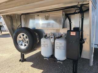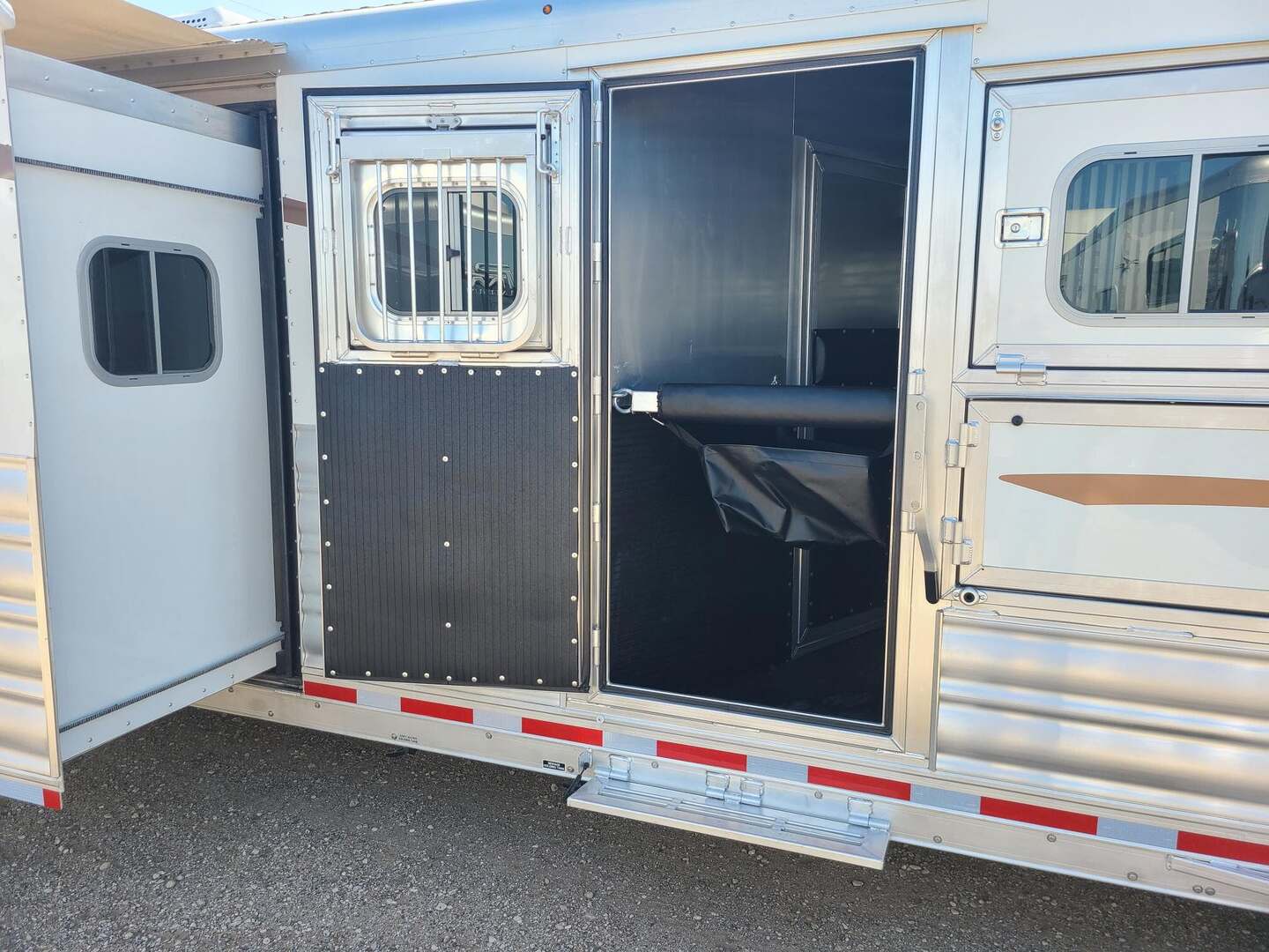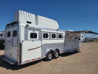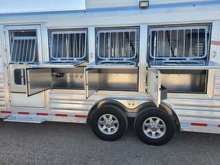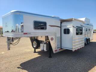THIS TRAILER IS ON ORDER AND WILL ARRIVE IN OCTOBER Platinum Coach 4 horse 12’8” Side Load with Slide Out Proline XP by Outlaw Conversions features: Onan 4.0 MicroQuiet generator Power Dometic awning over LQ  Dark Knotty Alder wood interior 72” Sofa sleeper with custom leather accent 15,000 BTU A/C with HEAT PUMP 20,000 BTU propane furnace 6.0 propane / electric refrigerator 6 gallon propane / electric water heater 2-30# propane bottles TWO TV’s, one 24” in bed, one 24” in living AM/FM/CD/DVD player with 2 exterior speakers Double hat racks over sliding screen Flip down bench on outside Double sink in kitchen with covers Two burner cooktop under microwave oven with vent hood 32” radius shower next to LARGE double rod closet Vanity sink with toilet in front Pocket door separating LQ from horse area 24” walk through door to horse compartment Platinum Coach features: 8 x 32 x 7’6 tall 6’ slide out for MASSIVE amounts of room in LQ Side load configuration....pack all your things! 8,000# axles, blocked 2” for more clearance 14 Ply Goodyear G-614 tires on aluminum wheels 6’ enclosed hay pod in front of generator box on landing 3 mangers, escape door on first stall Drop down windows on head and hip Drop down window bars on head side Stud divider on first stall Flow-through and spring-back dividers Dual leg hydraulic jack Double aluminum battery box Round LED clearance lights