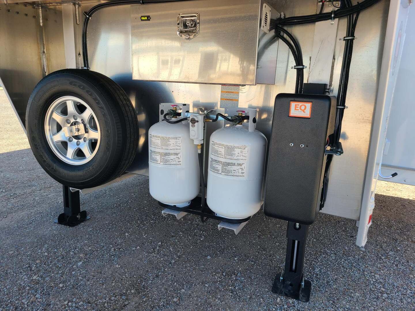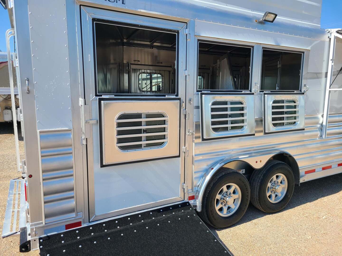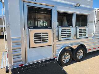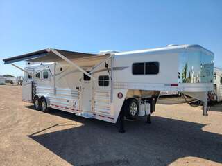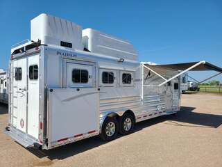 THIS TRAILER IS ON ORDER AND WILL ARRIVE IN DECEMBER Platinum Coach 3 Horse 10’8” SLIDE OUT WITH SIDE LOAD!! Platinum Coach Features: 8’ wide x 27’ long x 7’6” tall 6’5” slide out with 72” sofa inside 7200# axles blocked 2”, 14 ply tires, aluminum wheels Side load configuration...HUGE TACK ROOM!! 52” tall spring loaded side ramp leading to 4’ stall Plenty of blanket bars, brush trays, and hooks in tack room!! 6’ hay pod with generator box on landing Two mangers, two access doors Drop down windows on head and hip Drop down window bars on head side Flow through and spring back dividers Stud divider with rubber on first stall Double aluminum battery box 3 outside LED load lights     Outlaw Conversion Features: 10’8” Proline XP living quarter with Dark Alder Ebony wood 72” sofa sleeper Onan 4.0 generator on roof with 9 gallon fuel tank Single leg hydraulic jack 6.0 propane / electric refrigerator Power awning with awning lights 28” LED TV on arm Microwave over kitchen sink AM/FM/CD/DVD player with exterior speakers 15,000 BTU A/C with heat pump 20,000 BTU furnace 6 gallon water heater, 12vDC or 120vAC Two hat racks over door 30# propane bottles x 2 While we believe all information on this website to be accurate, please confirm features and price with a salesman.