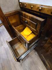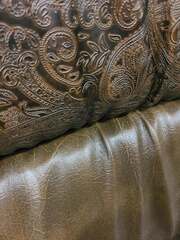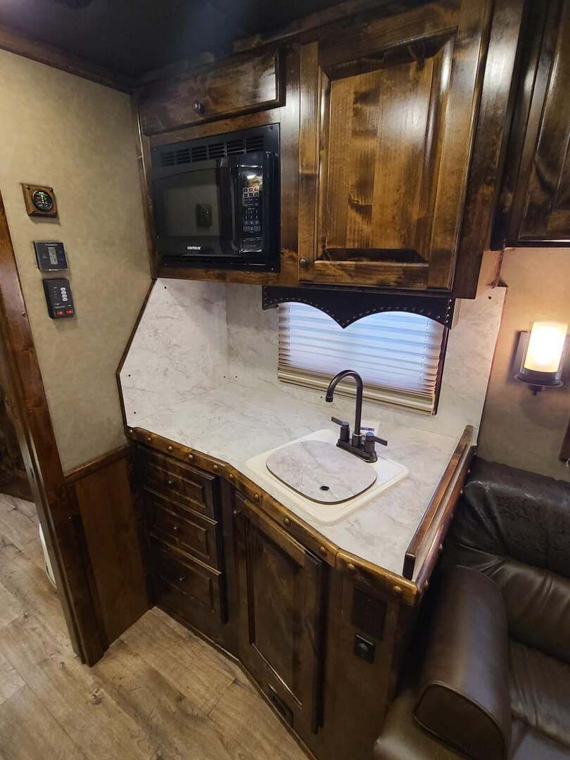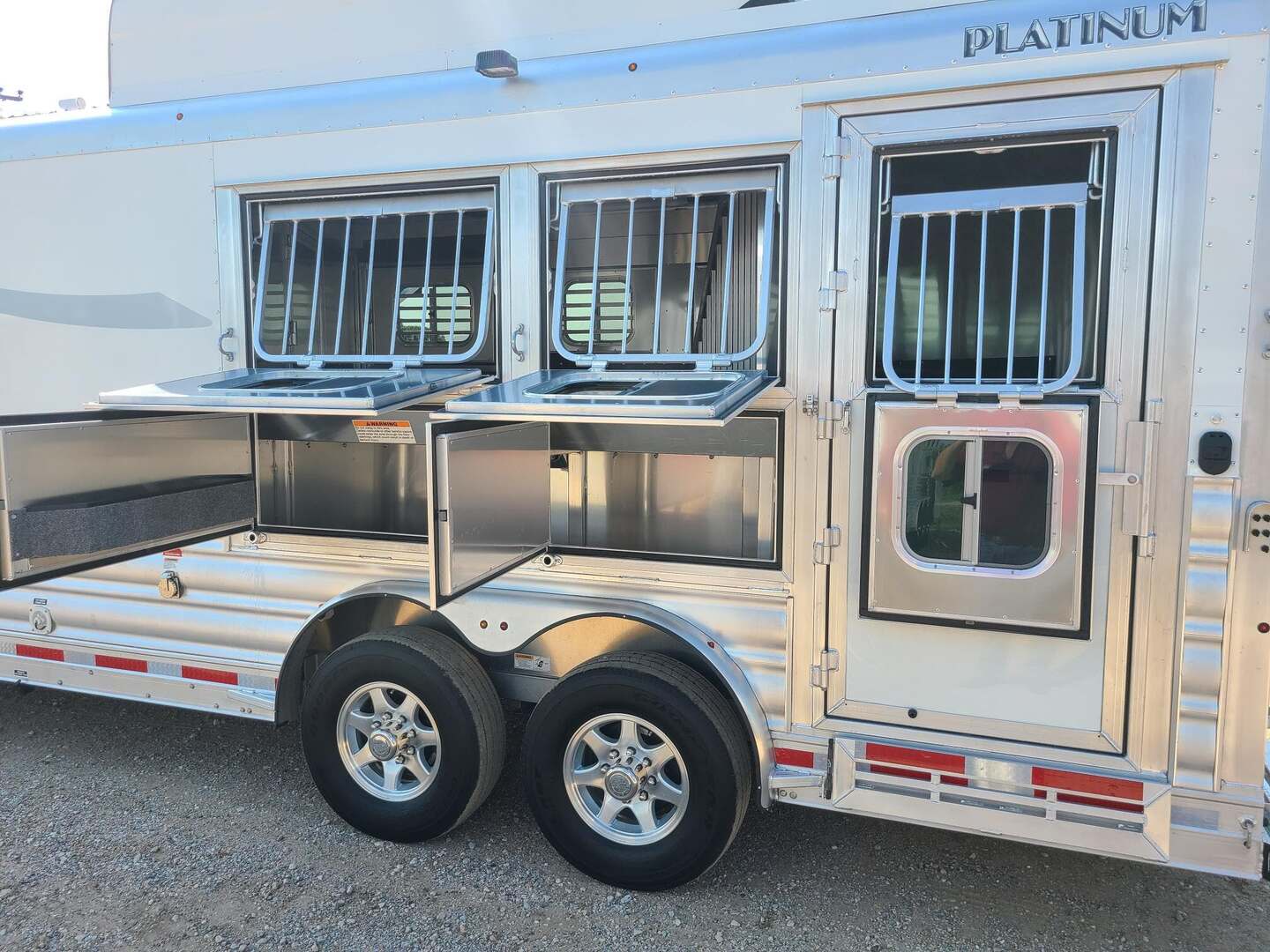 Platinum 3 Horse 12’10” Reverse Load Couch & Corner Bench Proline XP by Outlaw Conversions features: Onan 4.0 MicroQuiet generator Ebony Alder Brio wood with Custom Cabinetry 15,000 BTU A/C with HEAT PUMP 72” sofa sleeper with tooled leather top roll Corner bench across from sofa 6.0 propane / electric refrigerator 20,000 BTU propane furnace 6 gallon 12VDC / 120VAC water heater 60 gallon fresh water tank 24” LED Smart TV on arm AM/FM/CD/DVD player with 2 exterior speakers Power awning with cover Single leg hydraulic jack Double 30# propane bottles Microwave over kitchen sink 32” radius shower with power vent above Large vanity next to shower Porcelain toilet in front of large closet Platinum Coach features: 8 x 28 x 7’6” tall 8000# axles, 14 ply tires on aluminum wheels Blocked axles, and raised neck for great ground clearance Full width rear tack, tons of tack accessories Stud divider on first stall with rubber on both sides Break divider on load divider Two mangers, two access doors Escape door on first horse Drop down windows on head & hip Flow through dividers 6’ enclosed hay pod for extra storage Onan 4.0 generator mounted in gen box behind pod 5 lights on top rail, all round LED 3 LED load lights