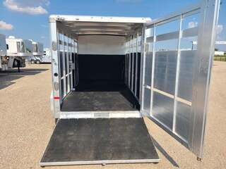 2018 Sundowner 16’ Stock Combo 6’9” wide x 16’ long x 7 tall 4’ dressing room with 3 saddle racks & hooks 54” front section, 88” rear section Full width spring loaded rear ramp Single gate at rear Black aluminum wheels & 14 ply tires 5200# AXLES
