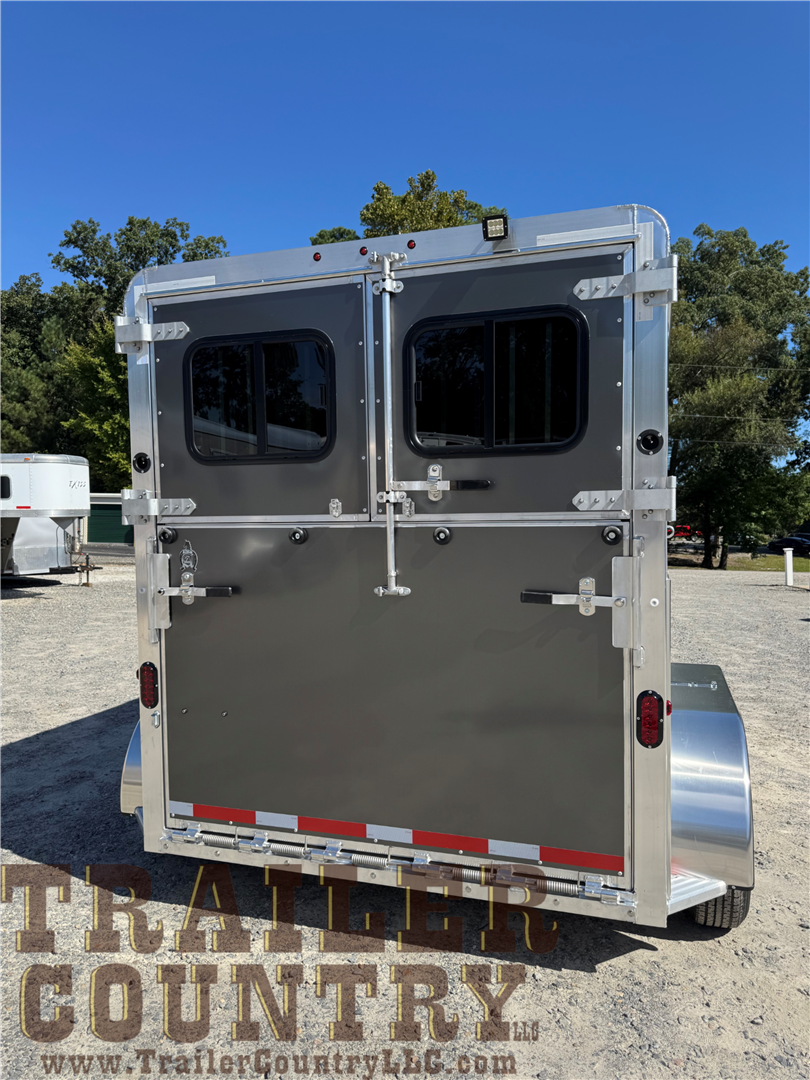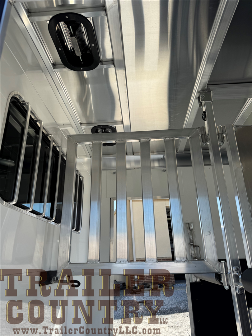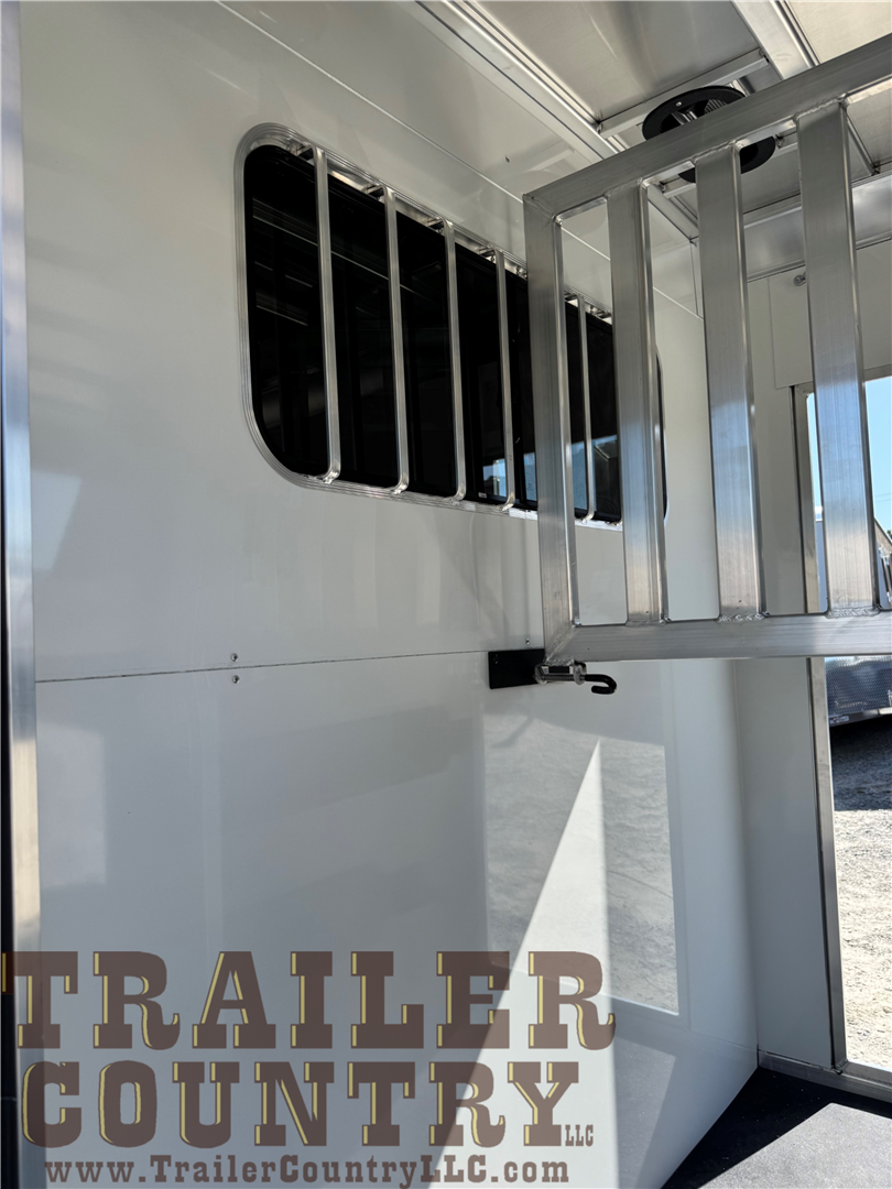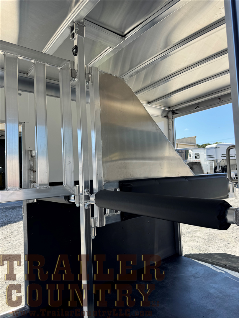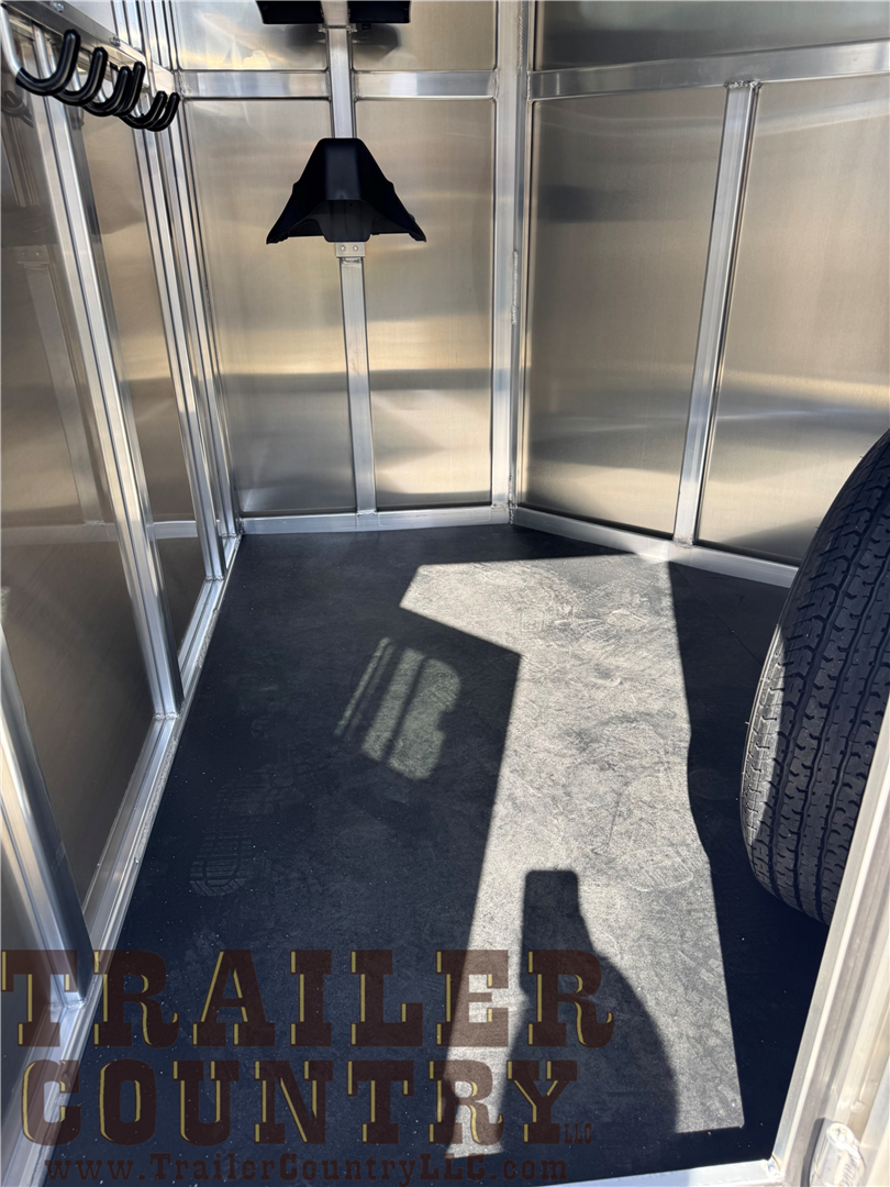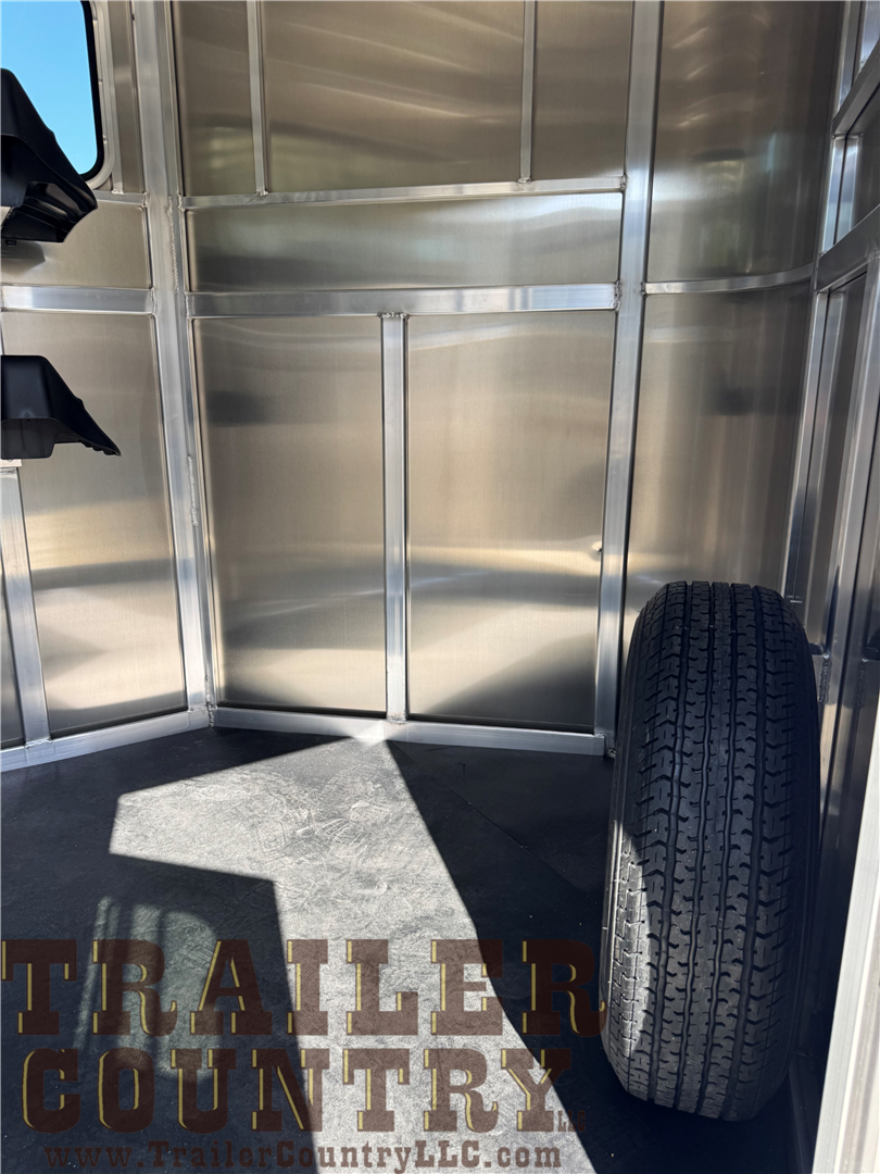 - 4' dressing room with upgraded DALTON door with sliding window, sliding window over the saddle racks, two saddle racks, bridle hooks, spare tire mounted in dresser, rubber mats on dresser floor
