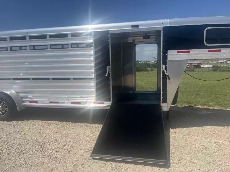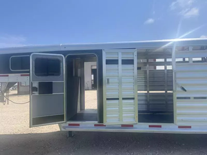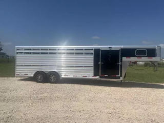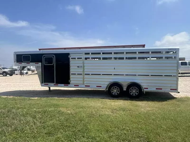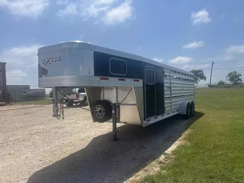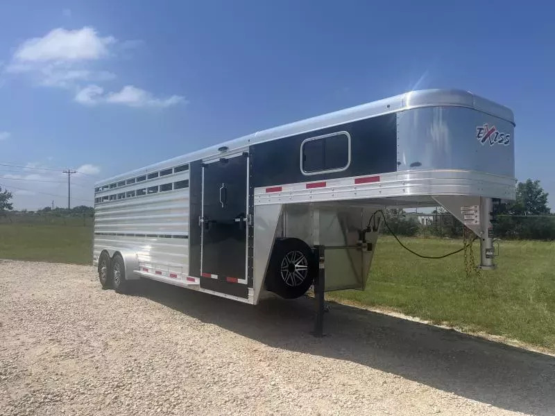2025 Exiss Express STC 6824 - 24’ Stock Combo with 6’ Tack Room *Built tough with a sleek, blacked-out look, this 2025 Exiss Express STC 6824 is ready to haul horses, cattle, or both with confidence.* *At 6’8” tall and 24’ long, this all-aluminum stock combo trailer features a spacious 18’ livestock area and an upgraded 6’ dressing room/tack space-perfect for multi-purpose use.* Key Features: SIDE RAMP * All-Aluminum Construction with interlocking plank floor and .050 black side sheets * 18’ Stock Area with full swing center gate and rear gate with slider * 6’ Tack Room with 48” W side entry ramp, camper door, halter hooks, carpeted nose, and LED lighting * (2) Load Lights for safe loading in low light * Windows in Gooseneck, stainless nose sheet, and full-length running boards for added functionality and style * Rubber Mats throughout stock and tack areas * Exterior Tie Rail on both sides * Two Air Gaps with Plexiglas tracks for customizable airflow This trailer rides smooth on (2) 7,000 lb. torsion axles, five aluminum wheels, and includes a spare tire. Perfect for versatile haulers looking for comfort, durability, and looks. Available now at Rolling M Trailers in Jarrell, TX Call 512-746-2515 for more info *Financing & Delivery Available*