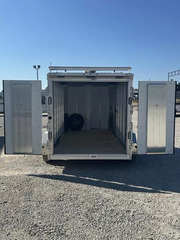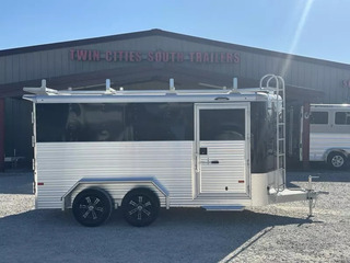 NEW 2026 Sundowner 16’ Contractor Enclosed Cargo Bumper Pull 16’L x 7’T Cargo Area - 2 interior LED load lights, double rear doors, (2) 18”W x 5’7” ramps, ramp storage on rear doors. Other Features - top wind tongue jack, LED clearance lights, black aluminum skin, black aluminum wheels, spare tire with matching wheel, 48” aluminum wave panel, 36” side entrance door, step below side door, LED porch light, roof ladder rack with rear roller, fixed ladder on the nose, 24” nose gravel guard, rear roof spoiler with 3 LED surface lights. Trailer comes with full factory warranty! Financing options with rates as low as 6.49% WAC - Nationwide delivery available Call our sales department at 940-365-9919 After hours calls/texts 612-381-6782
