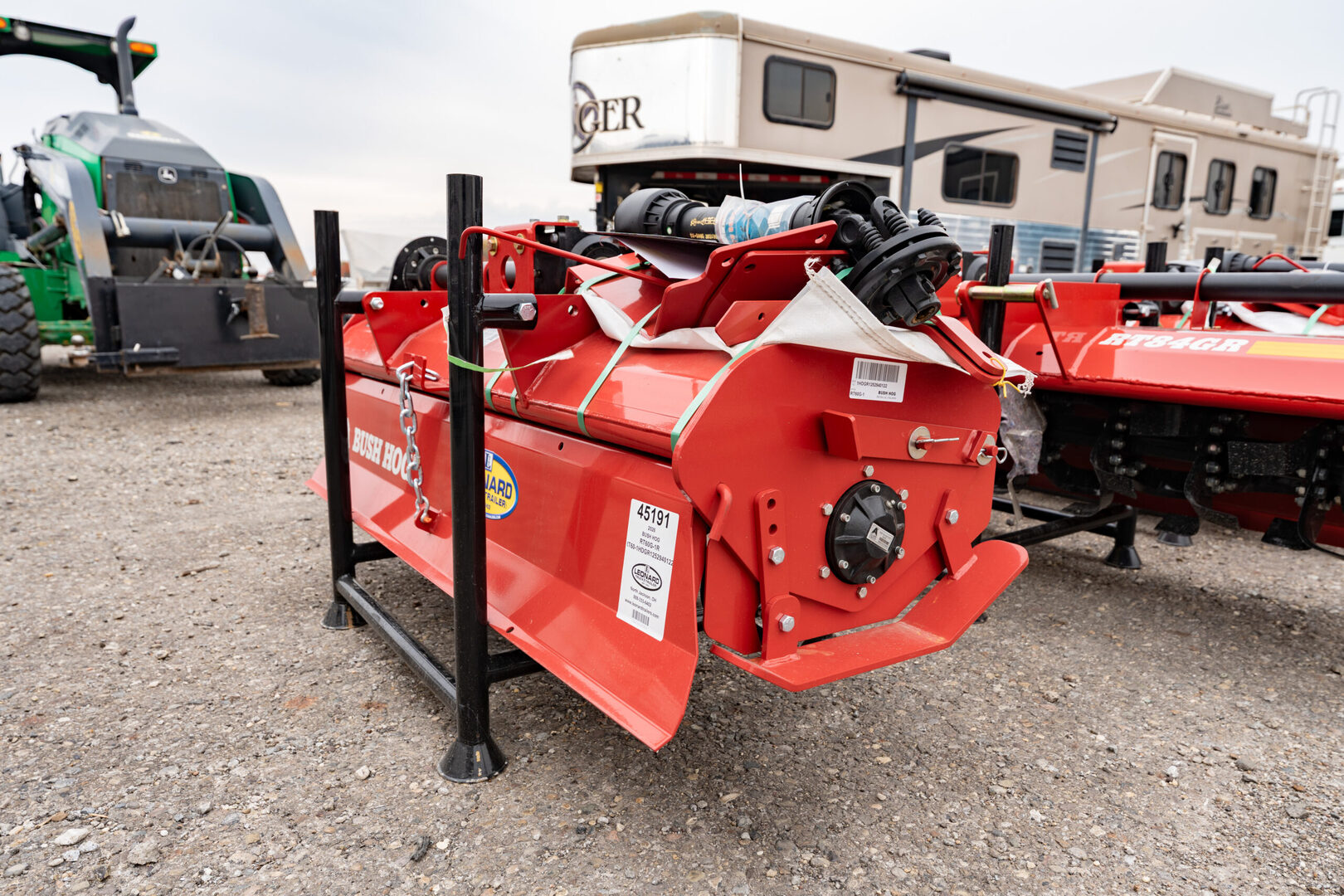 View Inventory: https://leonardtrailers.com/inventory/45190 Stock #45190 New Bush Hog RT60G-1R Rotary Tiller Attachment Unleash efficient and precise tilling performance with the Bush Hog RT60G-1R! Designed for versatility and durability, this gear-driven rotary tiller delivers professional-grade soil preparation for gardens, landscaping, and agricultural use. Key Features: Working Width: 59” for wide, efficient coverage in each pass Drive System: Gear-driven for optimal power transmission and consistent performance Hitch Compatibility: ASAE CAT 1 (standard & quick hitch ready) for easy connection Blades & Flanges: 7 flanges with 6 blades each for thorough soil pulverization Rotor Specs: 17” rotation diameter and 3” shaft diameter for added strength Rotor Speed: 211 RPM for consistent tilling results Tilling Depth: Up to 6” for ideal seedbed preparation PTO Driveline: ASAE CAT 4 with slip clutch protection Weight: Approx. 673 lbs for stability and solid ground contact Tractor Compatibility: 25–45 PTO HP range Why Choose Bush Hog: Rugged build for long-term reliability Smooth and precise soil finish Easy attachment and detachment Ideal for homeowners, landscapers, and agricultural professionals We offer flexible financing, accept trades, and provide nationwide no-hassle delivery! Call (888) 333-6613 for details. Specifications are believed to be accurate. Please verify with a sales associate prior to purchase. Stock Number:45190