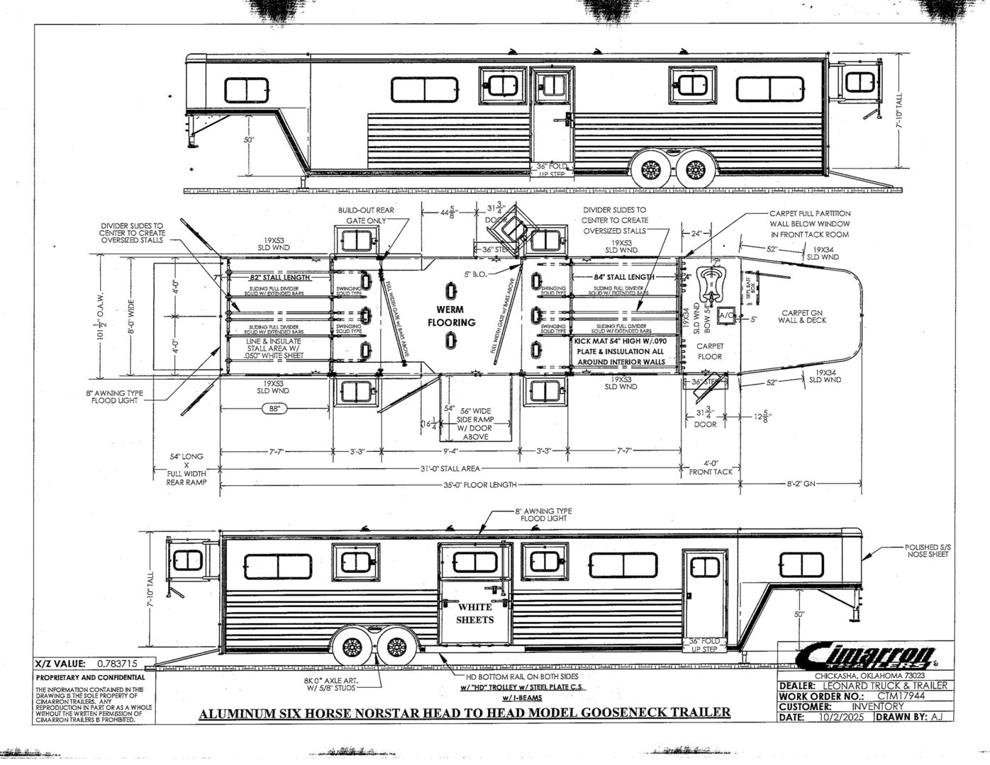 View Inventory: https://leonardtrailers.com/inventory/45211 CIMARRON NORSTAR 6 HORSE HEAD TO HEAD GOOSENECK SUPER DUTY, WITH 4’ DRESS. 8000# DEXTER TORFLEX AXLES, HYD DISC BRAKES, 17.5” WHEELS, CLEARANCE LIGHTS, AWNING FLOOD LIGHT, SIDE ACCESS DOOR W/DROP DOWN FEED DOOR, FOLD DOWN FEED DOOR W/SAFETY BAR GRILL FOR HEAD SIDE, WINDOW SLIDER 15X22 STALL AREA, GATE STUD BARS ABOVE, RAMP 60” W W/DOOR ABOVE RAMP, BOISTER PAD 6” CHEST/BUTT BAR, FLIP-UP TWO WAY TYPE STALL VENT, STEP FOLD UP 12”X36” SIDE DOOR, RECESSED SADDLE RACK POST ONLY, RESTRAINT BAR CHEST/BUTT BAR, WINDOW 19X53 SLIDER, STORAGE RACK FOR BUTT/CHEST BAR AND CARPET UNLINED WALLS. Stock Number:45211