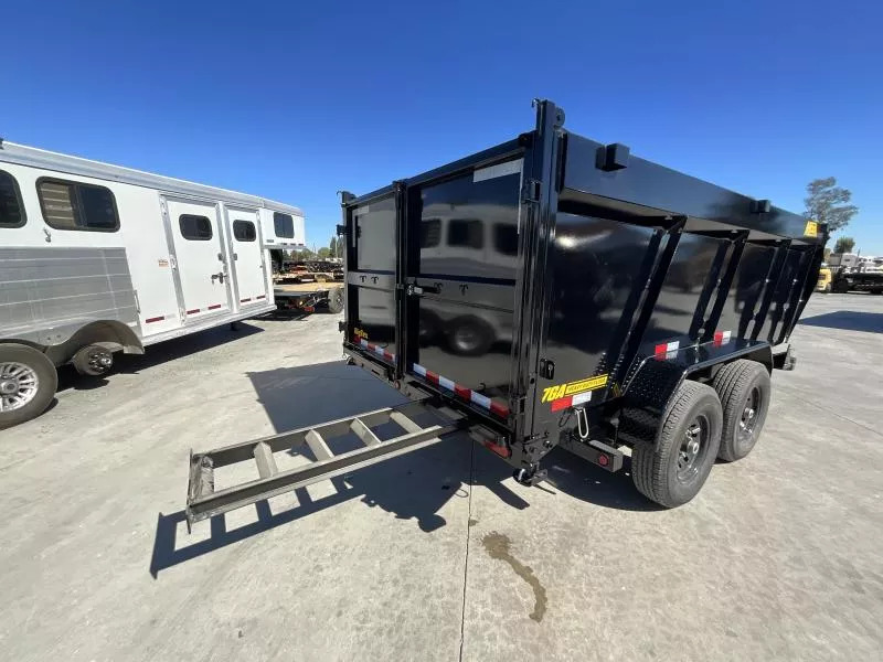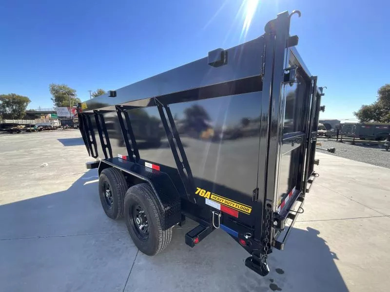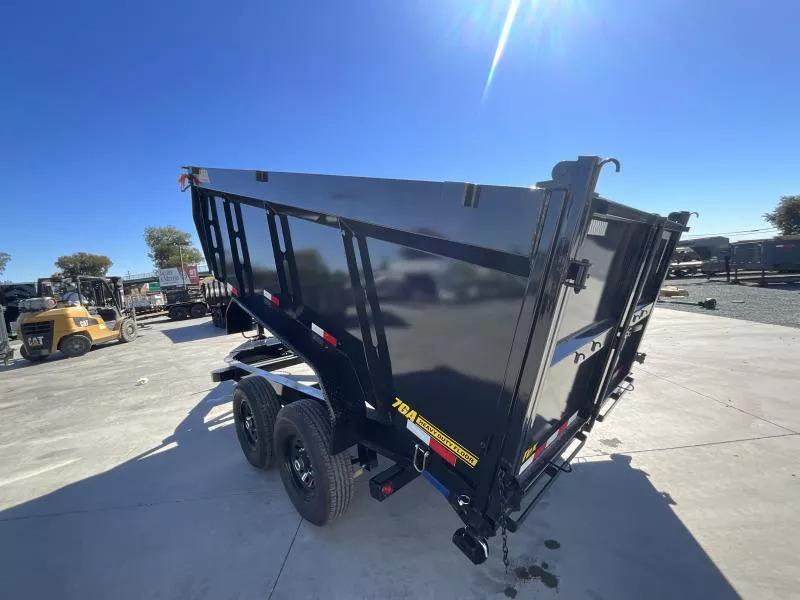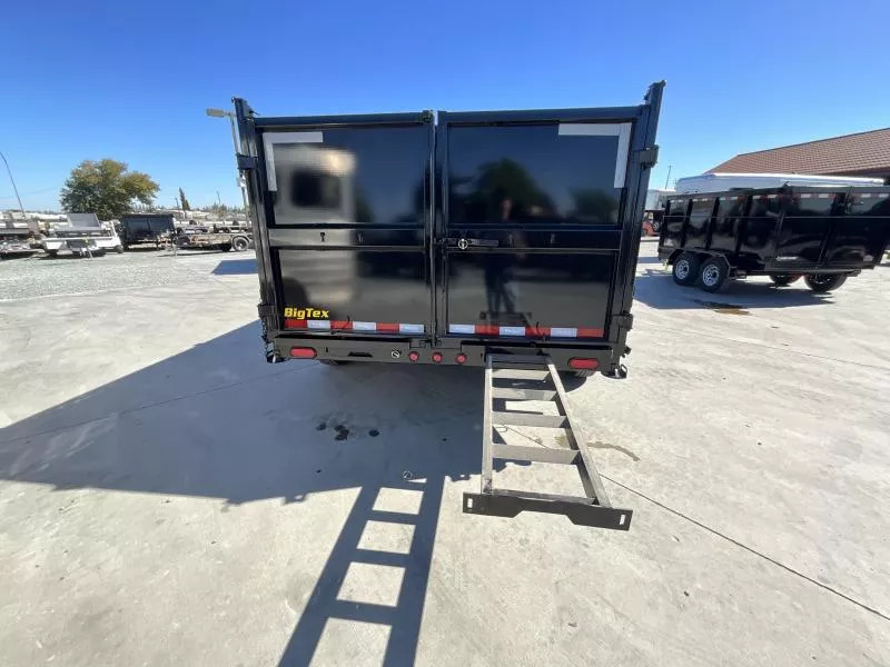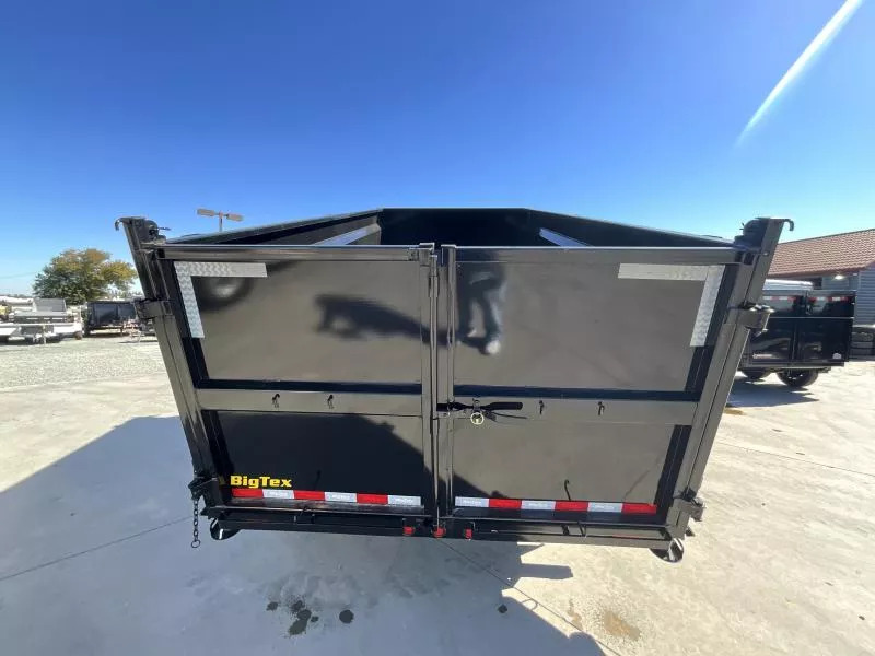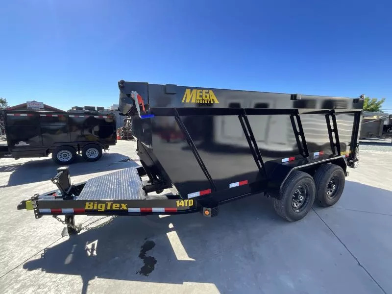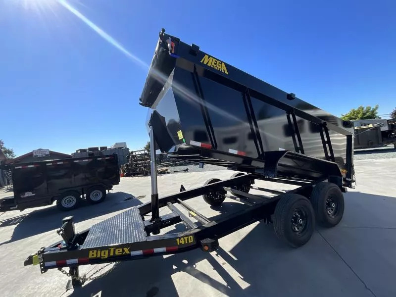 NEW Big Tex Trailers 14TD-14C4A 7X14 15.4K GVW Dump Trailer The 14TD makes unloading large, bulky cargo or debris a snap. Advanced engineering and a class-leading 12-ton telescopic cylinder make the lift smoother and more efficient. 83” X 14’ heavy duty telescopic dump GVW: 15,400 LBS Empty weight: 4,576LBS 6’ slide in ramps 4’ Sides Standard features: | AXLE | (2) 7,000# Axles w/ Quick Lubricating Hubs and Elec. Brakes | JACK | 12,000# Side Wind Drop Leg | TIRE | ST235/80 R-16 Load Range E | FLOOR | 7 Gauge Smooth Steel | WHEEL | Black Mod, 8 Bolt | FINISH | Superior Quality Finish is Applied for a Highly Decorative and Protective Finish. | LIGHTS | Recessed, Grommet-Mounted L.E.D. Lighting | TONGUE | Integral with Frame (8” I-Beam, 13#) | COUPLER | Adjustable 2-5/16” 18,000# Demco EZ Latch | FENDERS | 9” x 72” 14 Ga. Diamond Plate Double Square Broke | ELEC. PLUG | 7-Way RV | MAIN FRAME | 8” I-Beam, 13# | SUSPENSION | Multi-Leaf Spring w/Equalizer | FINISH (Prep) | Steel is Cleaned to Ensure a Professional Smooth Finish. | SAFETY CHAINS | 3/8” Grd. 70 w/Safety Latch Hook (2 each) | BED CROSSMEMBERS | 3” Channel, 16” Centers | DUMP BODY TOP RAIL | 3” x 2” Rectangular Tubing | G.A.W.R. (Ea. Axle)| 7,000# The 14TD also comes equipped with: * Adjustable 2-5/16” Demco EZ Latch Coupler * 8” I-Beam Frame w/ Fold Back Wrap Tongue * 12,000# Side Wind Drop-Leg Jack * (4) D-Rings Inside Bed to Secure Equipment * 36” Tall Sides * 10 Gauge Steel Floor and Sides * Fully Formed Tarp Shroud on Front * Crank Style Roll Tarp- Standard Equipped * Tarp Rod Included to Secure Tarp on Rear * Power Up/Gravity down Hydraulic Pump * 12-Ton 3-stage Telescopic Cylinder * 12V Interstate Deep Cycle Battery * 110V On-Board Battery Charger (5 Amp) * Cambered Axles w/ EZ Lube Hubs * Forward Self Adjusting Electric Brakes on All Hubs * L.E.D. Lighting Package * Sealed, Modular Wiring Harness * Diamond Plate Fenders * 3” x 2” Rectangular Tubing Top Rail on Dump Bed * Rear Stabilizer Stands * Spare Tire Mount * Radial Tires While we always strive for complete accuracy, please confirm specifications with one of our sales reps.