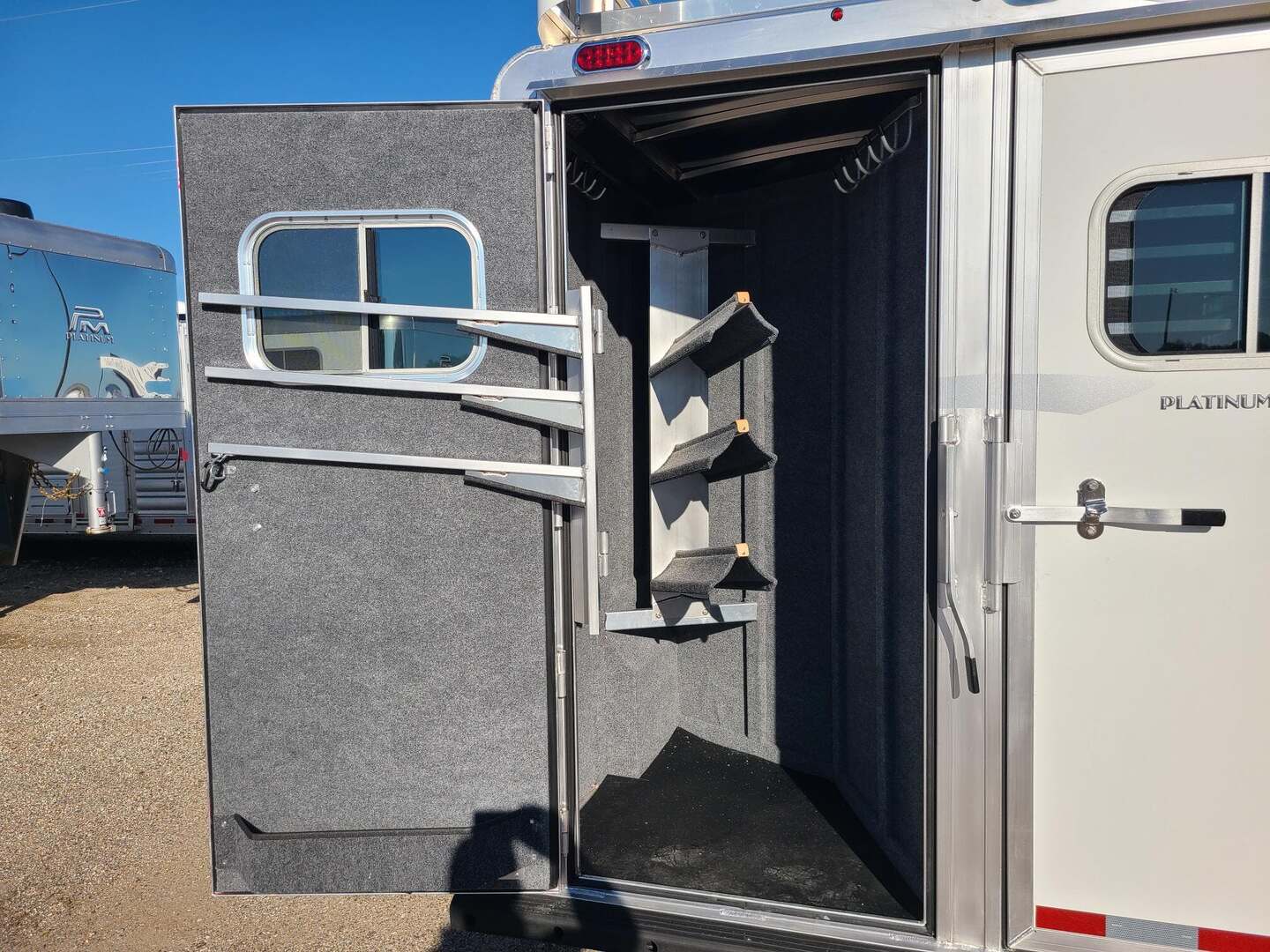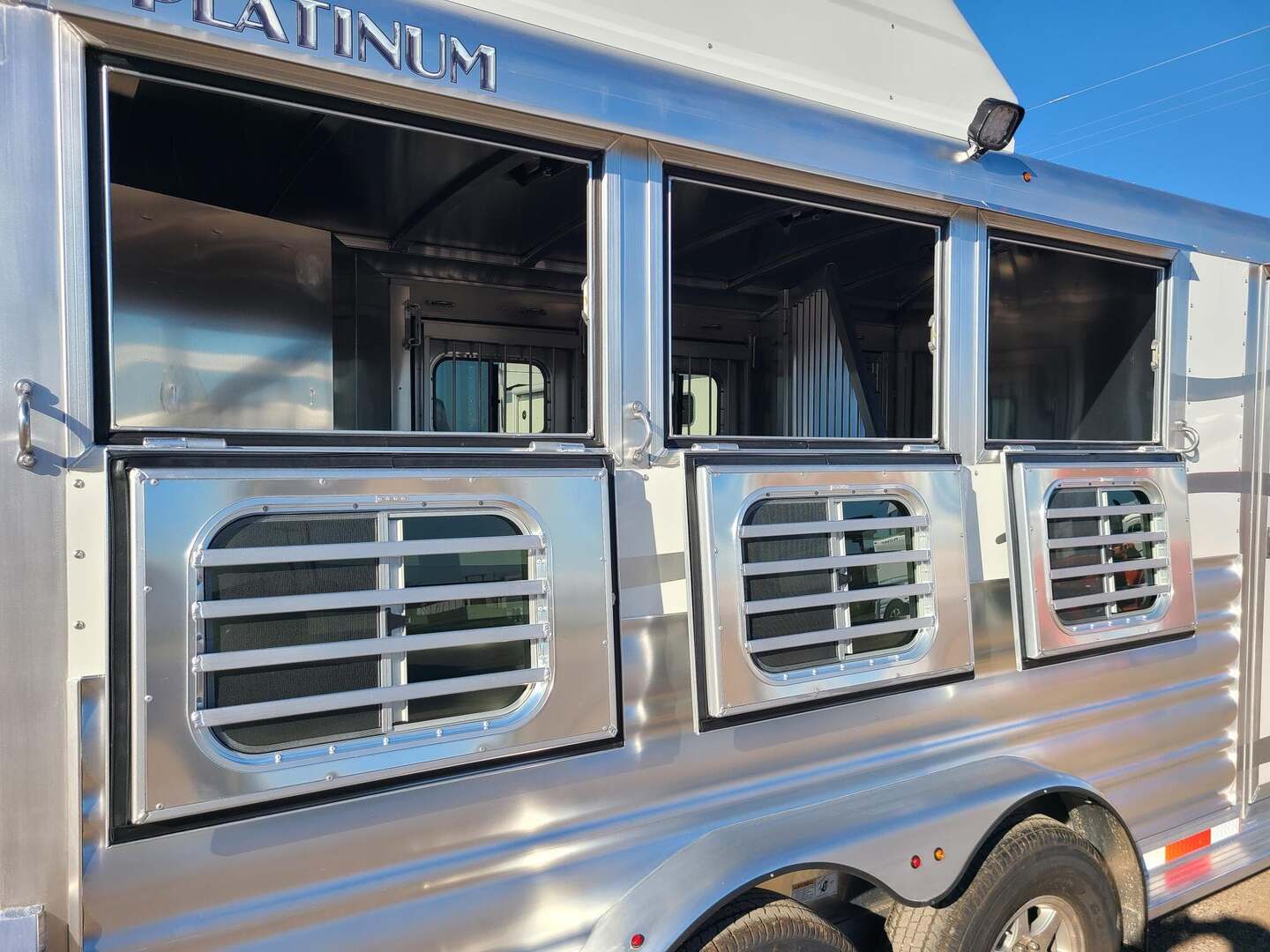 Platinum Coach 3 Horse Bumper Pull 7’6” wide 7 tall 15’ long Extended tongue to be pulled behind motorhome!! Aluminum mag wheels 6’ hay rack and ladder Two mangers with escape door on first horse Drop down windows on head/hip Drop down window bars Flow through dividers for more air flow Carpeted rear tack 3 tier swing out blanket bar Carpeted bulkhead wall with 10 bridle hooks Baby panel on first divider