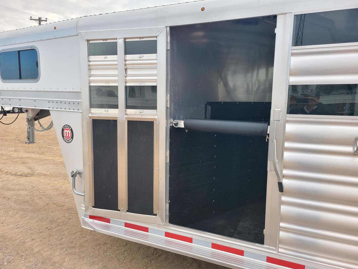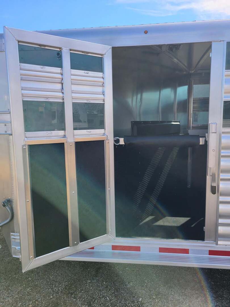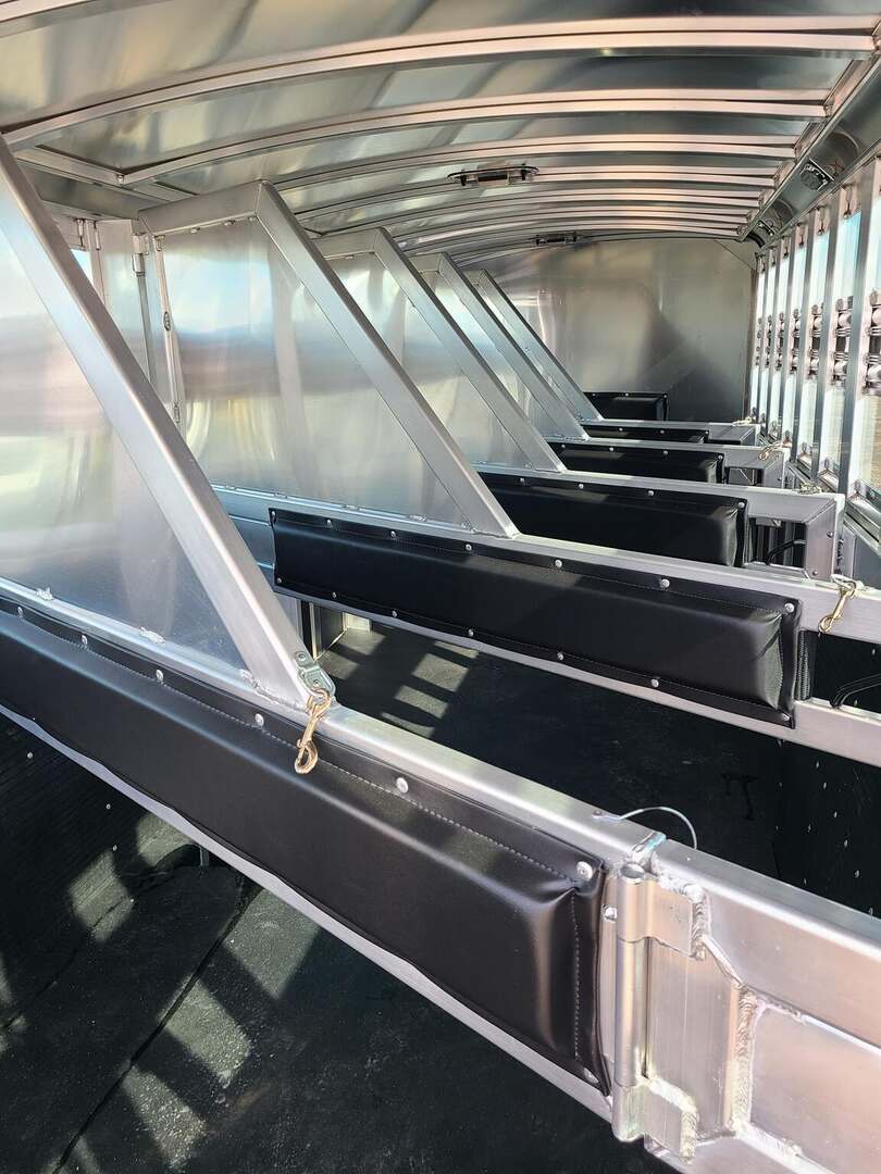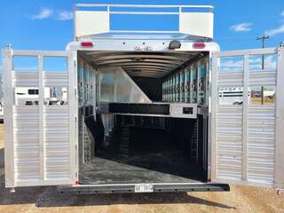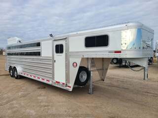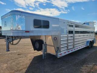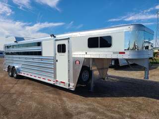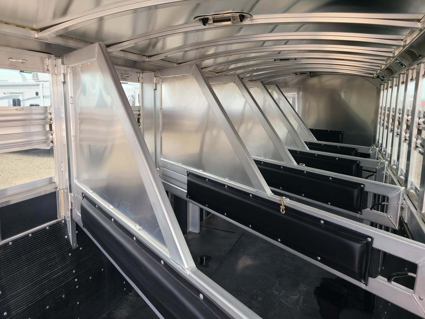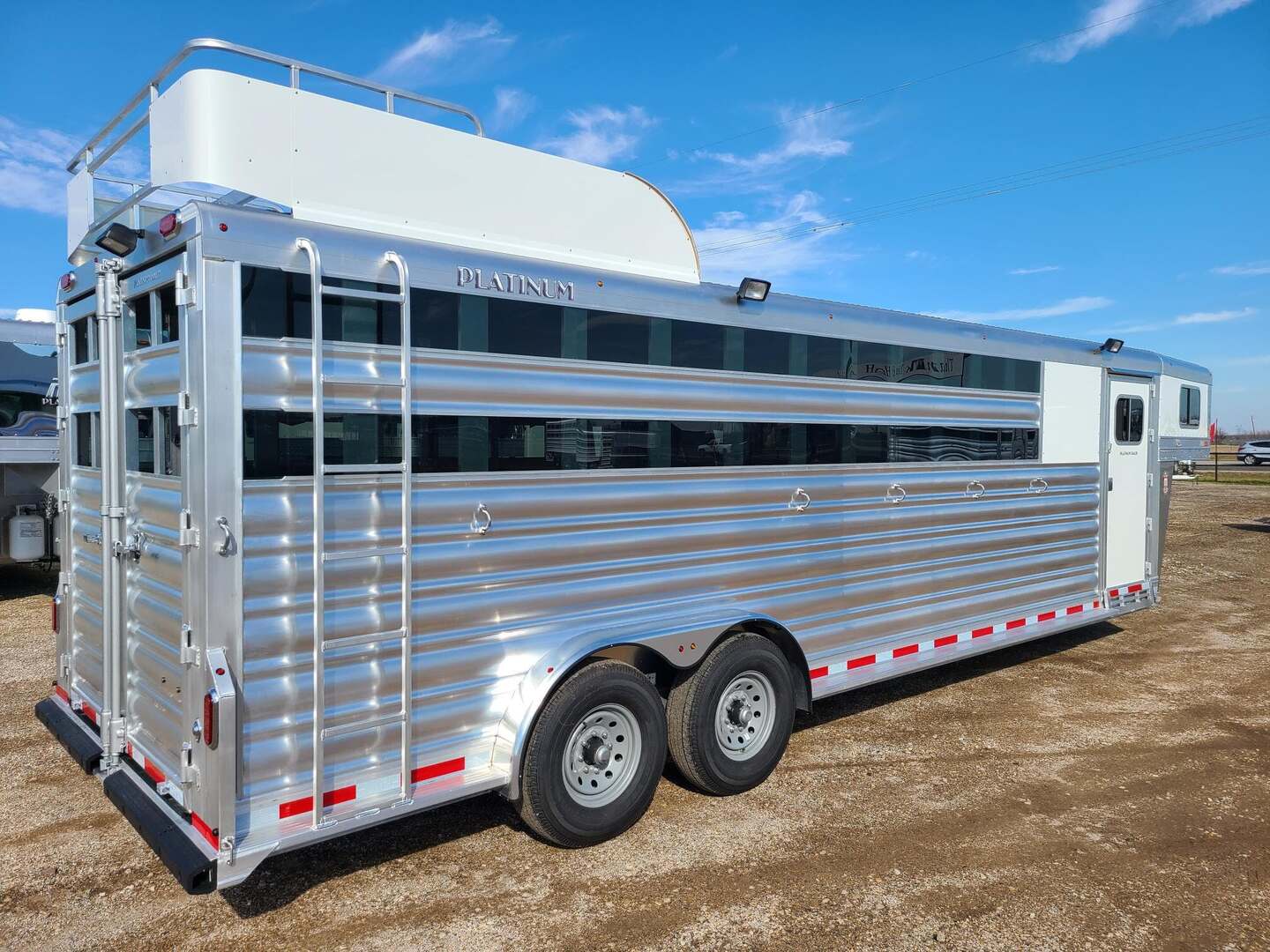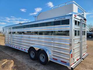 Platinum 6 Horse Stock Combo 7’6” wide x 26’ long x 7 tall 3’ short wall dressing room with 6 saddle racks and 4 blanket bars Carpet on bulkhead wall with 20 hooks Two brush trays on tack door Floor mats running entire trailer floor length 5-39” stalls and one 81” stall head side at rear Double rear gates 6’ hay rack and ladder 3 roof vents Rubber on side walls 4 outside halogen load lights Plexiglas & track on sides Stock escape door Stainless steel nose 7,000# axles with 10 ply tires