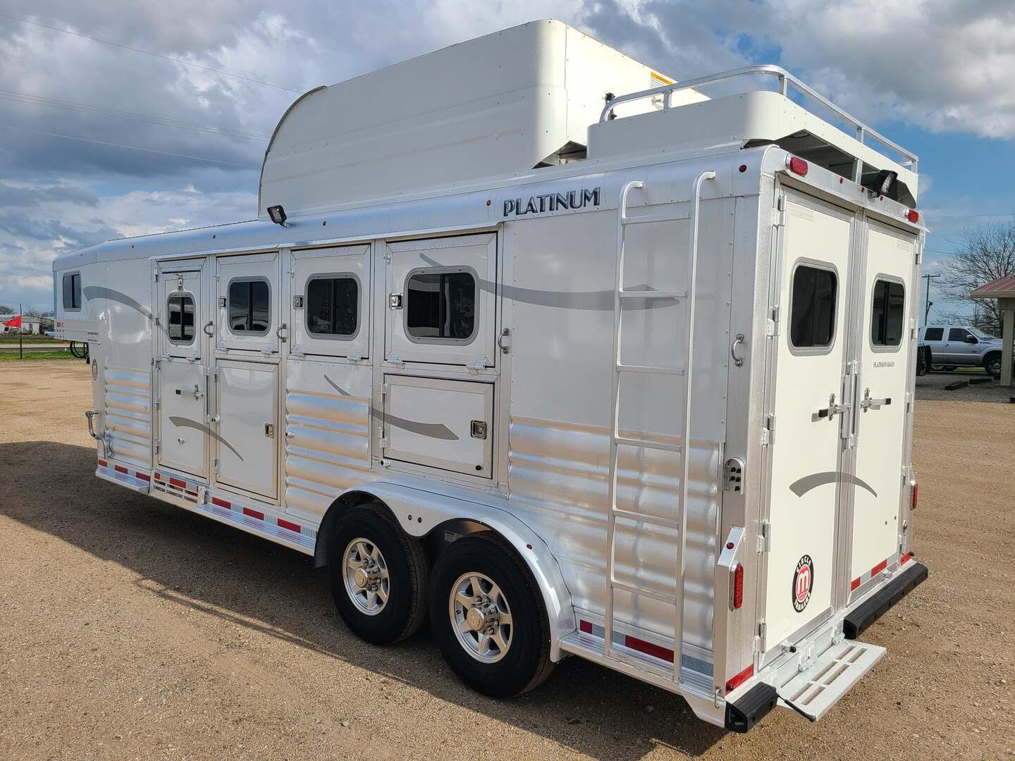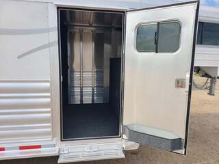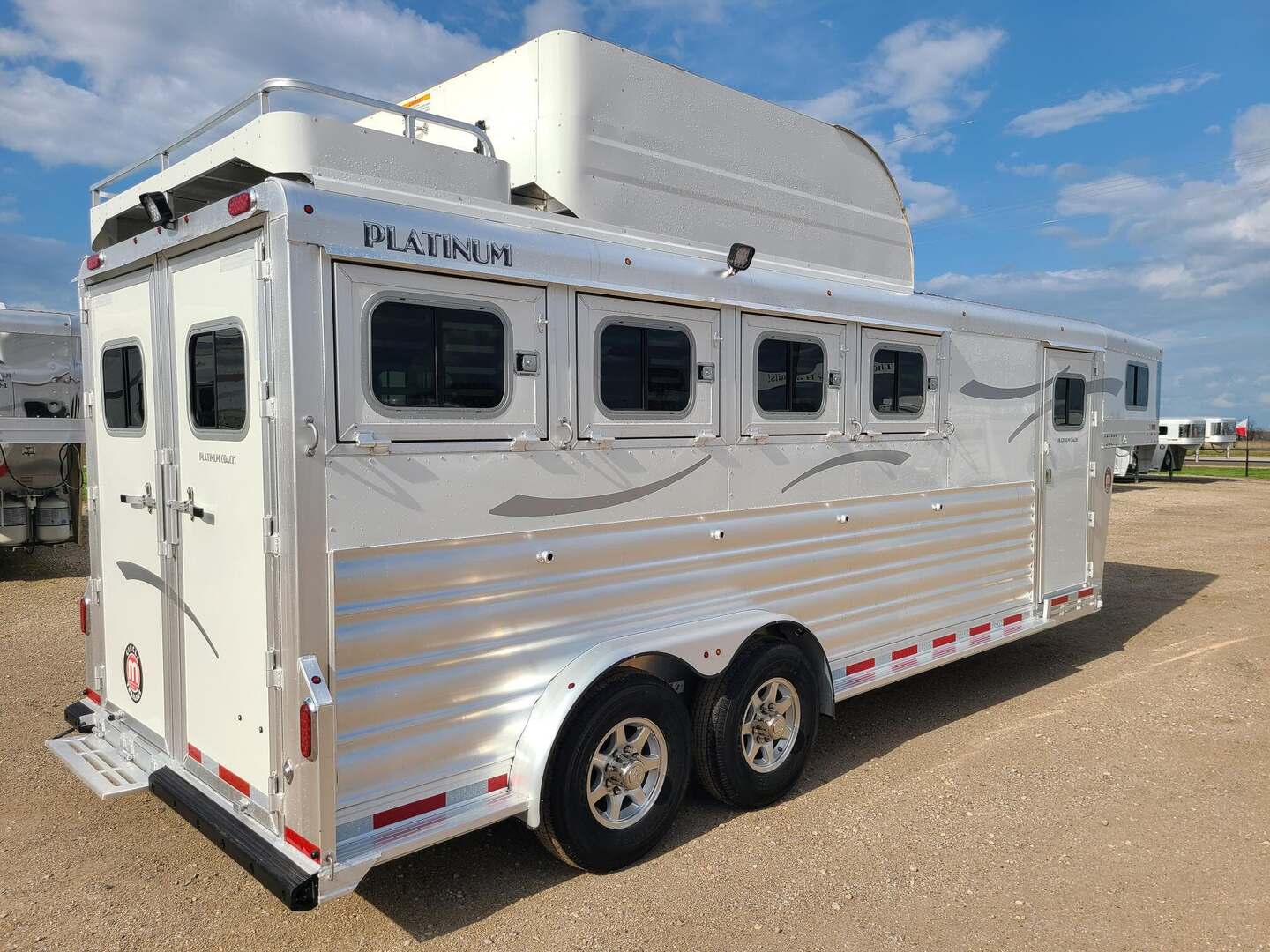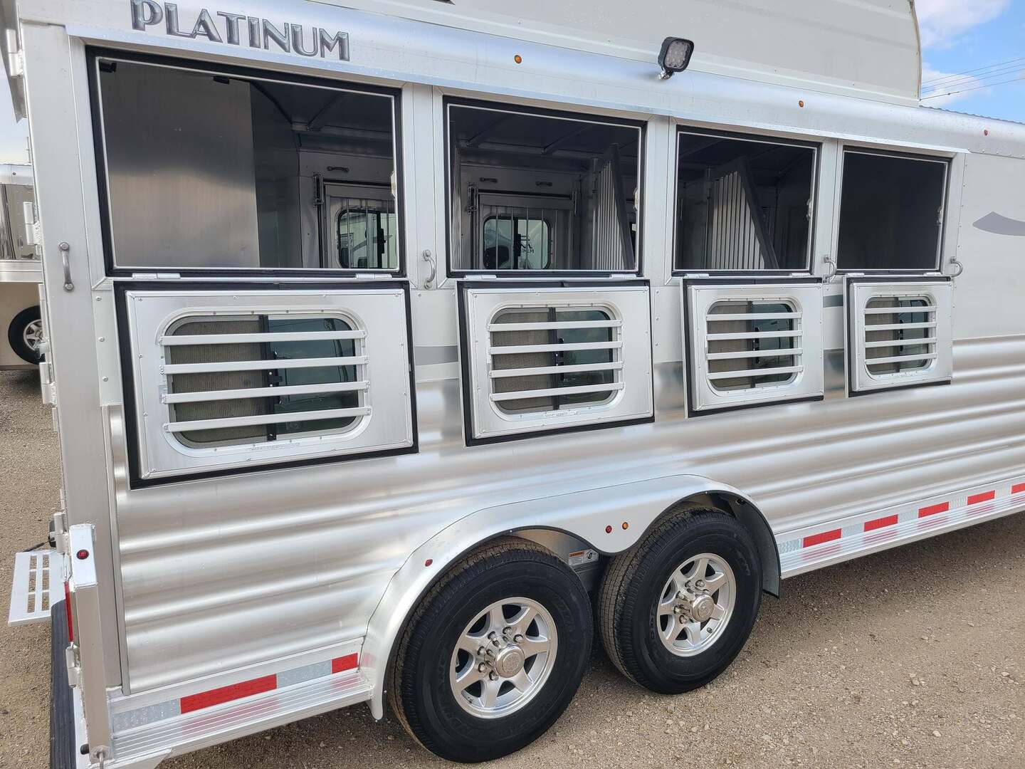 Platinum Coach Features:  4HGN w/ 4’ SW dressing room 7.5 wide x 21 long x 7 tall 6’ haypod with 3’ landing and ladder on driver side Electric brakes 7000# axles 235/80R 16E 10 ply tires Mag aluminum wheels 50/50 rear doors w/ windows Manger access doors Escape door at head w/ drop window and feed bag Flow through dividers Removable baby panel Pads on dividers and manger fronts 8 inside tie rings, 8 outside tie rings 4 center-line 2-way roof vents Floor mats in horse compartment Rubber rump and head wall Rubber on bulkhead wall and wheel wells 4 covered saddle racks in rear tack 2 pair of brush trays, one on rear tack door, one on dressing room door 4 swing out blanket bars in rear tack 6 LED dome lights 7 Round LED Lidhts on top rail 3 outside LED load lights 4 drop down windows w/ bars at head 4 drop down windows on hip Stainless steel on nose Carpeted Rear tack with double row of 10 hooks Carpet on bulkhead wall with 10 bridle hooks Steps at tack room door, escape door, and rear tack While we believe all information on this website to be accurate, please confirm features and price with a salesman.