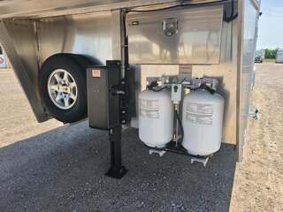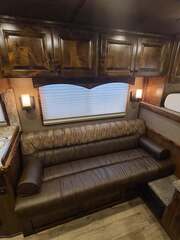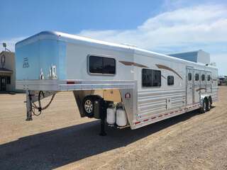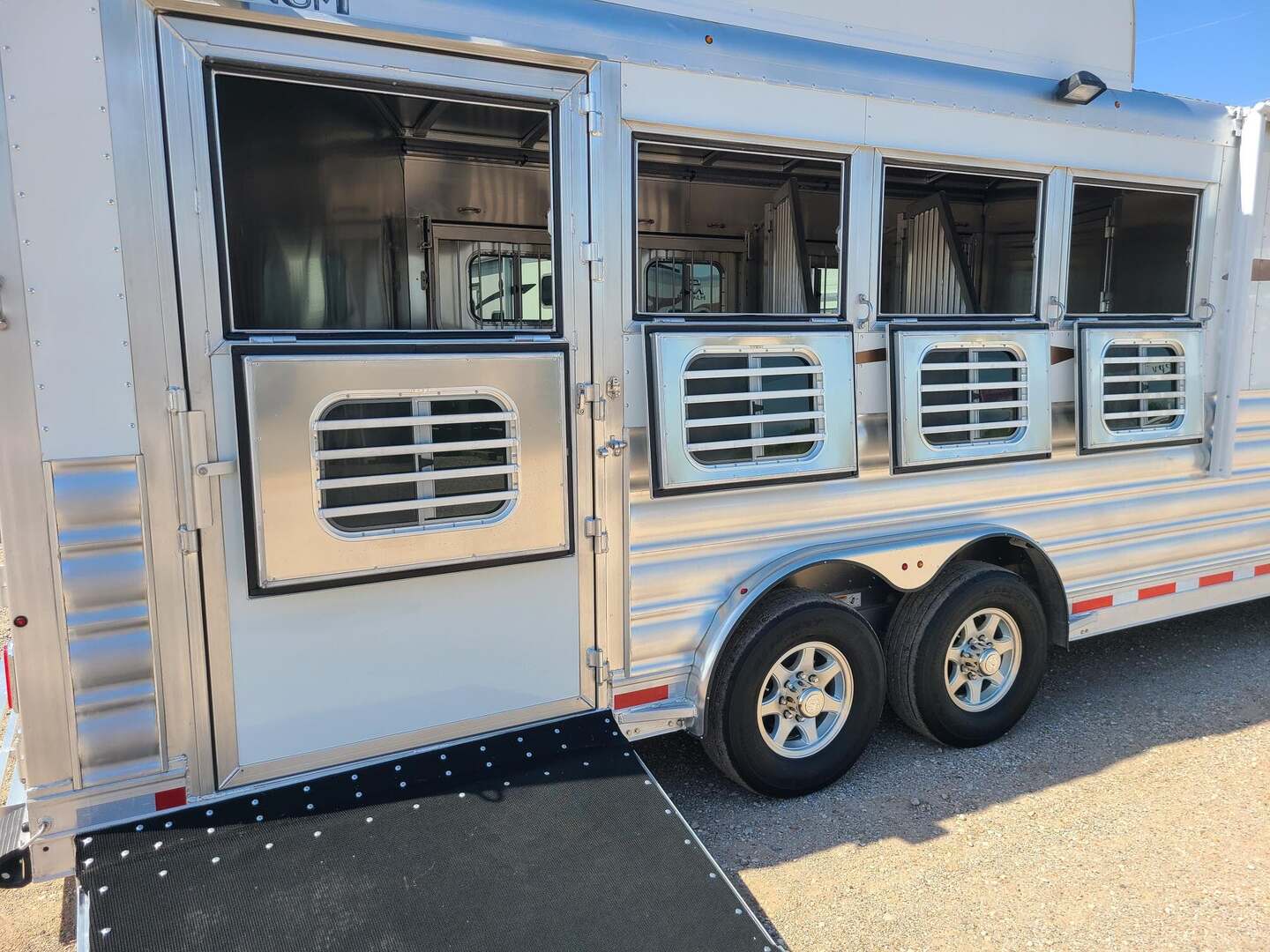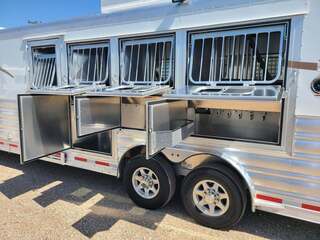 THIS TRAILER IS ON ORDER AND WILL ARRIVE IN JANUARY Platinum Coach 4 horse with 12’ 8” Short wall Outlaw Proline XP Conversions interior SIDE LOAD Outlaw Features: 12’ 8” short wall Dark Knotty Alder raised panel cabinetry Onan 4.0 MicroQuiet generator Hyrdaulic jack 15,000 BTU A/C ducted 20,000 BTU furnace Electric power awning...NICE!!! 6 gallon hot water heater with Propane and 120vAC heat 60 gallon water tank AM/FM/CD/DVD player with 2 interior and 2 exterior speakers 24” LED flat screen on arm 72” sofa sleeper with leather acccent Corner bench with storage below Almond sinks in kitchen and bath 6.0 refrigerator Microwave oven Two burner cooktop Extra wide pocket door to bathroom 32” radius shower with skylight in clear glass Porcelain toilet with foot flush Platinum Coach features: 8 wide x 32’ long x 7’6” tall Full width rear tack, side load 3 mangers with escape door at head Drop down window bars on head side Drop down windows on curb side 6’ hay pod 24” walk through door Baby panel on first divider 2” Blocked axles for additional ground clearance 4 outside halogen load lights 4 tier swing out blanket bar 8,000# axles 14 ply Goodyear tires on Mag Aluminum wheels
