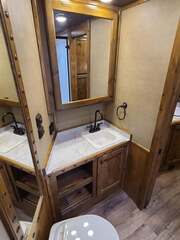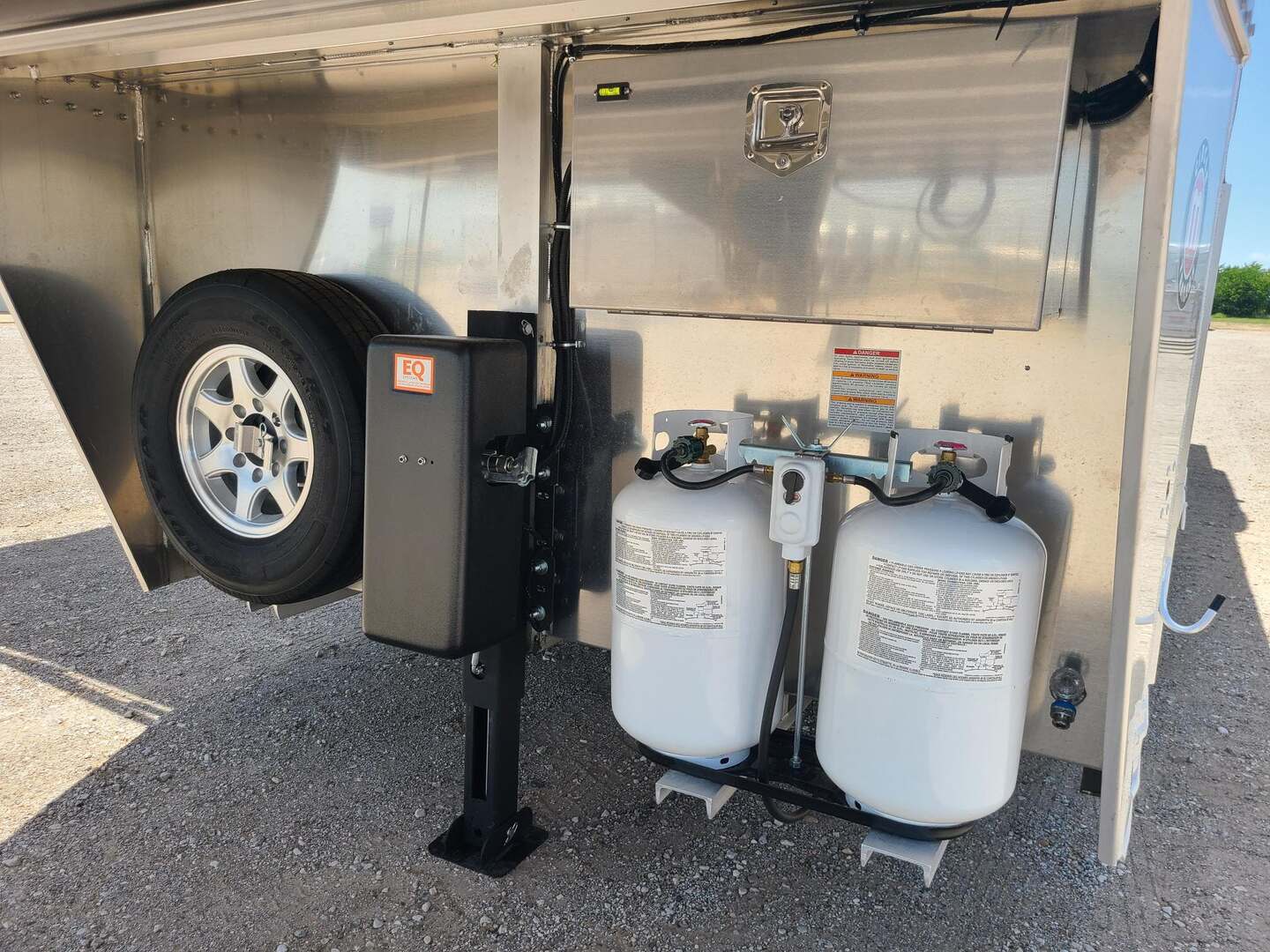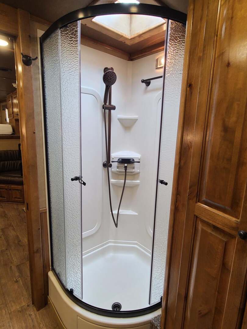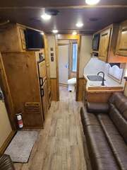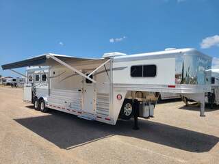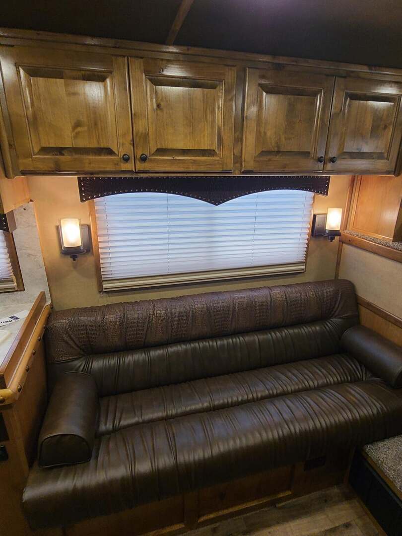Platinum Coach Features:  8 wide x 29’ long x 7’6” tall Side load configuration...storage galore!! 2 mangers, escape door at head Drop down windows head and hip Drop down window bars on head side Stud divider on first stall Telescoping divider on last stall Spring back dividers Hydraulic jack Double aluminum battery box 8,000# axles with 14 ply tires Mag aluminum wheels 6’ hay pod and ladder READY TO ROLL!! Proline XP by Outlaw Features: 12’8” short wall 72” sofa sleeper Corner bench with storage underneath Onan 4.0 MicroQuiet generator 15,000 BTU A/C with HEAT PUMP 6.0 propane / electric refrigerator 6 gallon water heater, 12V DC or 120V AC 20,000 BTU furnace 60 gallon water tank Two sinks, one kitchen, one bath Microwave over kitchen sink 24” LED TV over fridge AM/FM/CD/DVD player and 2 exterior speakers Porcelain toilet 32” radius shower with vent above Walk through door to bathroom and door to horses Power awning over LQ door and passenger side