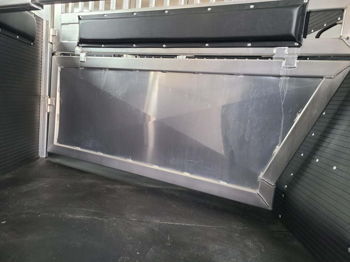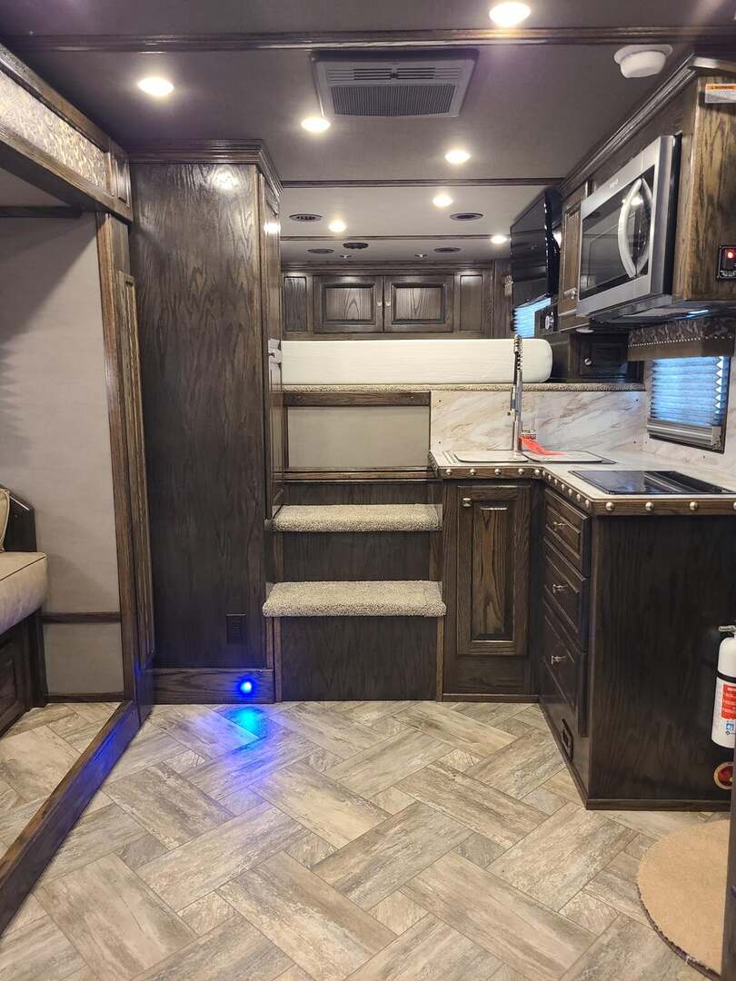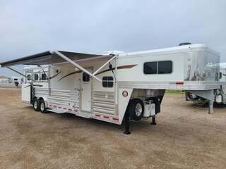 Platinum Coach 3 Horse with 12’ 8” Short wall Outlaw Conversions interior SLIDE OUT with 72” Sofa Sleeper SIDE LOAD Outlaw Conversion Features: 12’ 8” short wall 72” Sofa Sleeper in 6’ ELECTRIC SLIDE OUT Dual-Hydraulic Jacks Oak Ebony Brio cabinetry Wardrobe in nose Onan 4.0 MicroQuiet generator on Platform 15,000 BTU A/C with heat pump 20,000 BTU furnace Electric power awning...NICE!!! 6 gallon hot water heater with Propane heat 60 gallon water tank AM/FM/CD/DVD player with 2 interior and 2 exterior speakers 36” LED flat screen on arm Double stainless kitchen sink & faucet 2 Hardwood hat racks over R/V door 6.0 refrigerator 2 Burner flush glass cover cooktop w/ venthood Microwave oven Extra wide single wall pocket door to bathroom Mirror on back side of single wall pocket door 32” radius shower w/ bronze glass door & skylight Vessel bath sink...beautiful!! Porcelain toilet with foot flush with custom leather on seat Additional Day/Night Shades Platinum Coach features: 8 wide x 29’ long x 7’6” tall 70/30 Rear Doors & SIDE LOAD 2 mangers with escape door at head Drop down window bars on head side Drop down windows on curb side 6’ hay pod & ladder 24” walk through door Baby panel on first divider Flow through dividers 2” Blocked axles for additional ground clearance 3 outside halogen load lights 4 tier swing out blanket bar Flip-down bench seat behind LQ door 8,000# axles 14 ply Goodyear tires on Mag Aluminum wheels