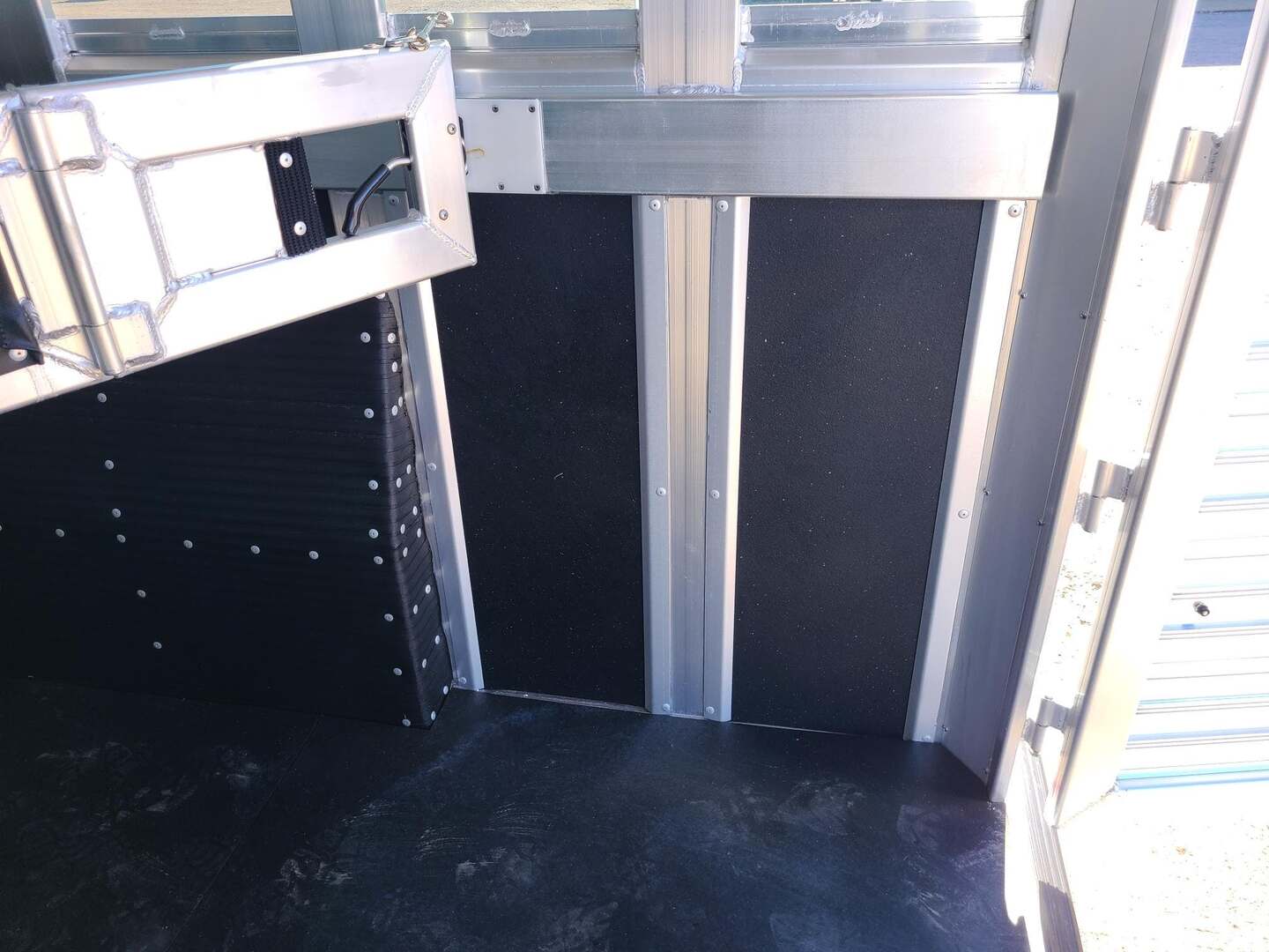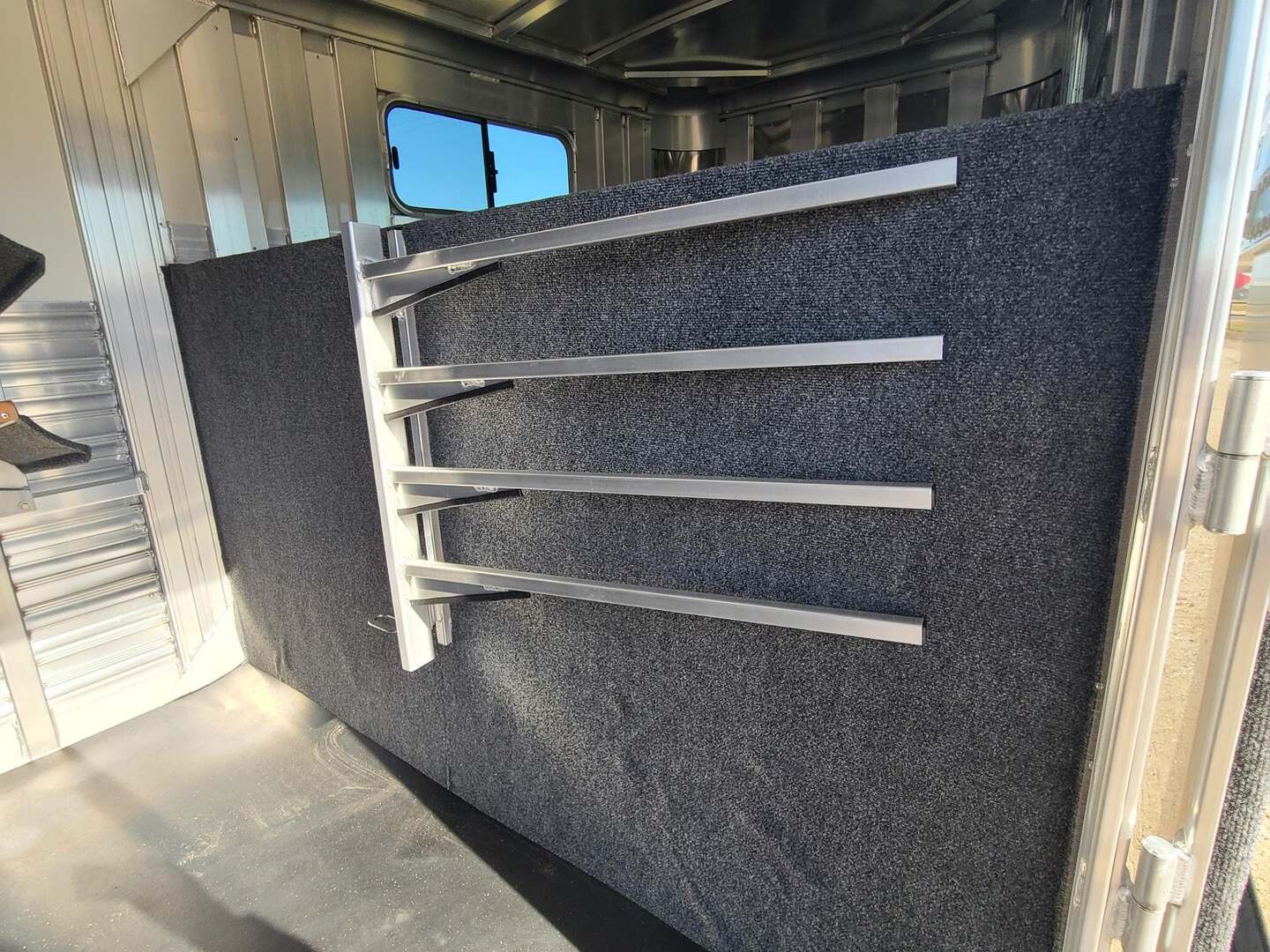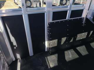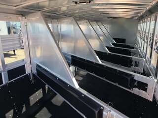 Platinum 6 Horse Stock Combo 7’6” wide x 26’ long x 7 tall 3’ short wall dressing room with 6 saddle racks and 4 blanket bars 3 swing out saddles, 3 on back wall Carpet on bulkhead wall with 20 hooks One brush tray on tack door Floor mats running entire trailer floor length 5-39” stalls and one 81” stall head side at rear Double rear gates 6’ hay rack and ladder 3 roof vents Rubber on side walls 4 outside halogen load lights Plexiglas & track on sides Stock escape door Stainless steel nose 7,000# axles with 10 ply tires 7 round LED clearance lights 4 LED load lights 6 inside LED lights