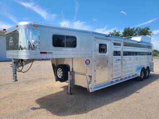 THIS TRAILER IS ON ORDER AND WILL ARRIVE IN JANUARY Platinum 24’ Stock Combo 7’6” x 24 x 7 tall 7000# axles on 10 ply tires x 5 Double front dressing room doors 3 saddle racks on each door Swing out blanket bars on each side Carpeted bulkhead wall with 20 hooks Brush trays on each door 4’ section in front, two 8’ sections behind it Stock escape door in front section Slider in rear gate Plexiglas & Track on both sides Mag aluminum wheels 6’ hay rack 5 halogen load lights Stainless steel nose Mill finish skin