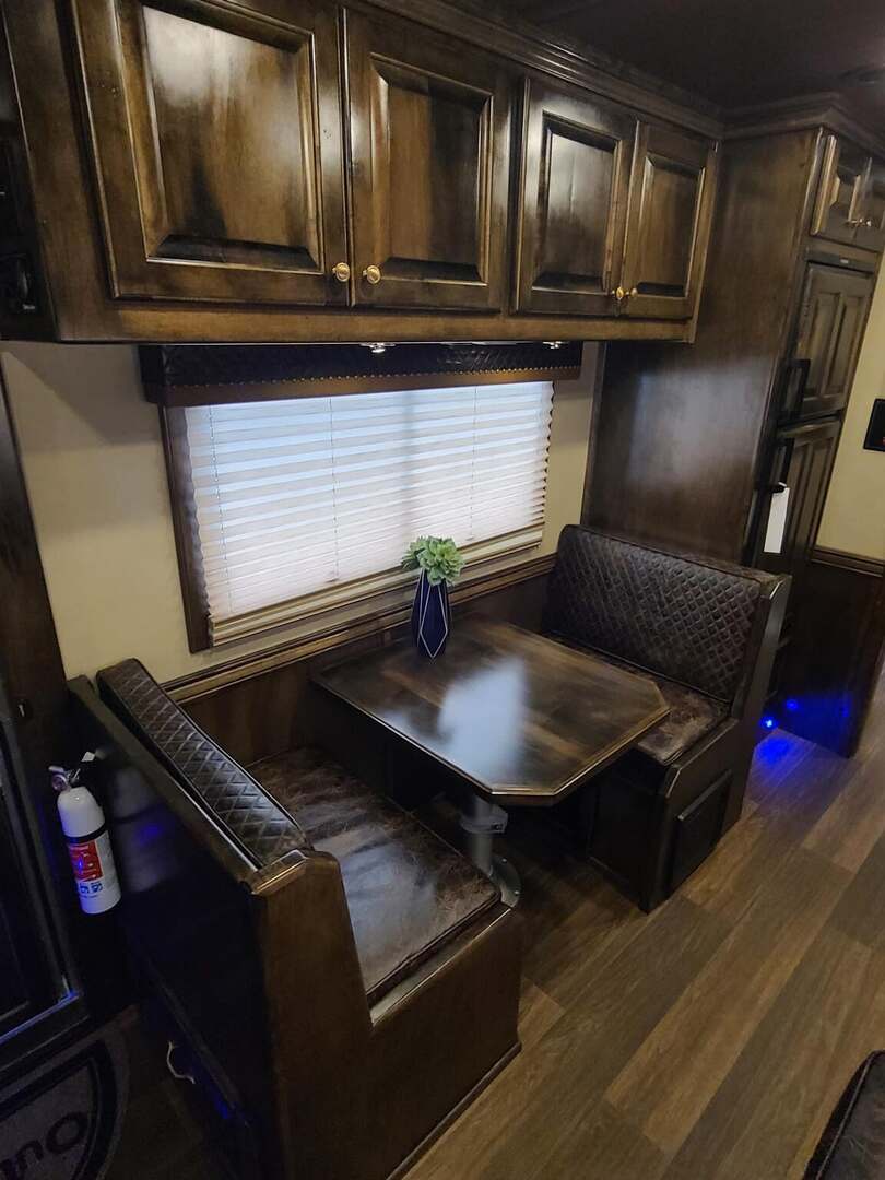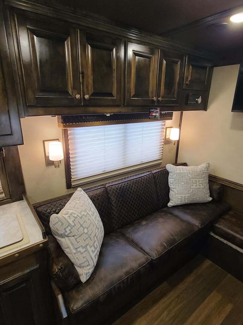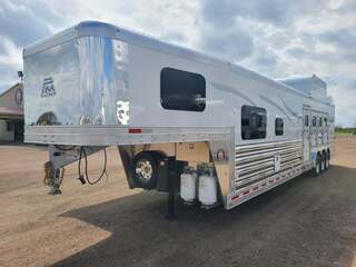 Platinum Coach 4 Horse 15’ 8” short wall Outlaw Conversion features: 8 x 35 x 8 tall 78” Couch & 72” Dinette floor plan Onan 4.0 Generator with 16 gallon fuel tank Only 70 hours on generator 15,000 BTU A/C with heat pump 32” Smart TV’s in living and bed area Winegard Connect 2.0 antenna for WiFi AM/FM/CD/DVD player with exterior speakers 6.0 Propane / Electric refrigerator 60 gallon water tank 20,000 BTU furnace 6 gallon propane water heater Two burner recessed cooktop Convection oven over cooktop Mocha Quartz kitchen sink with pull-out fauctet Slide out trash can under pantry storage Front bench area with storage underneath 34” radius shower in bathroom Porcelain toilet in front of double rod closet with leather on lid Vanity and sink under medicine cabinet next to shower Beautiful vessel sink, custom ordered for this design Pocket door to bathroom with mirror on bathroom side 24” walk through door to horses 18’ Two-Step awning Platinum Coach features: Tri-8k axles with 17.5” aluminum wheels & 18 ply tires Side load configuration, LOADED REAR TACK WERM flooring in horse compartment 3 mangers, escape door on first stall, head side 52” tall spring loaded side ramp, 46” last stall 8’ hay pod with generator landing Flow through dividers, telescoping last divider Stud divider with rubber on first stall Drop down windows on head and hip side Drop down window bars on head side Carpeted rear tack, loaded with bars, hooks, trays, and shelves 2-30# propane bottles Double aluminum battery box with ON/OFF switch 15,000# Equalizer Hydraulic jack THIS TRAILER WAS ONLY USED 5 TIMES AND TRADED IN ON A 5 HORSE!!