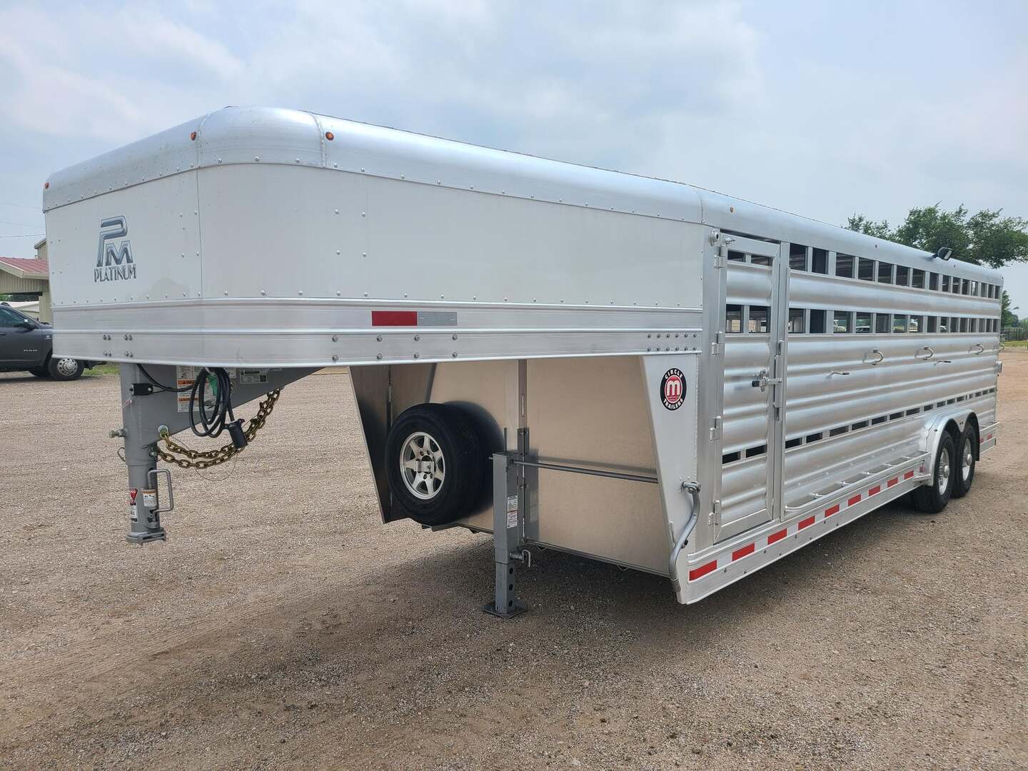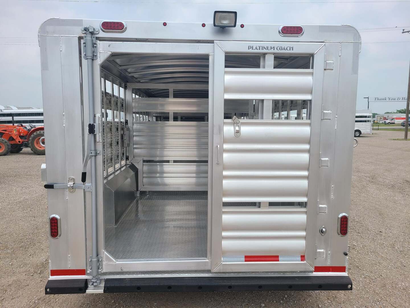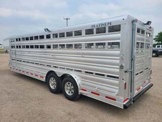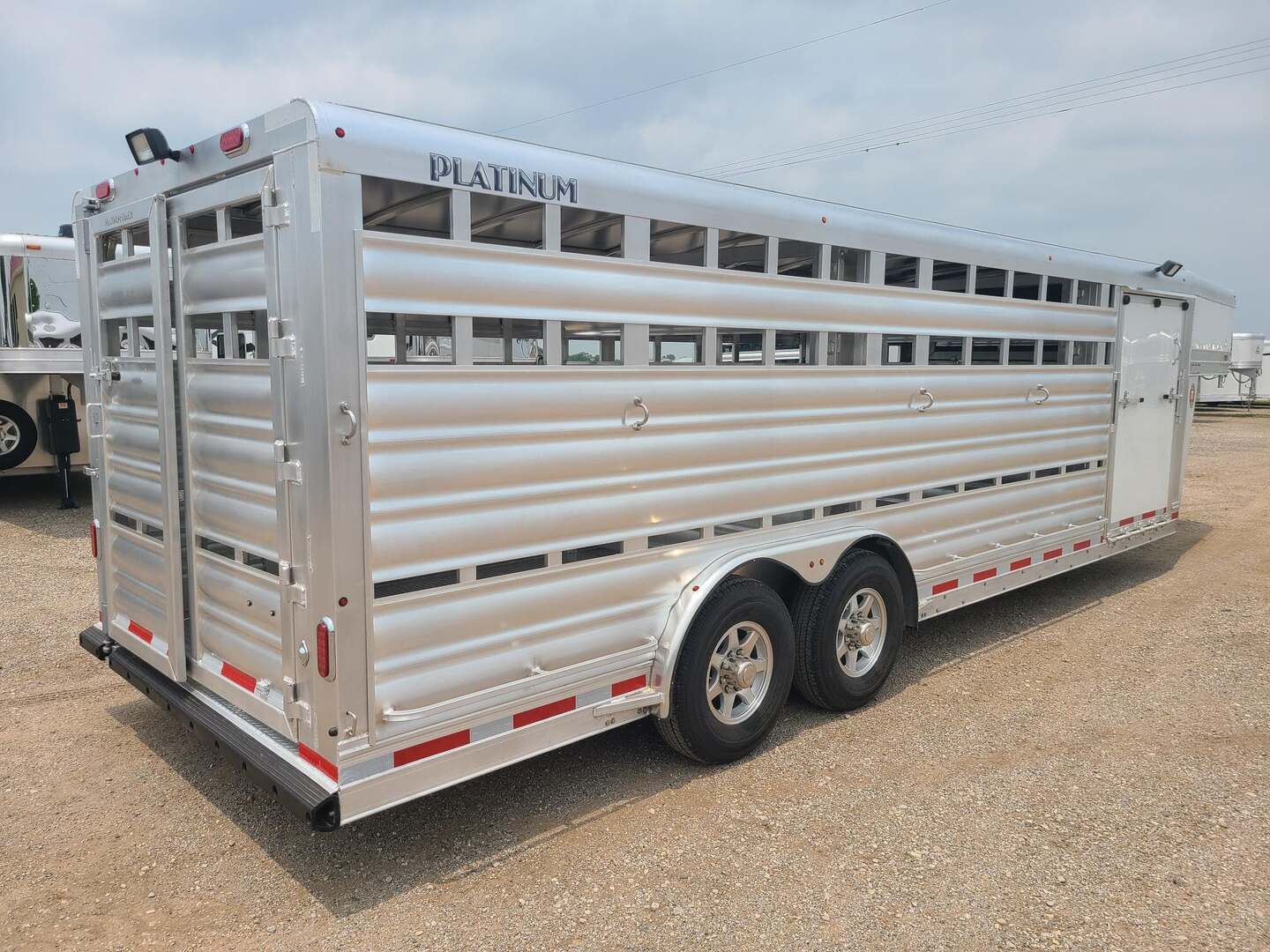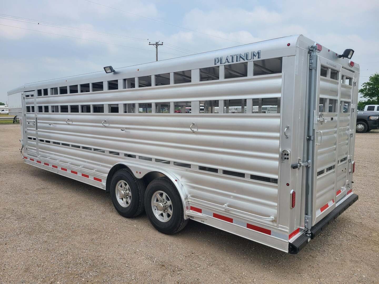Platinum Coach 24’ Rancher Special 24’ long x 8’ wide x 6’6” tall POLISHED SLATS!!! Aluminum wheels Full height side ramp, 48” wide Stock escape door Two center gates, one at 6’, one at 15’ Slider on rear gate Tie rail on both sides outside White skin on nose and ramp 3 exterior halogen load lights 2” air crack down low
