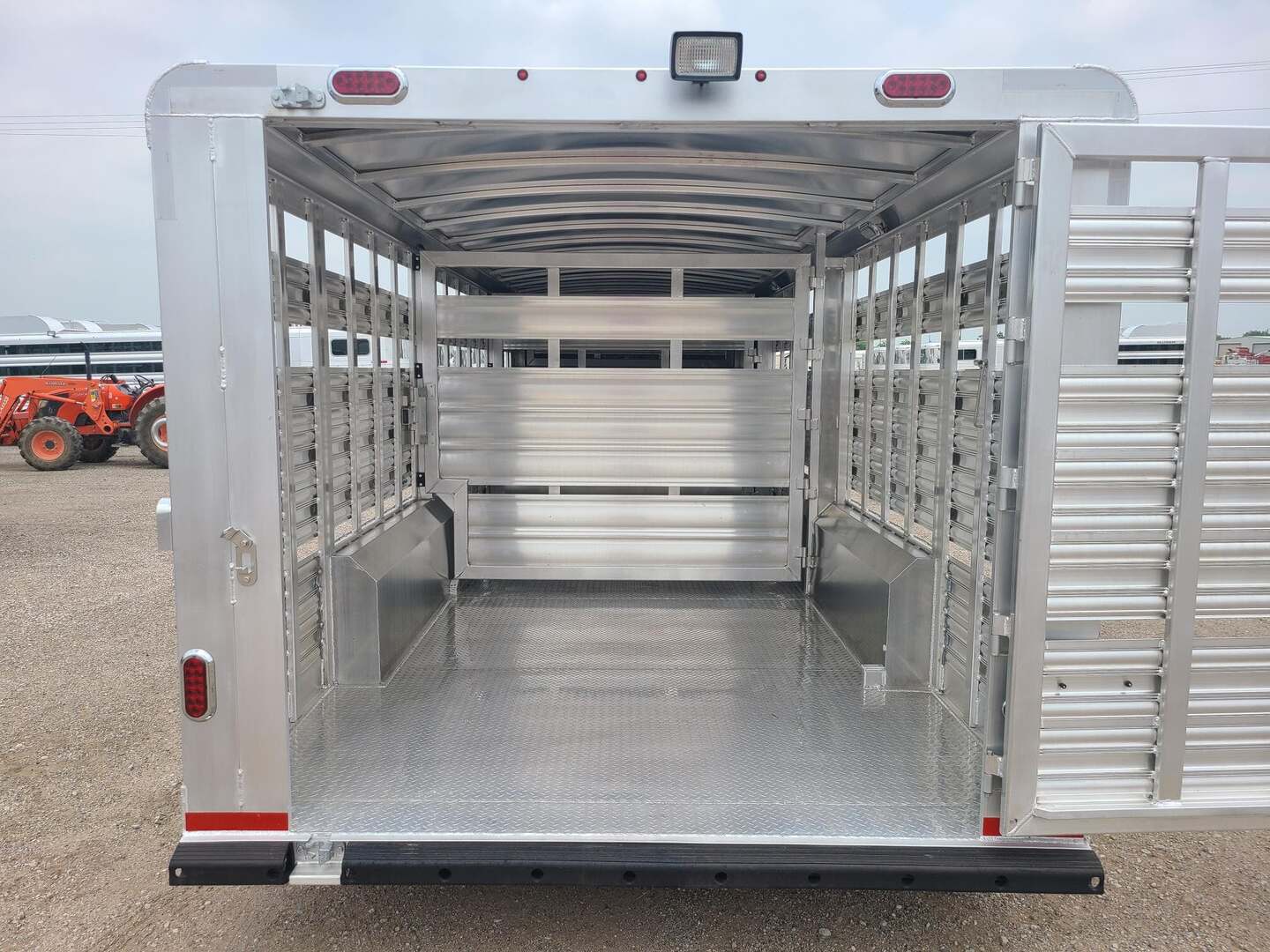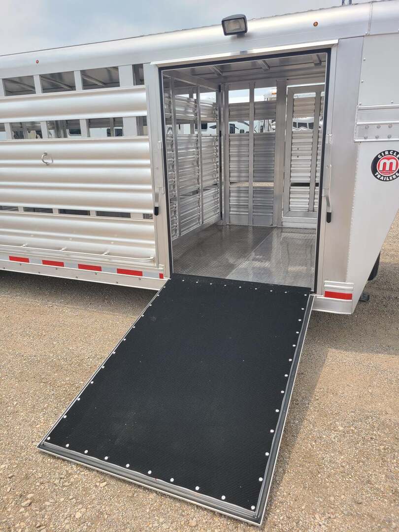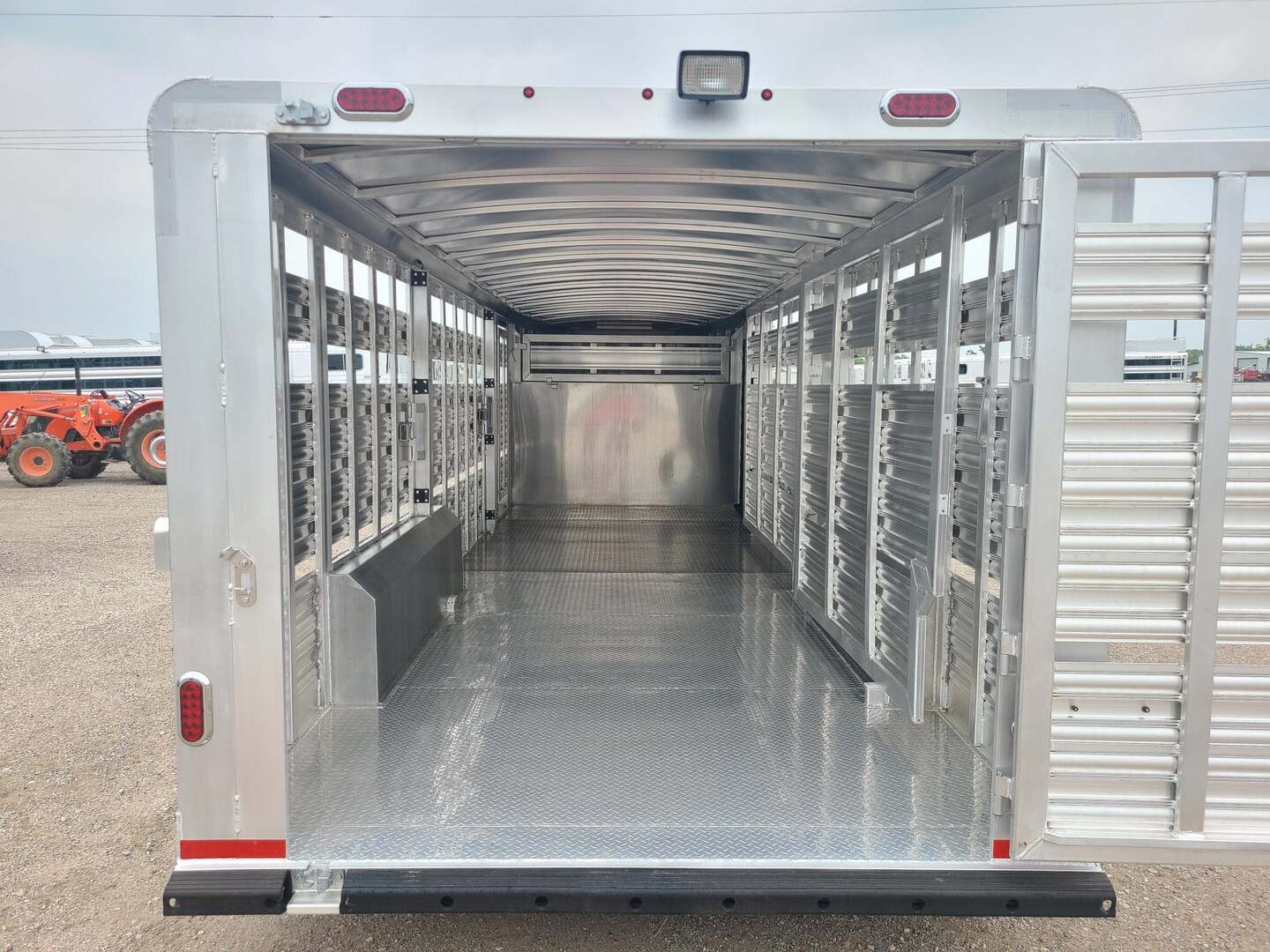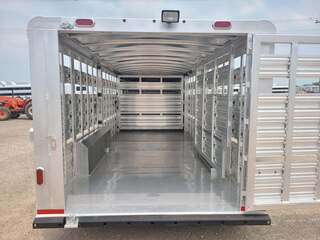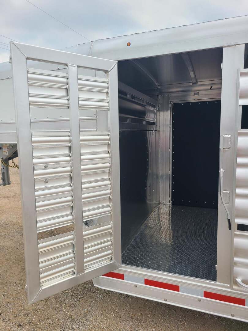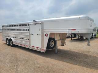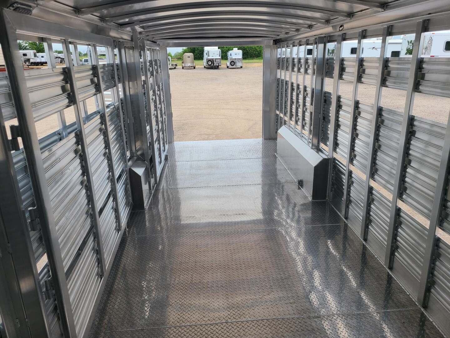 Platinum Coach 24’ Rancher Special 24’ long x 8’ wide x 6’6” tall POLISHED SLATS!!! Aluminum wheels Full height side ramp, 48” wide Stock escape door Two center gates, one at 6’, one at 15’ Slider on rear gate Tie rail on both sides outside White skin on nose and ramp 3 exterior halogen load lights 2” air crack down low