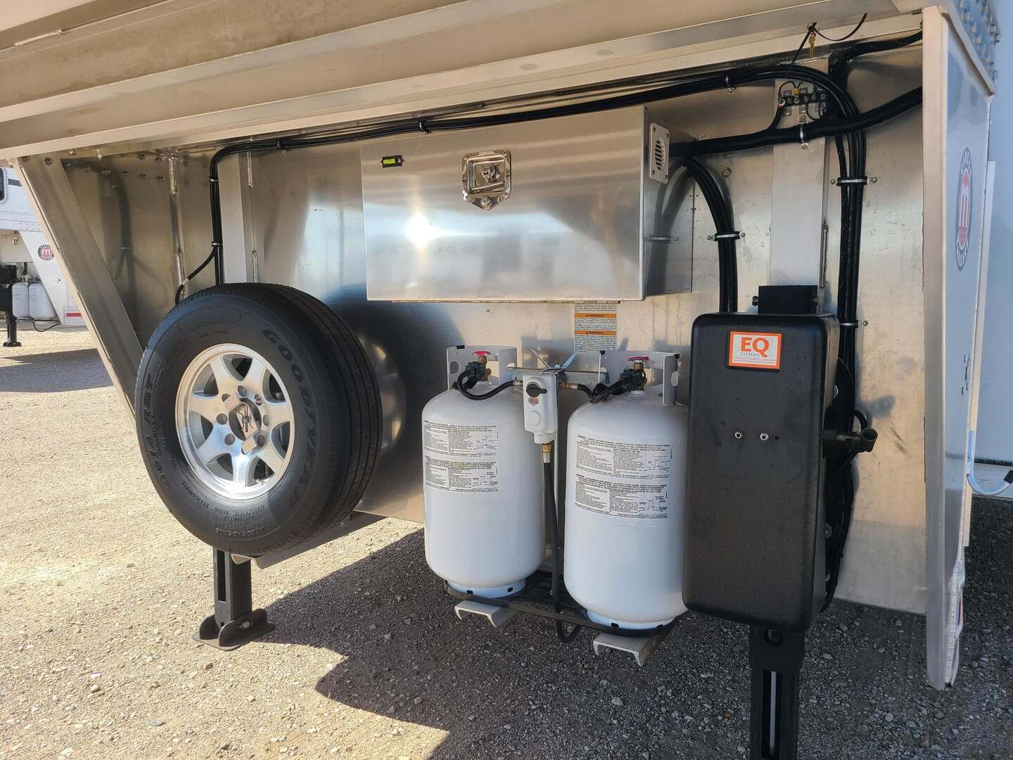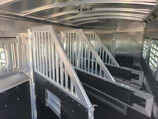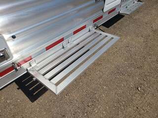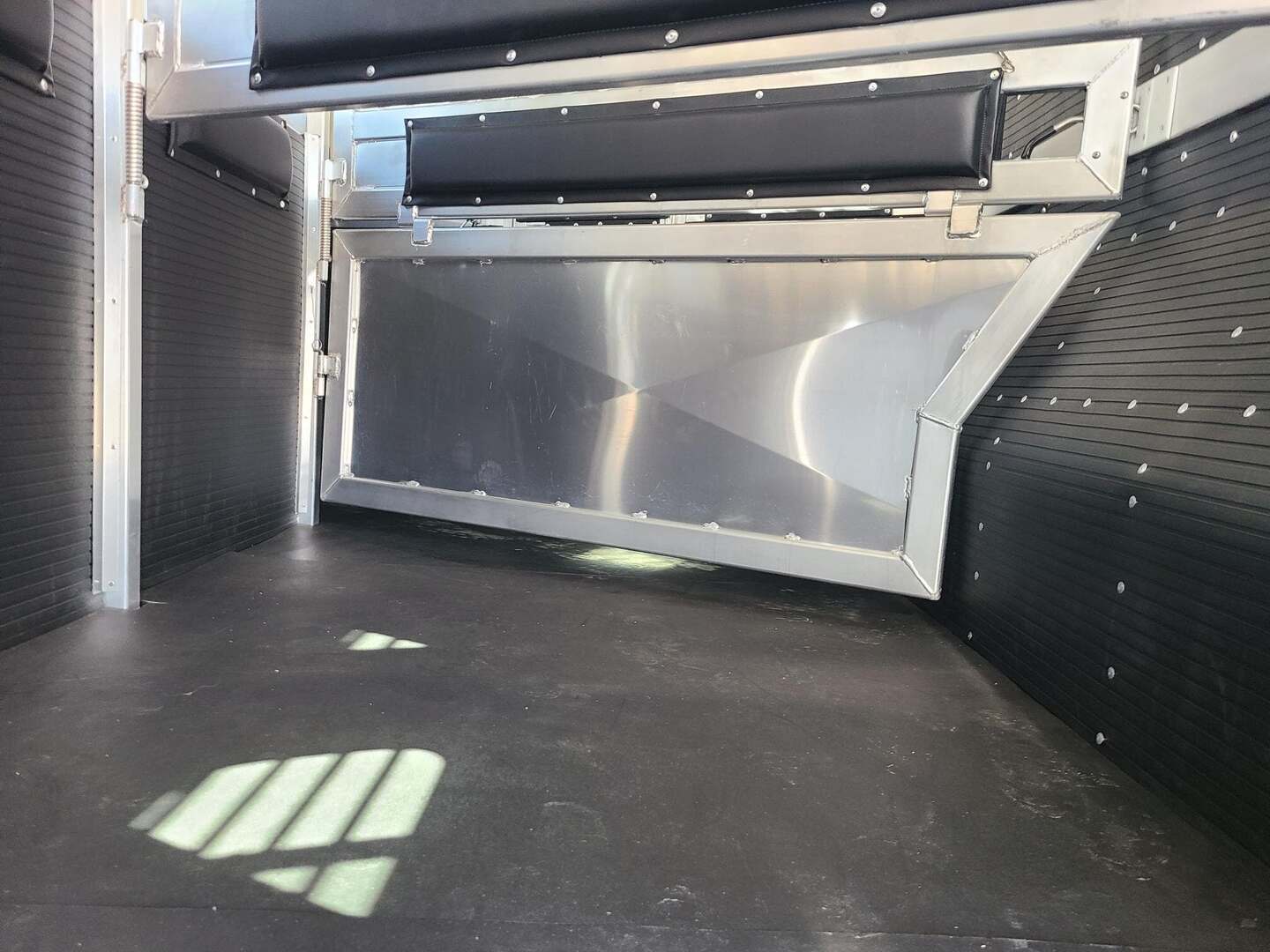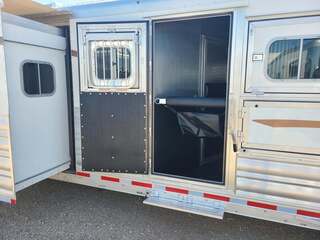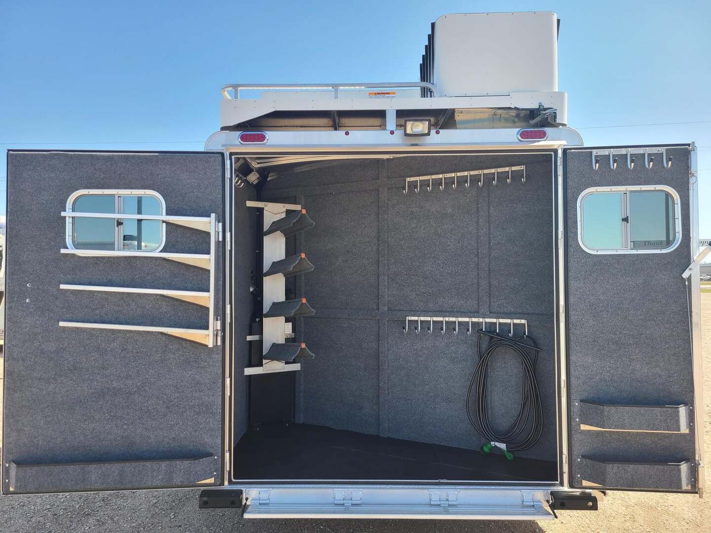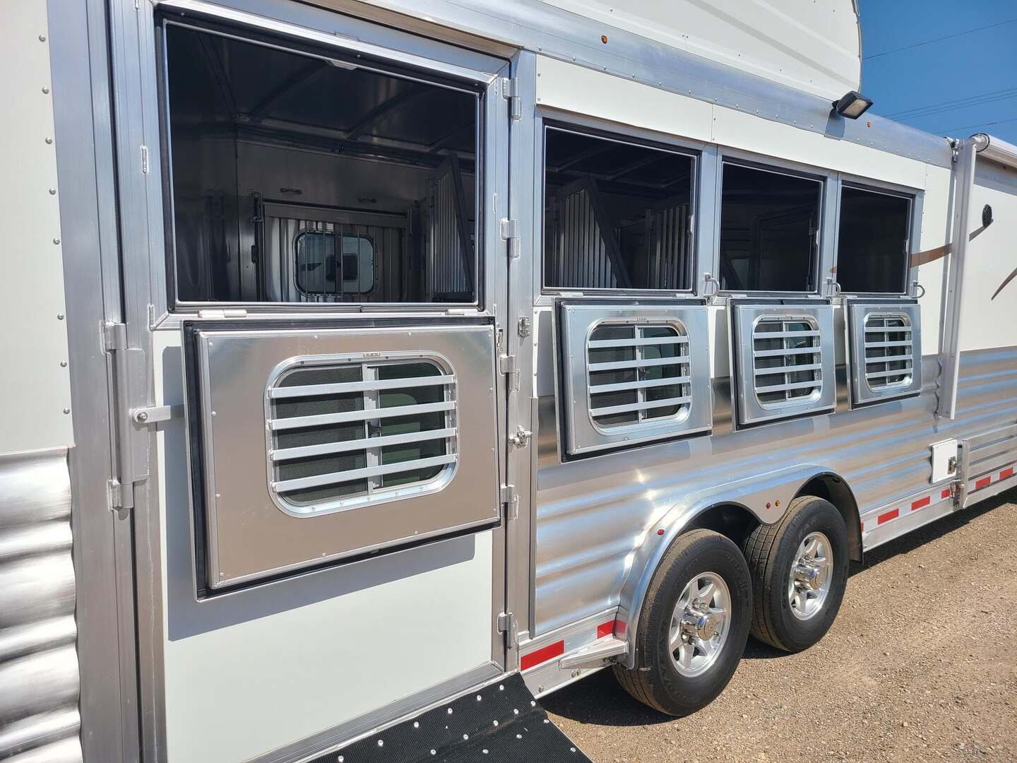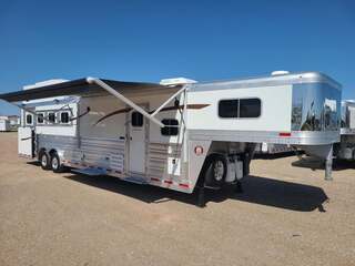 THIS TRAILER IS ON ORDER AND WILL ARRIVE IN NOVEMBER Platinum Coach 4 horse 12’8” Side Load with Slide Out Proline XP by Outlaw Conversions features: Onan 4.0 MicroQuiet generator Power Dometic awning over LQ  Dark Knotty Alder wood interior 72” Sofa sleeper with custom leather accent 15,000 BTU A/C with HEAT PUMP 20,000 BTU propane furnace 6.0 propane / electric refrigerator 6 gallon propane / electric water heater 2-30# propane bottles TWO TV’s, one 24” in bed, one 24” in living AM/FM/CD/DVD player with 2 exterior speakers Double hat racks over sliding screen Flip down bench on outside Double sink in kitchen with covers Two burner cooktop under microwave oven with vent hood 32” radius shower next to LARGE double rod closet Vanity sink with toilet in front Pocket door separating LQ from horse area 24” walk through door to horse compartment Platinum Coach features: 8 x 32 x 7’6 tall 6’ slide out for MASSIVE amounts of room in LQ Side load configuration....pack all your things! 8,000# axles, blocked 2” for more clearance 14 Ply Goodyear G-614 tires on aluminum wheels 6’ enclosed hay pod in front of generator box on landing 3 mangers, escape door on first stall Drop down windows on head and hip Drop down window bars on head side Stud divider on first stall Flow-through and spring-back dividers Dual leg hydraulic jack Double aluminum battery box Round LED clearance lights