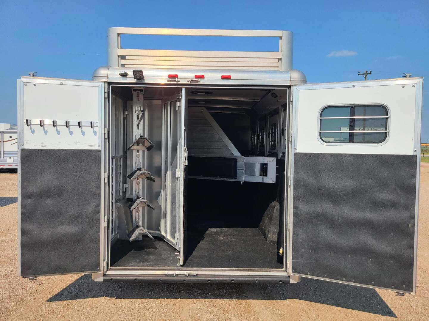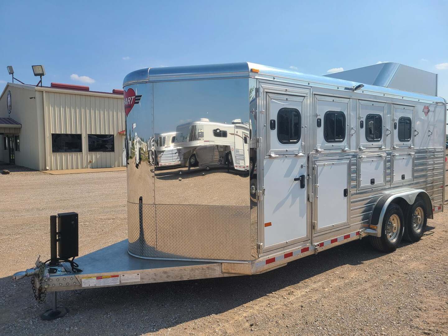 2023 Hart 4 Horse Bumper Pull 7’6” wide x 21’ long x 7’ tall Equalizer Hydraulic Jack 3 mangers, escape door on first horse Drop down windows on head & hip 6’ hay rack and ladder Collapsible rear tack Aluminum 16” wheels Stainless steel nose Carpet on bulkhead wall