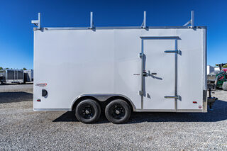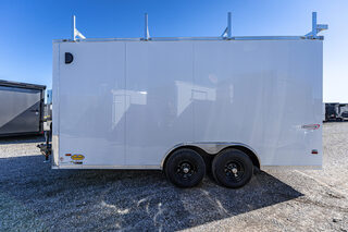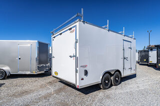 Stock # 44987 Base Unit: SC8516TA3 Scout Enclosed Trailer Quantity: 1 Chassis & Structure GVWR Rated @ 9,990 lbs 5,200# Tandem Drop Spring Axles Electric Brakes 6” Tube Frame Cross Members @ 16” O.C. Tube Wall Posts @ 16” O.C. Tube Roof Members @ 16” O.C. 2-5/16” Coupler – 14K 54” Triple Tube Tongue (For 7W & 8.5W Units) Painted Tongue Jack with Sand Foot Exterior & Trim Wrapped Top Trim Wrapped 24” ATP Stoneguard Bonded Fastenerless White .080 Hardbody Exterior Metal Includes .030 Metal – Color: White Rear Corner Posts Body Color Front Corner Wraps with J-Rail (Screwed Down) Aluminum Roof Flat Front Package – Scout Cargo Clear Lens LED Exterior Lighting LED Strip Tail Lights LED License Plate Light Rear Ladder Rack Rub Rail Appearance Package (Tandem Axle): (4) Stainless Steel Center Caps (2) Chrome Bezels for LED Tail Lights Doors & Access Heavy Duty Ramp Door with Flap Rubber Hinge Cover 36” Bravo-Built HD Aluminum Frame Side Door with: Strap Hinges Barlock & Flushlock Interior Aluminum Liner Located Curb Side @ 3’ Back ILO Standard Door Approximate Interior Height: 84” Side Door Height: 78” Interior & Flooring 3/8” Engineered Sidewalls 3/4” Engineered Flooring 24” Beavertail (4) 5,000# Recessed Floor D-Rings (1) in Each Corner, 6” in from Sidewalls Lighting & Electrical (2) 12V LED Dome Lights (Located at 4’ and 12’)