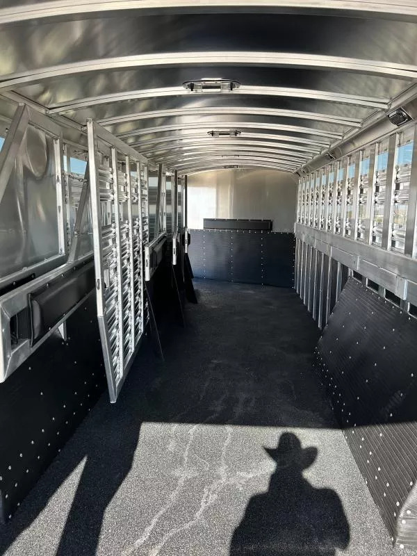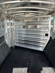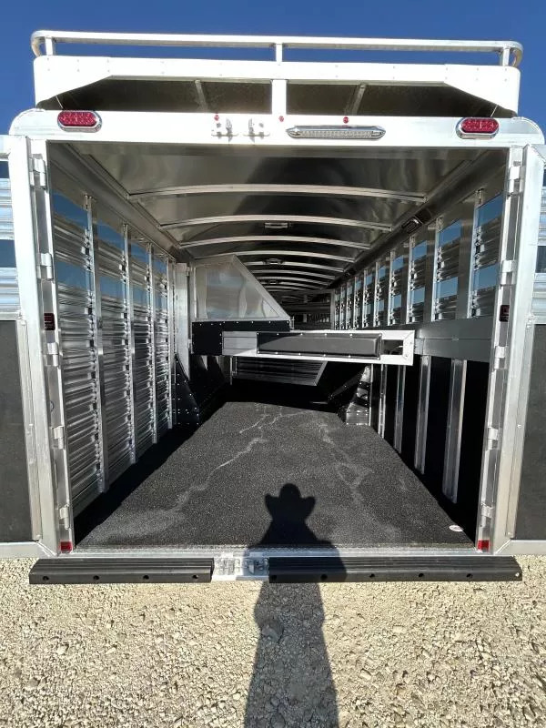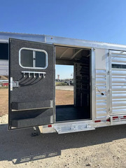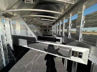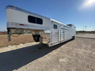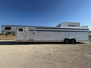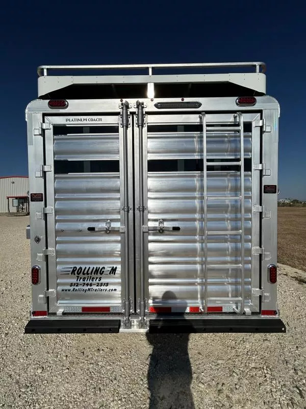This brand new 2026 Platinum Coach 8-Horse is the perfect hauler to keep you and your rig looking sharp while also doing exactly what you need it to do. Key features: * HAY POD, Enclosed * All-Aluminum * 2 x 10,000 lb Rubber Torsion Axles * 18-Ply 245/70R17.5 Tires * WERM Flooring * 40/60 Rear Double Gate * 1 Full Slatted Cut Gate * 6 Dividers * 8 saddle racks * 8 blanket bars * 30 bridle hooks * 16 outside tie rings * 16 inside tie rings * Led clearance lights * Led loading lights * Roof vents * 8’ Hay Pod w/ladder * 4’ tack door on curb side * Additional Tack door on street side Designed for maximum strength and durability, this trailer is perfect for rodeos, shows and trainers! Call Rolling M Trailers today at 512-746-2515 for more information.