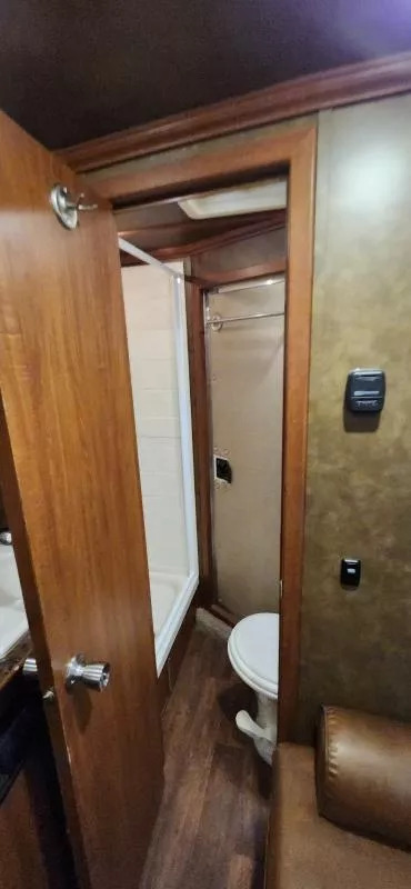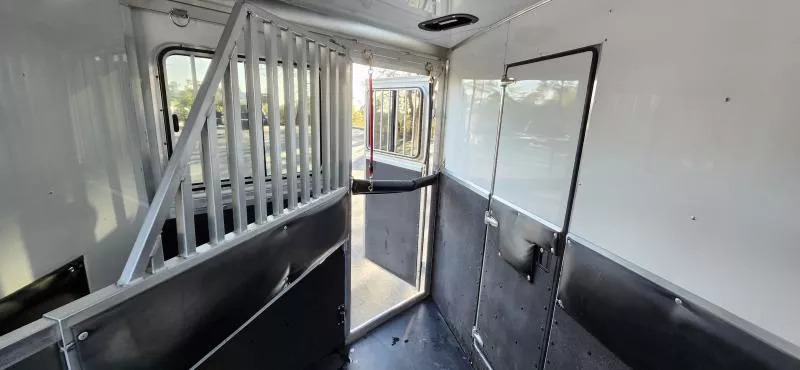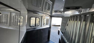 Like-New Santa Fe Living Quarters Trailer - Priced to Sell! This one won’t last long - incredible value and loaded with premium features! Highlighted Features: Electric jack for easy hitching Sleek chrome nose wrap Furnace for cozy comfort Escape door for added safety Walk-through door for convenience Drop-down windows for ventilation Hidden screen door for a clean look Swing-out saddle rack for easy access Exterior water faucet for quick rinses 110V GFI outlet for outdoor power needs Sprayer on kitchen faucet for added functionality