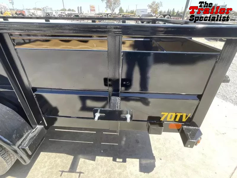 New 2026 Big Tex 70TV-12BRK2 7x12 Utility Trailer! The 70TV Tandem Axle Vanguard Trailer from Big Tex Trailers has a generous width and higher v-crimped steel sides to protect your cargo while hauling. This rugged trailer is perfect for heavy lawn and garden use, as well as heavy duty landscaping. GVW: 7,000 LBS Empty weight: 1,766 LBS 4’ ramp gate Spare tire mount Standard Features: Axle: (2) 3,500 quick lubricating with 1 electric brake Jack: 2,000 top wind, set-back jack Tire: ST205/75R-15 load range c Floor: 2” treated pine or Douglas fir Frame: 4”X3”x1/4” angle Sides: 24” tall v-crimped steel sides Wheel: 15”x5”;black mod 5 on 5 bolt pattern Finish: superior quality finish is applied for a highly decorative and protective finish Lights: LED DOT stop, tail, turn and clearance Tongue: 4” channel fold back/wrap tongue Coupler: adjustable, 7,000, 2” forged coupler Fenders: 9”x72” 16 ga. tear drop with back GVWR: 7,000 Top rail: 2”x2” square tubing Elec plug: 7-way RV Hitch type: bumper pull Suspension: multi-leaf spring with equalizer Crossmember’s: 3”x2”x3/16” angled Finish (prep): steel is cleaned to ensure a professional, smooth finish Safety chains: 1/4” grd. 70 with safety latch hook GAWR: 3,5000 THE 70TV ALSO COMES EQUIPPED WITH: * (4) Tie Down Loops Inside Bed * (4) Stake Pockets on Outside Frame * Adjustable Forged, 7,000# Coupler * Fold Back/Wrap Tongue (14 & Longer) * Set-Back Jack * Quick Lubricating Hubs * Premium Brand Axles * Forward Self Adjusting Electric Brakes * Cambered Axles * Durable Tubing Top Rail * 24” V-Crimped Steel Panels * Tear Drop Style Fenders * Grommet Mount Sealed Lighting * L.E.D. Lighting Package * Protected Wiring * Removable Sand Foot on Jack * Complete Break-A-Way System w/ Charger * Radial Tires While we always strive for complete accuracy, please verify all specifications with a sales representative.