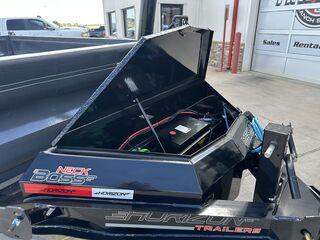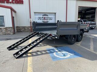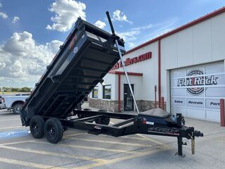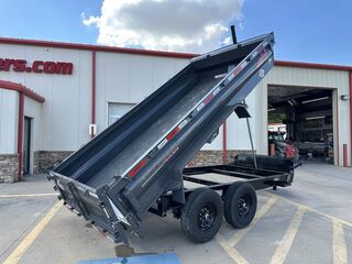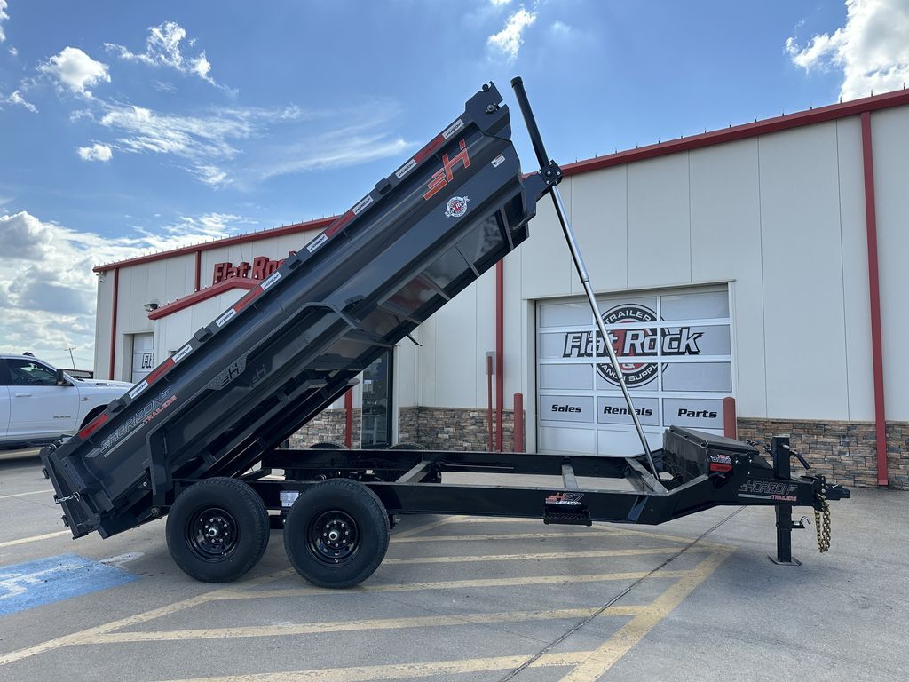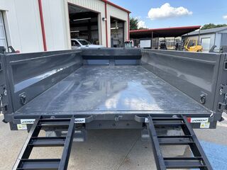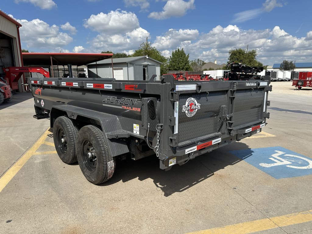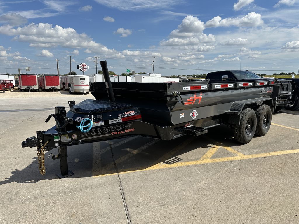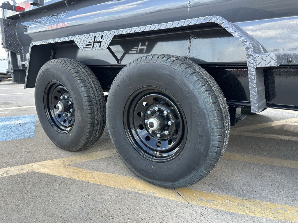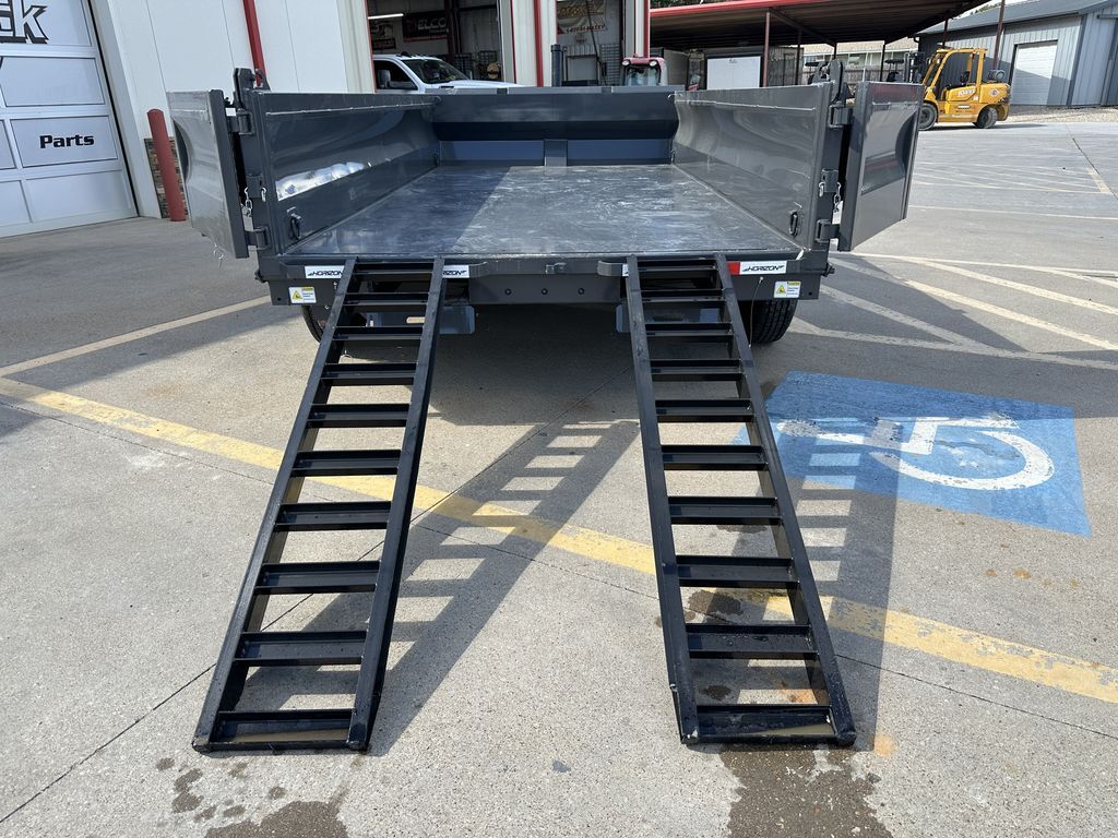 83 in x 14 ft Bumper Pull Horizon Dump Trailer w/ 24 in Sides 2 x 7,000 lb. Spring EZ Lube Brake Axles Electric Brakes on Both Axles Ram 2 5/16 in Adjustable Coupler (14,000 lbs.) Bumper Pull Tongue Length 60 in 8 in I Beam Full Tongue (13 lb. / ft) 8 in I Beam Full Frame (13 lb. / ft) Over Sized Lockable Toolbox (w/ Disk or Padlock) 1 x 10K Drop Leg Jack Dual Lockable Steel Tool & Pump Box 110 Integrated Trickle Charger 1 x 27 Deep Cycle Marine Battery 6 in x 3 in x 1/4 in Tube Frame 12 V KTI Hydraulic Pump (Power Up / Power Down) 3 Stage Telescoping Lifting System 14’ Corded Cable 48 Degree Dumping Angle Rounded (for Strength) 10 Gauge Sides One Piece 7 Gauge Floor 4 D Rings Inside Bed 3 in Channel Cross members on 16 in Centers 3 Way Rear Door Assembly 79 in Slide In Ramps Roll Up Tarp Assembly 4 Stake Pockets on Each Side Double LED Lights Encased in a Side Mount ATP Box New 235 80 R16 in 10 Ply Tires on Black Mod Wheels Spare Tire Mount 5 J Tarps on Each Side 6 Leaf Slipper Spring Suspension (4,000 lbs. Each) Double Broke Diamond Plate Fenders (1/8 in Think) Monster Steps on Each Side Along with Front and Back Fender Steps Flush Mount LED Lights All Weather Wiring Harness Double Insulated Frame Wiring Harness   Empty Weight: 4,750 lbs. GVWR: 15,200 lbs. Carrying Capacity: 10,450 lbs.