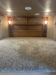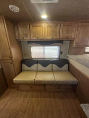 Interior Features - 2 exterior porch speakers, exterior porch 110 outlet, hand hold, porch light, swinging screen door, flip down step, dual reading lights, 110 outlets in bunk, cabinet & shelf in nose, TV ready, radio, 2 interior roof speakers, ducted AC, soft touch walls, 2 steps into the bunk, pull out sofa, digital fluid monitor, digital thermostat, closet space.