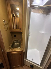 Bathroom Area - Pocket privacy door, toilet, shower w/ skylight, 110 outlet, handwash sink, mirrored medicine cabinet, closet space, vent w/ fan, ducted AC, cabinet space, furnace heated bathroom, swinging shower glass door.