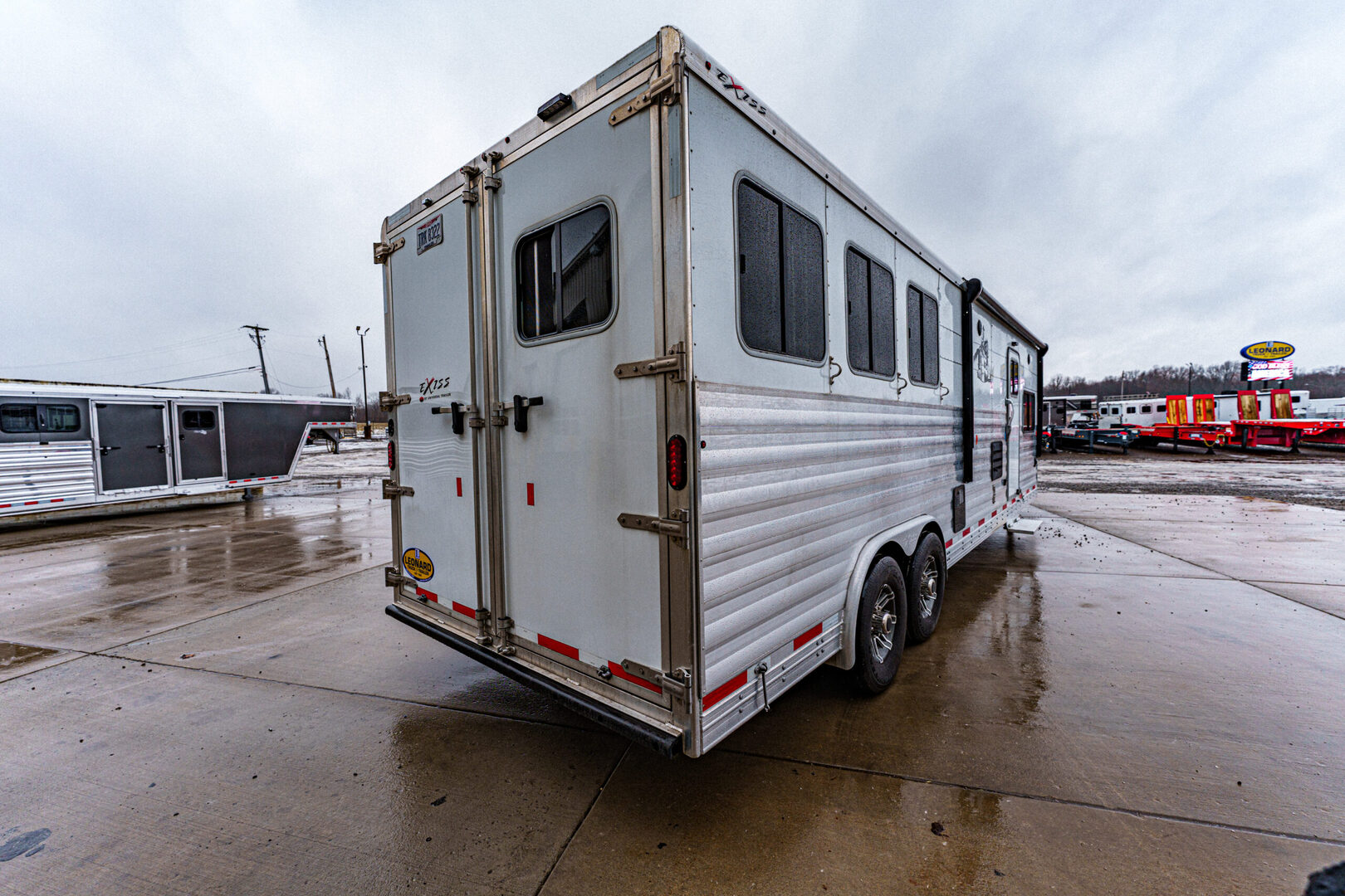 View Inventory: https://leonardtrailers.com/inventory/45026 Stock# 45026 Used 2020 EXISS 3 Horse GN - LQ Trailer    General Information Construction: Steel frame with aluminum skin Coupler Size: 2 5/16” Roof: Aluminum Primary Color: White Length: 29’ Width: 9’ Height: 7’6” Horse Area Type: Slant Rubber Lining: Complete Escape Type: 1 Full Walk Out Tack Area Type: Rear Collapsible, Inside Dress Dressing Room Type: Slant Options: Lined/Insulated  Carpet  110V Package  Living Quarters Size: 14’ Awning Size: 16’ Options: Air Conditioning  Furnace / Heat Strip  Sofa  Dinette  Sink / Kitchen  Stove / Refrigerator  Microwave / Oven  Sink in Bath  Toilet / Shower  Slide Out  Specifications GVW: 14,000 lbs Axle Size: 7,000 lbs Tire Size: 16” # of Brakes: 4 Brakes: Electric Ride Type: Rubber Ride Jacks: Single Hydraulic We offer outstanding financing options, accept trades, and can arrange nationwide NO HASSLE delivery! Inquire today for more information! (888) 333-6613 **We believe these specifications to be accurate. Any discrepancies are unintentional. Please verify information with a sales associate prior to purchase.** Stock Number:45026