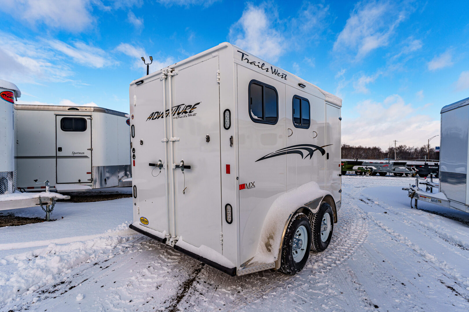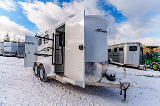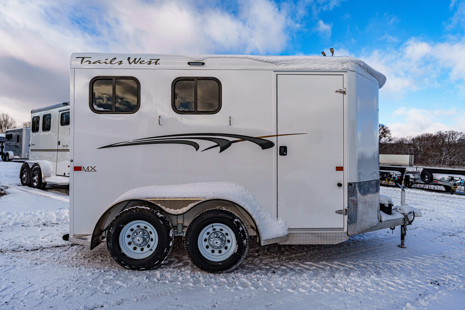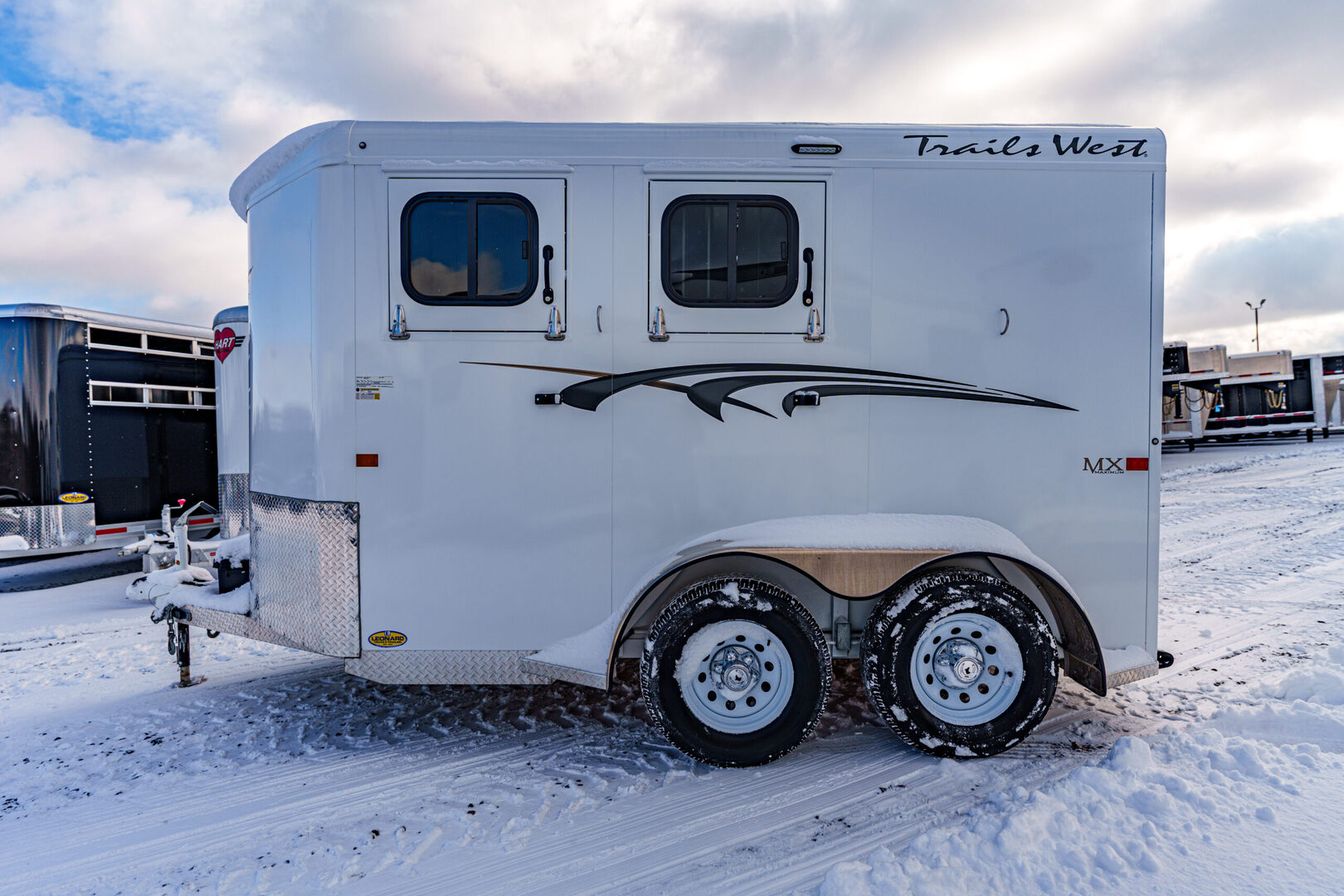 View Inventory: https://leonardtrailers.com/inventory/45177 Stock# 45177 Used 2025 TRAILS WEST 2 Horse BP Trailer   General Information Exterior: XT SS Construction: Galvanneal frame with aluminum skin Coupler Size: 2 5/16” Adjustable: Yes Roof: Aluminum Primary Color: White Length: 13’ 6” Width: 6’ 9” Horse Area Type: Slant Options: Mats Lights  Rubber Lining: Complete Escape Type: 1 Full Walk Out Tack Area Saddle Racks Hooks, Bruch Box, Blanket Bar Door / Gate Double Rear Doors Dressing Room Size: 3’ Options: Lined/Insulated  Carpet  110V Package  Saddle Rack Location  Access to Horse Area  Specifications GVW: 7,000 lbs Empty Weight: 3,220 lbs Axle Size: 3,500 lbs each Tire Size: 225/75R15 # of Brakes: 4W/B Brakes: Electric Ride Type: Rubber Ride Jacks: Single, Manual We offer outstanding financing options, accept trades, and can arrange nationwide NO HASSLE delivery! Inquire today for more information! (888) 333-6613 **We believe these specifications to be accurate. Any discrepancies are unintentional. Please verify information with a sales associate prior to purchase.** Stock Number:45177