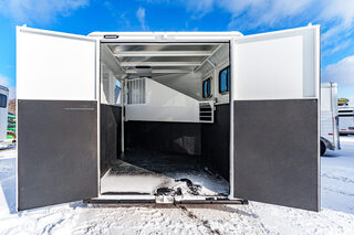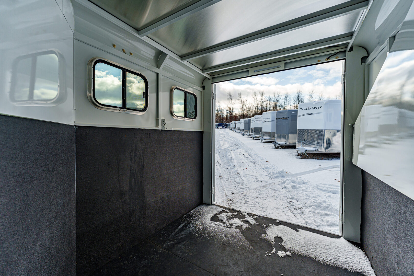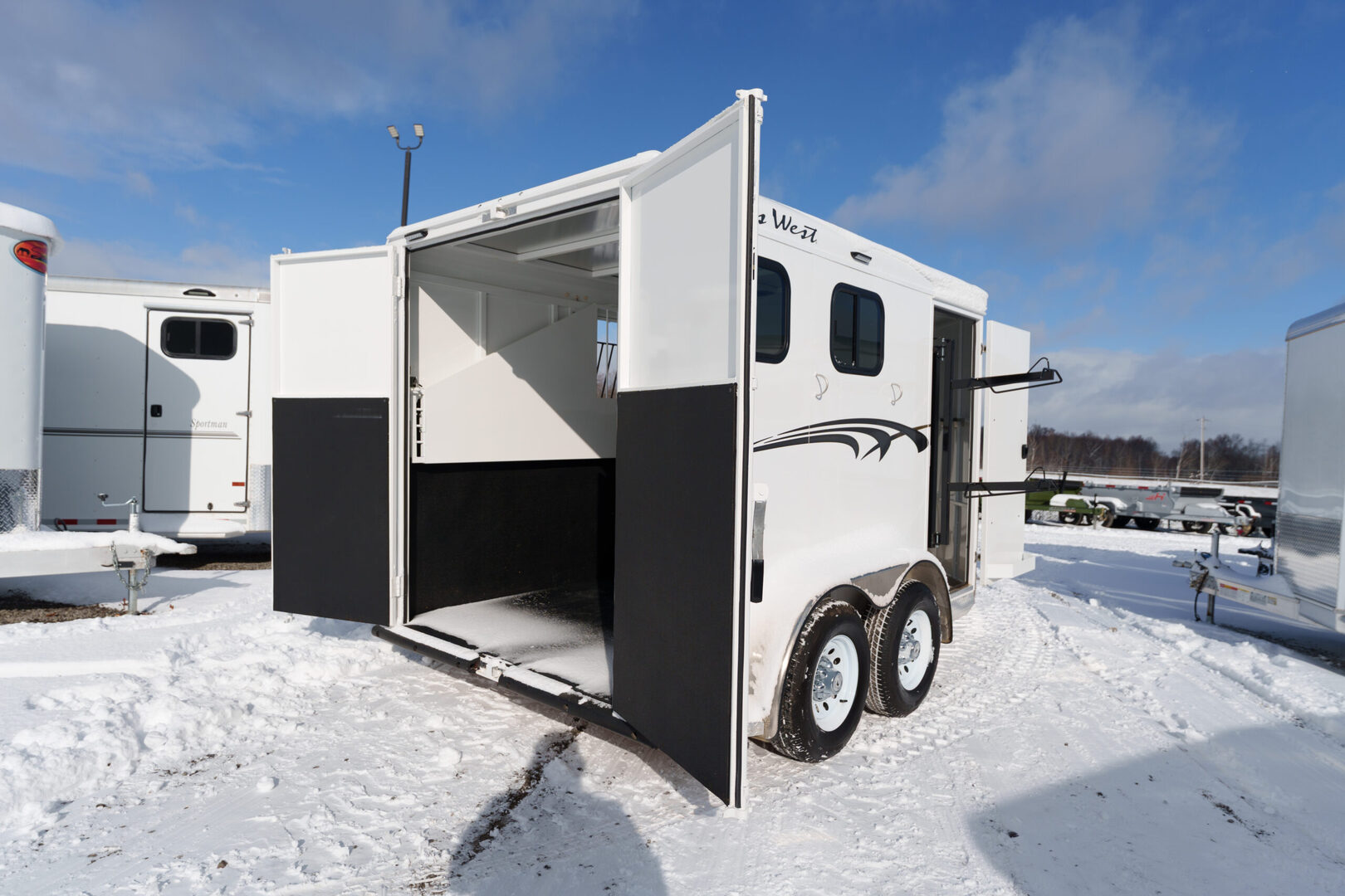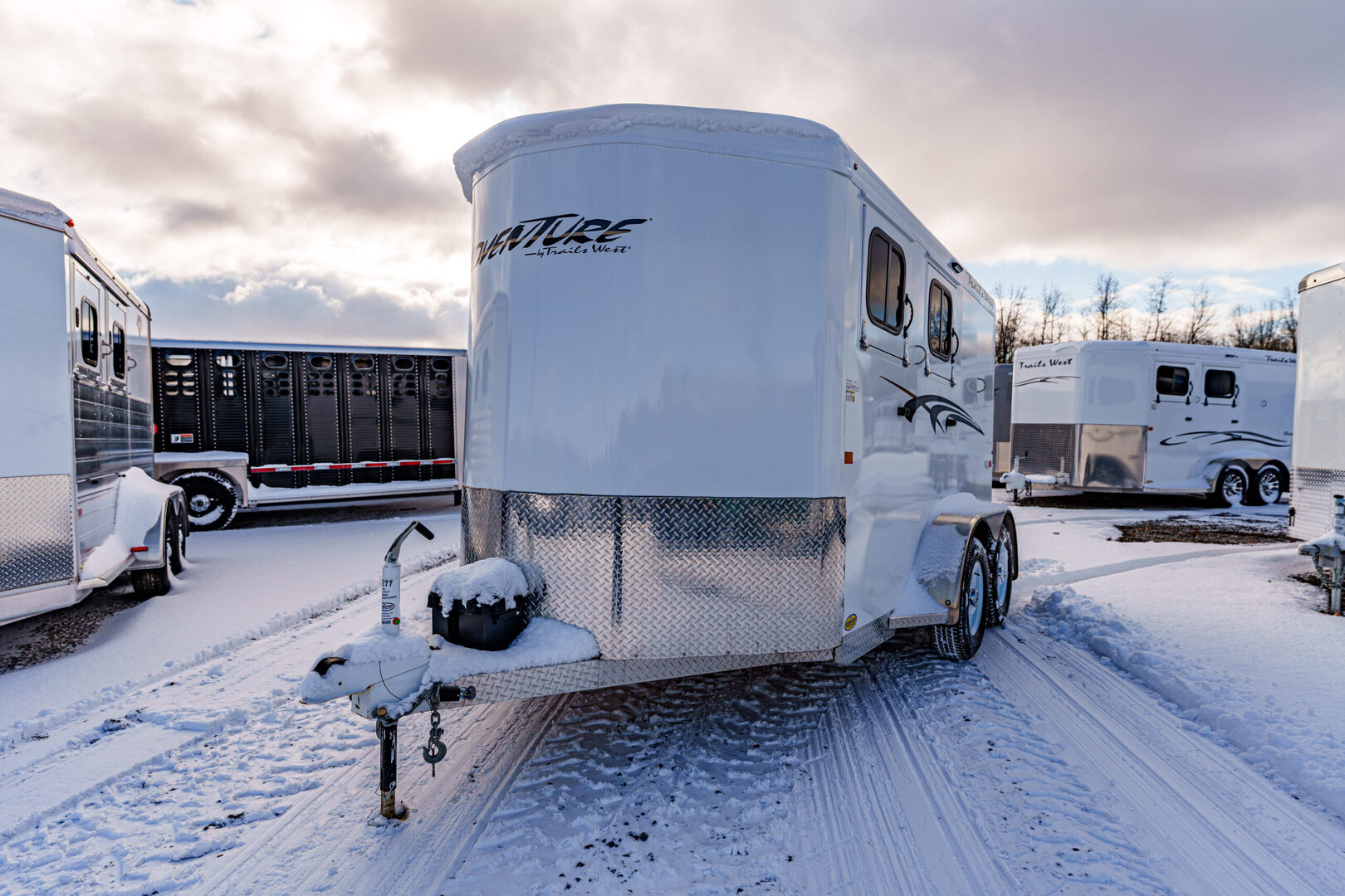 View Inventory: https://leonardtrailers.com/inventory/45177 Stock# 45177 Used 2025 TRAILS WEST 2 Horse BP Trailer   General Information Exterior: XT SS Construction: Galvanneal frame with aluminum skin Coupler Size: 2 5/16” Adjustable: Yes Roof: Aluminum Primary Color: White Length: 13’ 6” Width: 6’ 9” Horse Area Type: Slant Options: Mats Lights  Rubber Lining: Complete Escape Type: 1 Full Walk Out Tack Area Saddle Racks Hooks, Bruch Box, Blanket Bar Door / Gate Double Rear Doors Dressing Room Size: 3’ Options: Lined/Insulated  Carpet  110V Package  Saddle Rack Location  Access to Horse Area  Specifications GVW: 7,000 lbs Empty Weight: 3,220 lbs Axle Size: 3,500 lbs each Tire Size: 225/75R15 # of Brakes: 4W/B Brakes: Electric Ride Type: Rubber Ride Jacks: Single, Manual We offer outstanding financing options, accept trades, and can arrange nationwide NO HASSLE delivery! Inquire today for more information! (888) 333-6613 **We believe these specifications to be accurate. Any discrepancies are unintentional. Please verify information with a sales associate prior to purchase.** Stock Number:45177