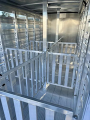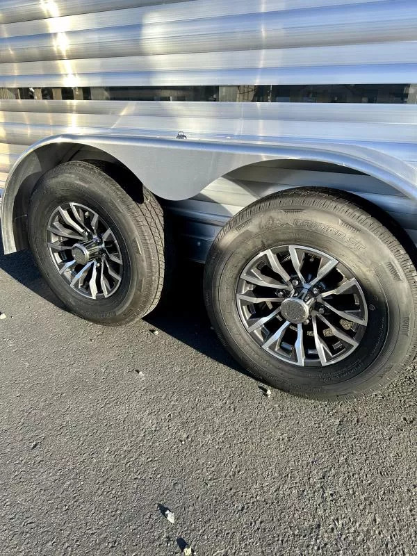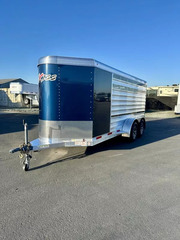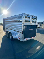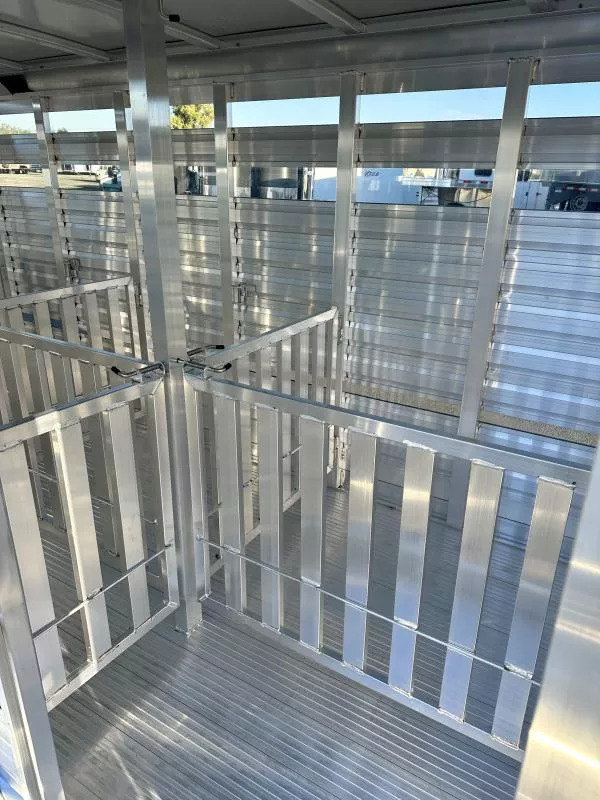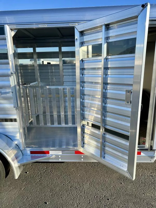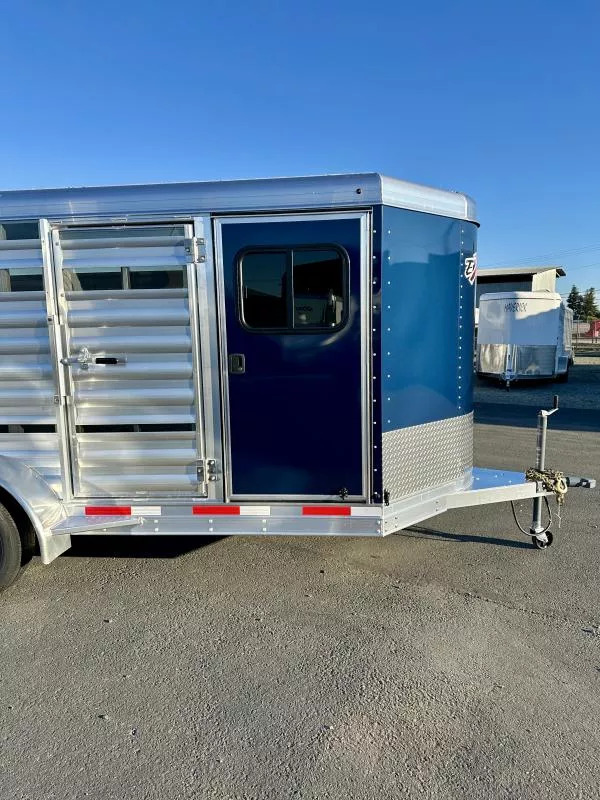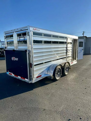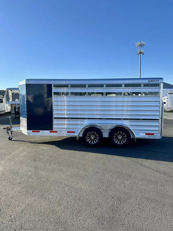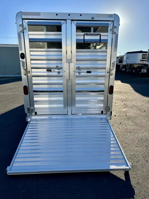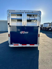 2026 Exiss 615A Mini Exhibitor Combo Bumper Pull Stock Trailer. * 6’ Wide, 15’ Long Box, 6’2” Tall * All Aluminum Construction * One Piece Aluminum Roof * Indigo Blue Aluminum Smooth Sheets * Extruded interlocking non-skid aluminum plank floor * 2” x 4” I Beams on 12” centers * Extruded Aluminum Exterior Slats * Tandem 3500# Torsion Axles * 15” Radial Tires with 6 Lug Wheels * Aluminum Wheels * 4 Wheel Electric Brakes 3’ Straightwall Front Tack Room: * Camper Door with Sliding Window * Inside LED Light * Carpeted Floor * Spare Tire Stock Area: * Two Air Spaces with Plexiglas Tracks * 2” Lower Air Gap * Removable Plexiglas Inserts * 32” Wide Side Access Door * Removable 60/40 Pen System * (3) 5x9 Pop-Up Roof Vents * 50/50 Rear Stock Doors * Full Width Rear Ramp * LED Dome Light with Switch * LED Tail Lights * 2 5/16” Coupler Call D2 Trailer Sales 209-745-5480 or for more info www.d2trailersales.com