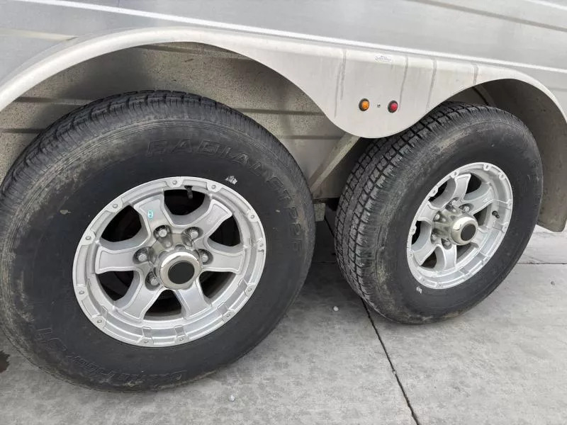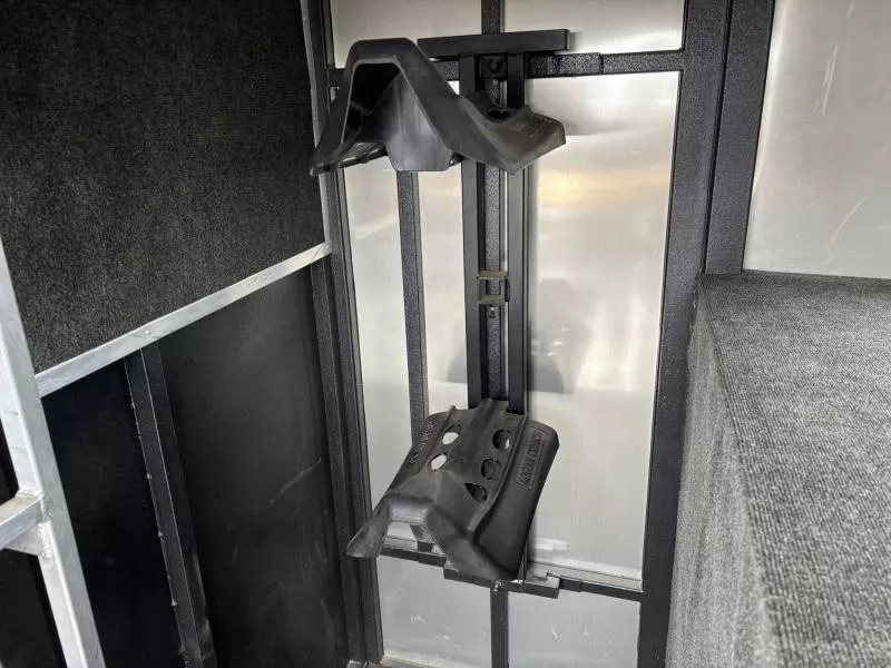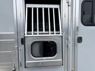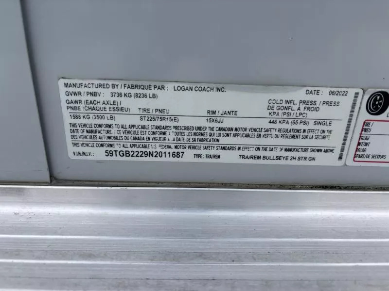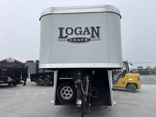 Used 2022 Logan Coach BULLSEYE2GN Bullseye 2 Horse GN Straight Load Horse Trailer! Upgraded Features: 16’ 6-lug aluminum wheels Standard Features: Structural- 7’ tall, 6’ 9” wide Galvanized structural tubing in walls and floor One-piece aluminum roof Wheels, Tires & Axles- Torsion axles Radial tires with radial spare tire Steel wheels Exterior- Smooth aluminum skin .050 lower wall panel (attached with 3M VHB bonding system) with legacy horse graphic Corrugated exterior aluminum panel lower wall panel (.050 mill aluminum finish) side walls Vortex rubber coating on tongue Extruded aluminum ribbed running boards and aluminum fenders Graphics (as shown) Exterior tie rings (one on each side) Electrical- Three flood lights controlled by outside light switch Dome lights with remote switch in tack room and stall area LED marker and tail lights Tack/Dressing room- Single-wall construction Removeable carpet on floor Stationary saddle rack 4-place blanket bar Door organizer Stall Area- Triple wall construction floor to hip (built 48” high) with vortex rubber coating 129” stall length Wood floor with removeable rubber floor matts Large sliding window per stall with window bars Double rear doors with windows Bolt-on spring loaded ramp Escape door at front of stall (each side) with drop down window and grill Padded aluminum divider Chest and nylon butt straps (each stall) Pop-up vent (one per stall) Interior tie ring (one per stall) Feed bag hooks (one per stall) Removeable center post and divider While we always strive for complete accuracy, please confirm specifications with one of our sales reps .