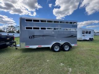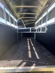 This trailer is perfect for hauling local or to shows. The stock sides all the way around provide optimal airflow to keep horses cool. The trailer is all aluminum with the exception of the pressure treated wood floor. Horse are has 42" stalls, telescoping dividers, two tie rings per stall, rubber mats and interior lights. Trailer also has a rear load light. Trailer is very versatile as not only is it SUV and small truck friendly the Tack room wall collapses so that it can be a muti use / utility trailer. Tack room has 3 saddle racks, brush box, and (6) bridal hooks along with a matching full size spare tire.