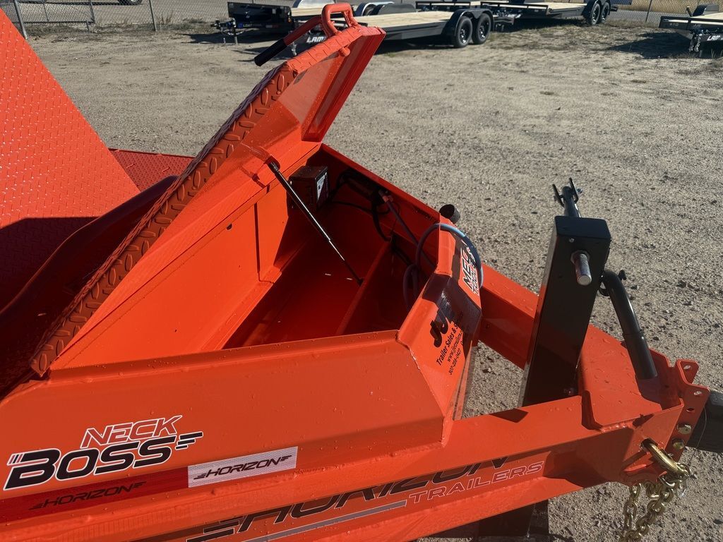 Bumper Pull2 - 7K Lippert Electric Brake Auto Adjust Oil Bath Torsion AxlesST235/80R16 Tires (10 ply) w/Black Mod WheelsWeld on Spare Tire Mount2-5/16” Adjustable BP Coupler (17K)Neckboss 8” Engineered I-Beam Tongue3/8” Grade 70 Safety Chain w/Clevis Hook1 - Side Wind Spring Loaded Drop Leg Jack (12K)Mega Lockable ToolboxIn Deck Storage BoxStandard Stake PocketsPipe Spools3/16” Thick Drive Over Fenders8” I-Beam Frame3” Channel 16” Spacing CrossmembersRub RailGravity TiltAll-Weather Wiring Harness (7-Way RV)DOT Approved LED LightsPine Lumber FlooringPowdercoat Orange