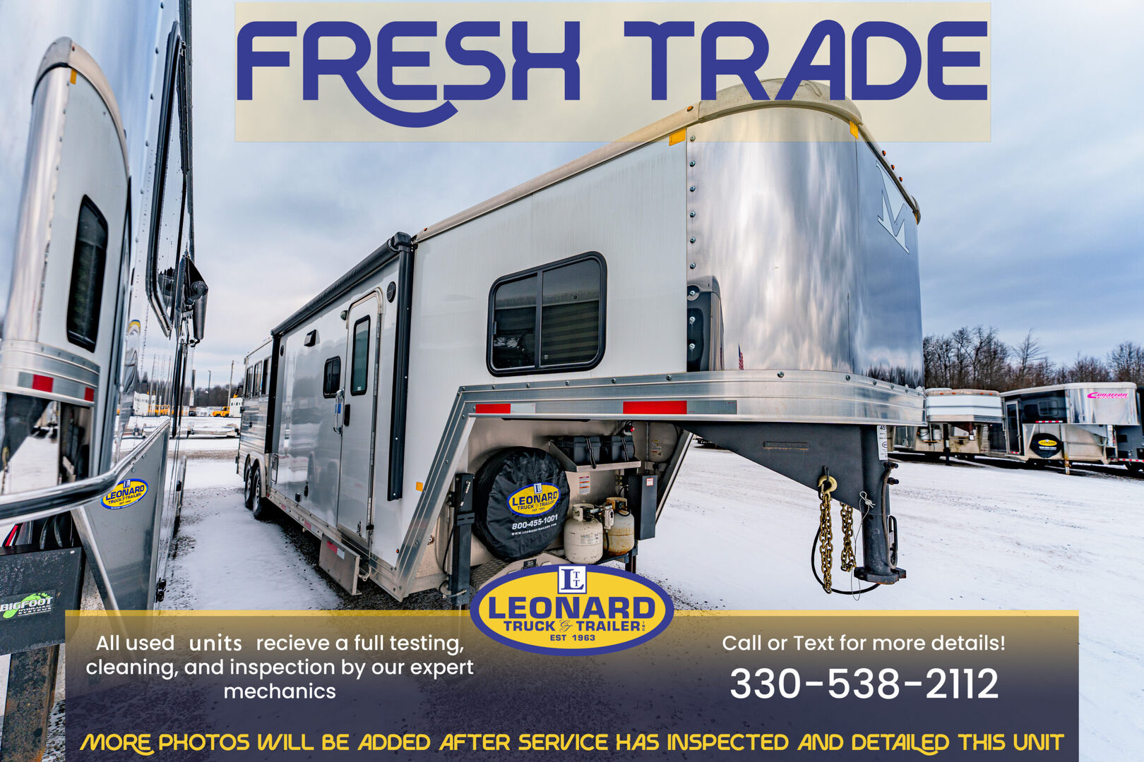 View Inventory: https://leonardtrailers.com/inventory/45109 Stock# 45109 Used 2020 MERHOW 3H GN-LQ Trailer    General Information Construction: Steel frame with aluminum skin Coupler Size: 2 5/16” Adjustable: Yes Roof: Aluminum Primary Color: White Length: 36’ Width: 8’ Height: 7’8” Horse Area Type: Slant Rubber Lining: Complete Escape Type: 1 Full Walk Out Tack AreaType: Rear Collapsible, Inside Dress Saddle Racks Door / Gate Double Rear Doors Ramp w/ Tail Doors Dressing Room Options: Lined/Insulated  Carpet  110V Package  Living Quarters Size: 14’ Awning Size: 16’ Walls/Ceiling: Wood Options: Air Conditioning  Heat Strip/Furnace Sofa / Dinette  Sink / Kitchen  Stove / Refrigerator  Microwave / Oven Sink in Bath Toilet / Shower Slide Out  Specifications GVW: 14,200 lbs Axle Size: 7,000 lbs Tire Size: 16” # of Brakes: 4 Brakes: Electric Ride Type: Rubber Ride Jacks: Dual Hydraulic We offer outstanding financing options, accept trades, and can arrange nationwide NO HASSLE delivery! Inquire today for more information! (888) 333-6613 **We believe these specifications to be accurate. Any discrepancies are unintentional. Please verify information with a sales associate prior to purchase.** Stock Number:45109