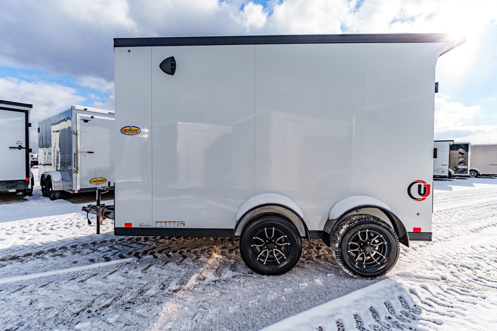 View Inventory: https://leonardtrailers.com/inventory/45247 2026 UJ-712TA35-8.5 Enclosed Cargo Trailer Stock #45247 Key Features: Overall Design: Heavy-duty 2” x 4” tubular steel frame 24” V-nose with slant design for improved aerodynamics 7 ft. interior height for maximum cargo space 16” on-center walls, roof bows, and crossmembers for superior strength Seamless aluminum roof with 24” wide Lauan center strip Rear wing option for a sleek finish Interior: 3/4” plywood flooring for long-lasting durability 3/8” plywood wall liner for a clean, professional interior Four heavy-duty bolt-in D-rings for secure cargo tie-down Dual sidewall vents (TSR-175) for airflow and moisture control Axles, Tires & Suspension: Tandem 3,500 lb. torsion axles with electric brakes 5” axle spread for improved stability ST205/75R15 LRD Westlake tires Black and silver Eagle aluminum wheels Exterior: .030 white smooth aluminum exterior panels Full Blackout Package (black trim, corner caps, fenders, stone guard, and door framing) Slant-cut ATP stone guard for protection and style Four 9” single round fenders Taped exterior metal for clean seams Doors: 32” x 72” RV-style side entry door (400 Series) with aluminum hold-back Rear ramp door with plywood flap and spring assist for easy loading Lighting & Electrical: LED round recessed clearance lights LED dome light with 12V wall switch LED surface-mount tail lights 12-volt electrical system for efficient power management Hitch & Safety: 2-5/16” coupler 7-way molded plug Breakaway kit with charger Top-crank jack with foot pad Heavy-duty safety chains Warranty: 3-Year Limited Warranty We offer outstanding financing options, accept trades, and can arrange nationwide NO HASSLE delivery! Inquire today for more information! (888) 333-6613 **We believe these specifications to be accurate. Any discrepancies are unintentional. Please verify information with a sales associate prior to purchase.** Stock Number:45247