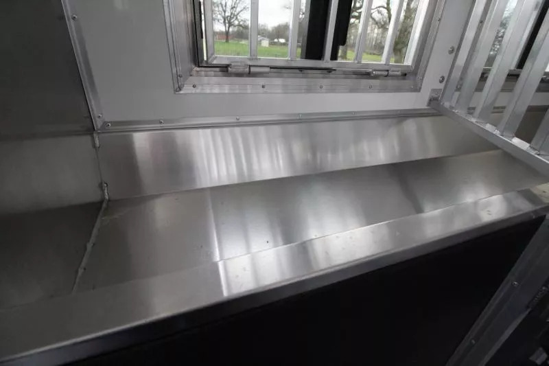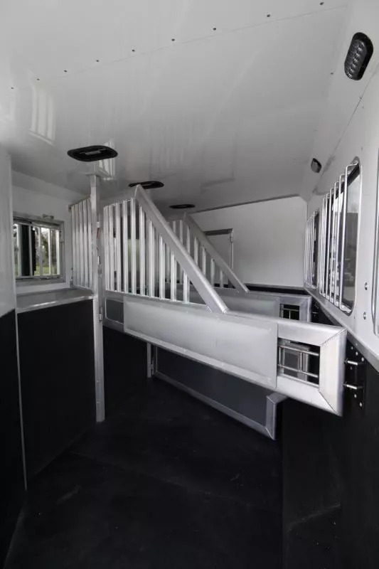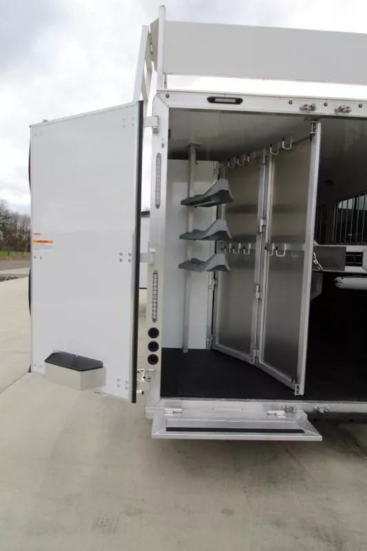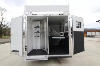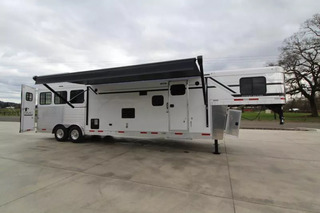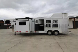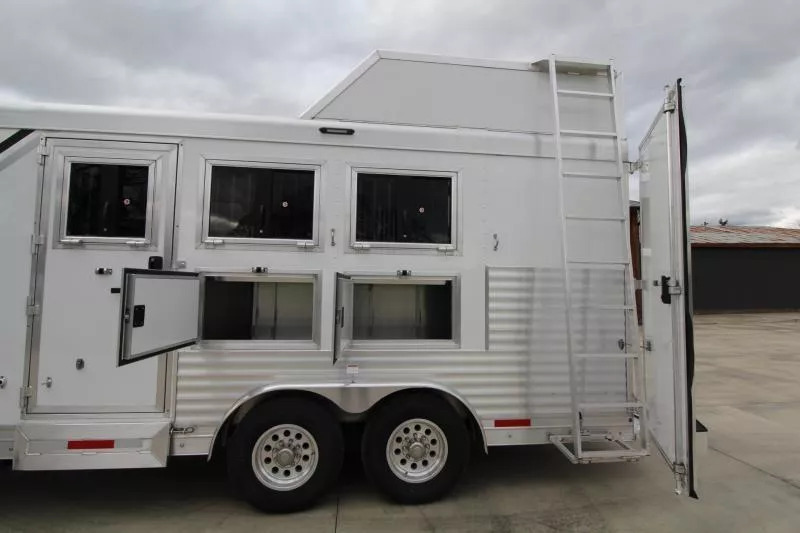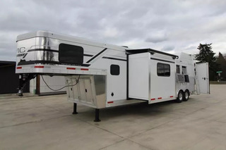 Trailer pictured has been sold; a similar trailer is on order and coming soon! Please call for an ETA on this trailer. Trailer Features: All Aluminum Construction 8’ Wide 7000# Axles Polished Aluminum Wheels Dual Leg Hydraulic Jack Extruded Slat Outside of Horse Area Folding step at escape door Hay Rack & Ladder Stainless Steel Nose Wrap Full Front Riser Wall Cover Keyless Entry 320W Solar Panel Power Awning w/ Weather shield and light Single Piece Aluminum Roof Side & Rear Load Lights Spare Tire (2) 5 gal. LP Tanks (2) RV Batteries Double Tail Lights LQ Features: LED Puck Lighting in Ceiling Barnwood Linoleum Floor 10 gal. Water Heater Convection Microwave Dream Dinette 2 Burner Recessed Cooktop Dometic Refrigerator Porcelain Toilet Cable Driven Slide Out A/C 12V Fan in Bathroom Glass Shower Door Solid Wood Cabinet Doors Stainless Steel Sinks Soft Touch Pleated day/night Shades Sofa/Sleeper Mattress Gas Furnace 24” TV Radio - interior & exterior speakers Horse Area Features: Air Flow Dividers Escape Door w/ Drop Down Window Step at Escape Door Feed Bag in 1st Stall Stud Divider 55/45 Rear Doors LED Lighting Rubber Wall Mats Rubber Floor Mats Tack Area Features: Collapsible Rear Tack Flip down step Blanket Bar Brush Tray Bridle/Halter Hooks - extra added 3 Tier Saddle Rack on Removable Post LED Dome Light ** Descriptions Subject to Error** For more information on this trailer please contact Double J Trailers at 360-225-1234. Thank You! Financing available to qualified buyers! All trailer prices are cash prices. Thank you! Trades Welcome Two Lots To Better Serve You! Woodland Washington & Albany Oregon We have over 250 trailers in stock. Please view our entire inventory at [www.double-j.com](http://www.double-j.com/) thank you! *Double J imposes a surcharge of 3% on credit card purchases of amounts greater than $500*