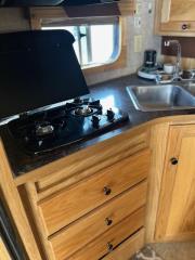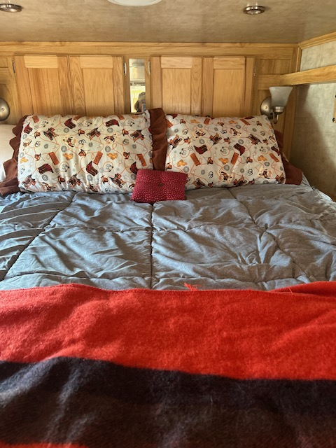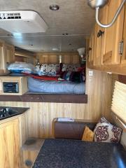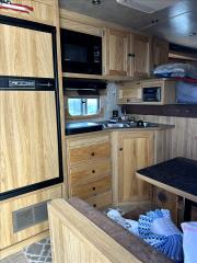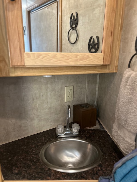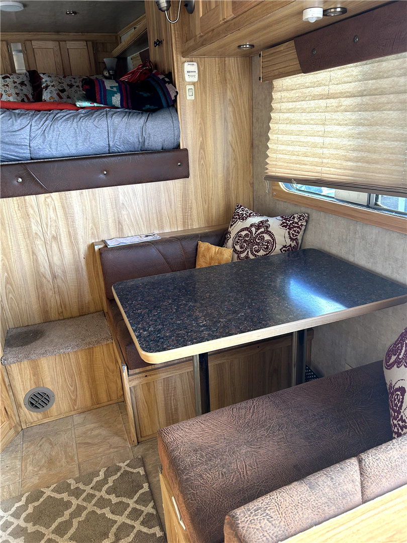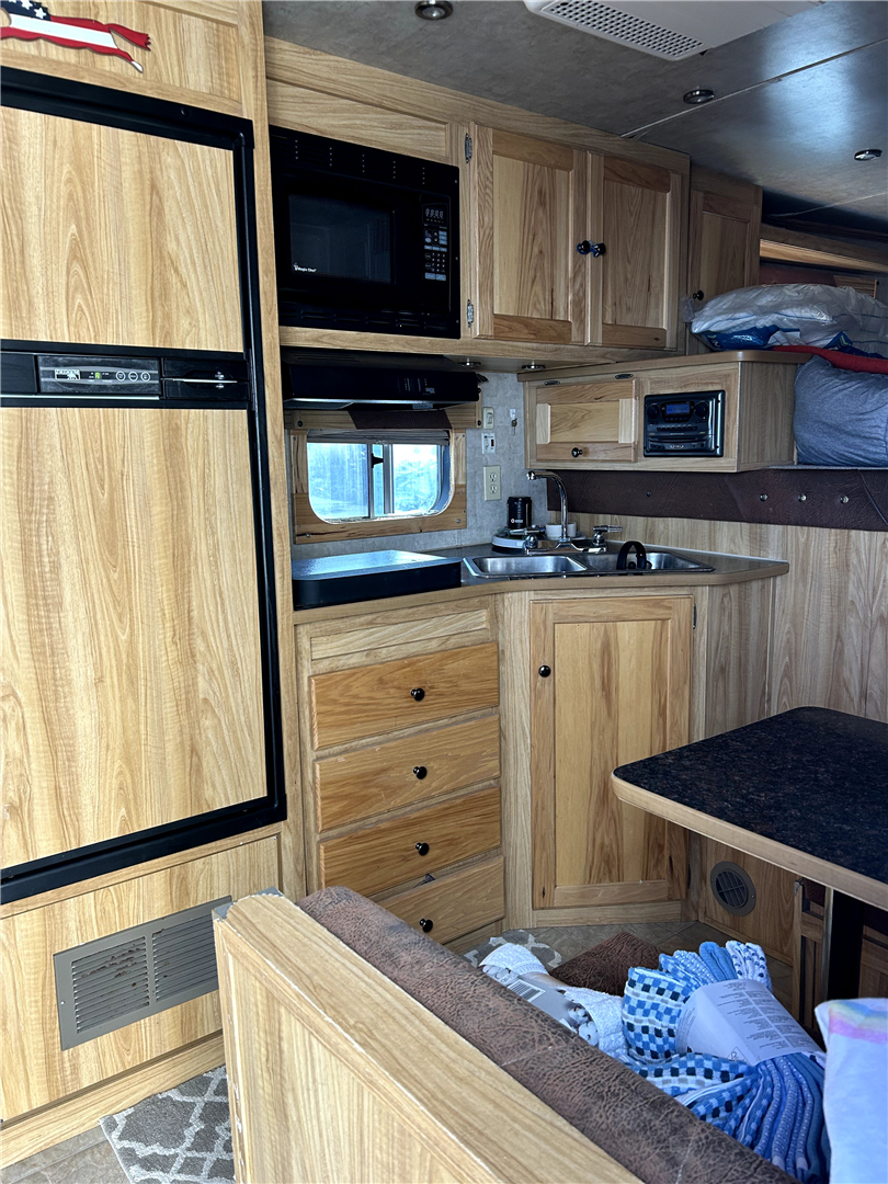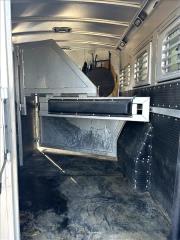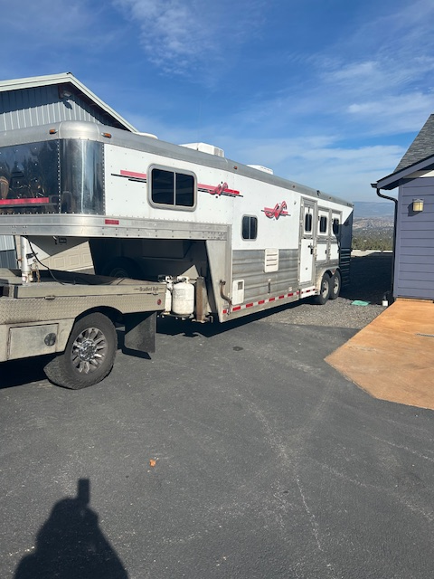 3 Horse Warm Blood (extra high, extra wide stalls) Platinium living quarter horse trailer. High quality conversion, can't remember who did it. It has solid hickory cabinet doors, loaded with storage (more than we used), comfortable bed, dining booth that drops down into a bed, larger refrigerator with separate freezer, two burner stovetop and kitchen sink. Plenty of space for all your clothes an linens. Bathroom has a shower with glass door, flush toilet, and sink with vanity along with a lot of cabinets to store things. Grey and black water tanks, fresh water tank under booth seat.