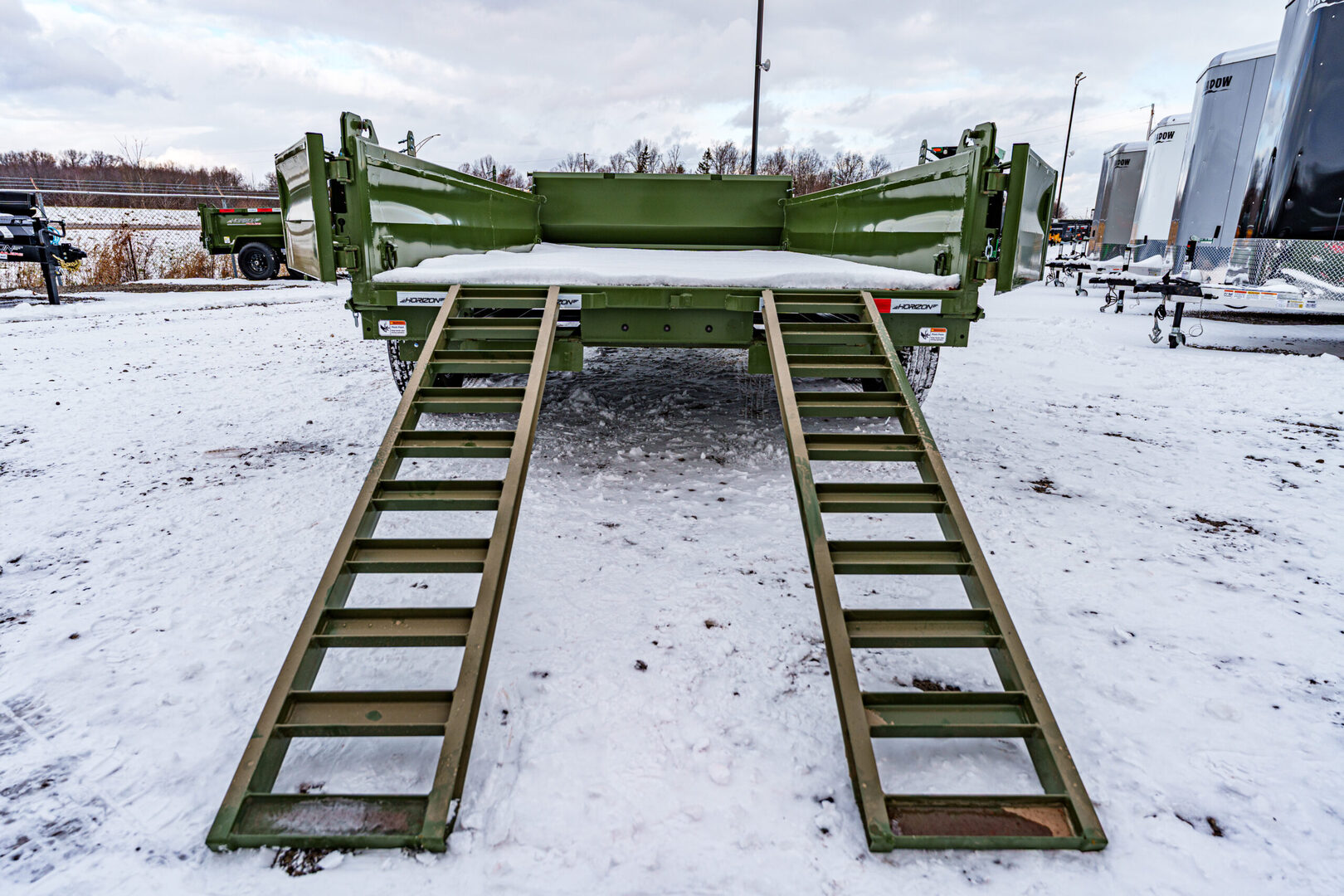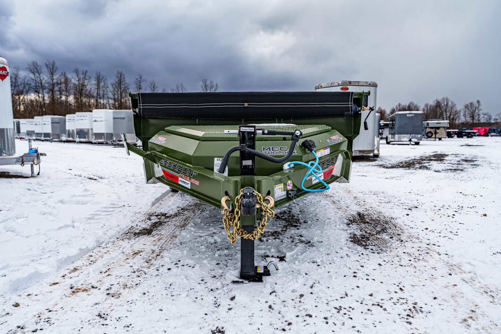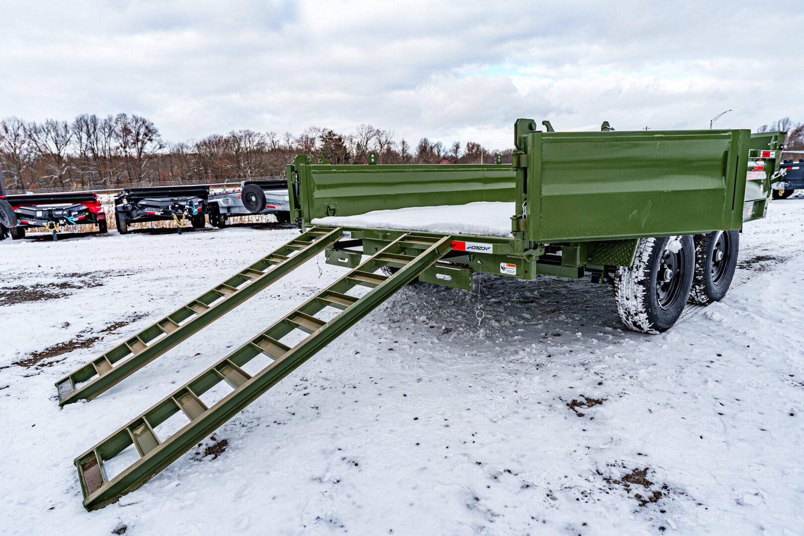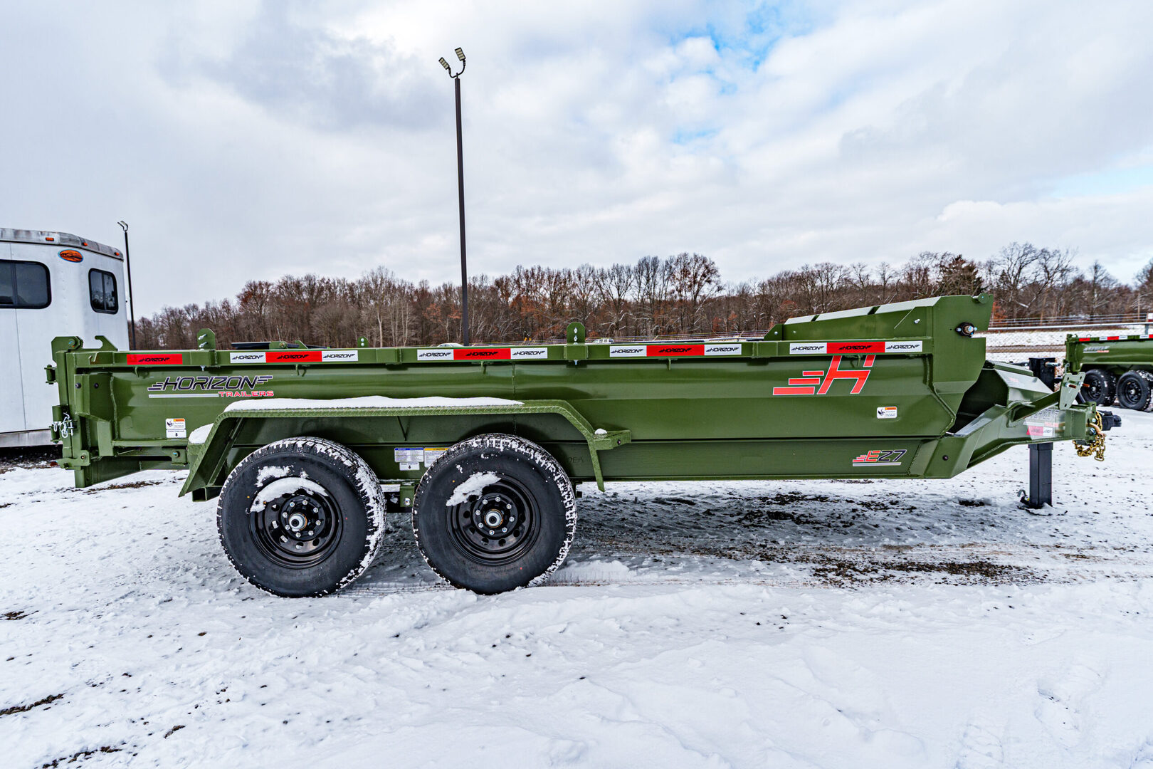View Inventory: https://leonardtrailers.com/inventory/45263 Stock# 45263 New 2026 Horizon Trailers EZ7 14’ x 83” 7K 2A DT Dump Trailer The Horizon EZ7 is an economical dump trailer built for strength, reliability, and performance. Designed with a reinforced steel frame and a high-capacity hydraulic hoist, it delivers smooth dumping and long-term durability. Adjustable side heights, multiple size options, and a 3-way spreader gate make it ideal for a wide range of hauling applications. Standard features include DOT-approved LED lighting, a lockable toolbox, and durable suspension for safe and dependable operation. Model: EZ7 14’ x 83” 7K 2A DT Warranty: Axle: 6-Year Lippert Spring Axle Warranty Trailer: 3-Year Frame / 1-Year Parts Trailer Specs: Tongue: Neckboss 8” Engineered I-Beam, 60” length Weld-on spare tire mount Coupler: Adjustable 2-5/16” Auto Latch (17,000 lbs) Jack: 12,000 lb side-wind, spring-loaded drop leg Toolbox: Mega lockable box housing battery & pump with extra storage Frame: 8” I-beam main frame (13 lbs/ft) 3” channel crossmembers, 16” spacing 3” x 5” x 1/4” angle iron bed frame Bed: 83” width | 28” height | 9ga steel floor Dump angle: 40°–48° 4 welded D-rings inside bed Rear: 3-way spreader gate Ramp pockets with 6’4” slide-in ramps (4,000 lb wheel rating each) Sides: 19” height | 12ga rounded steel | 2” x 3” x 11ga top rail Stake pockets and J-hooks 14ga diamond plate fenders Hydraulics: 5” x 16” single push cylinder (15,000 lb) KTI 12V hydraulic pump | 2-button power up/down controller | 14’ cord Axles & Tires: (2) 7K Lippert EZ Lube spring axles w/ electric brakes (8 on 6.5”) ST235/80R16 radial tires on 16” black mod wheels We offer outstanding financing options, accept trades, and can arrange nationwide NO HASSLE delivery! Inquire today for more information — (888) 333-6613 We believe these specifications to be accurate. Any discrepancies are unintentional. Please verify information with a sales associate prior to purchase. Stock Number:45263