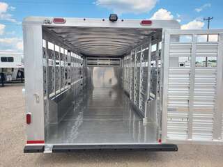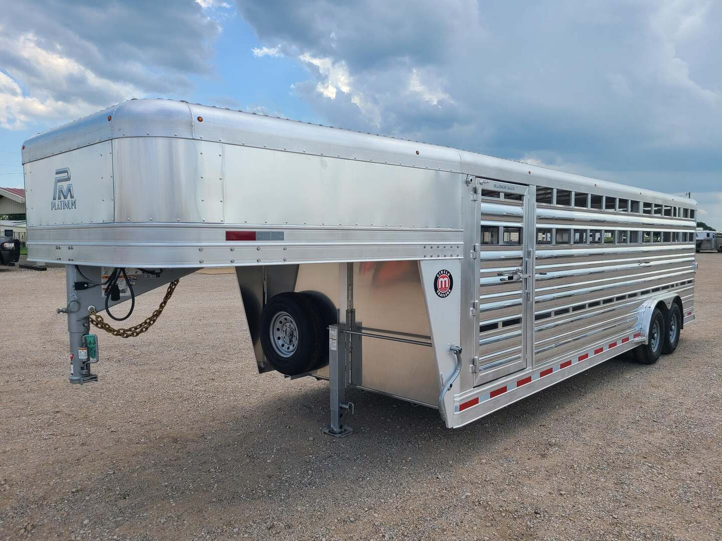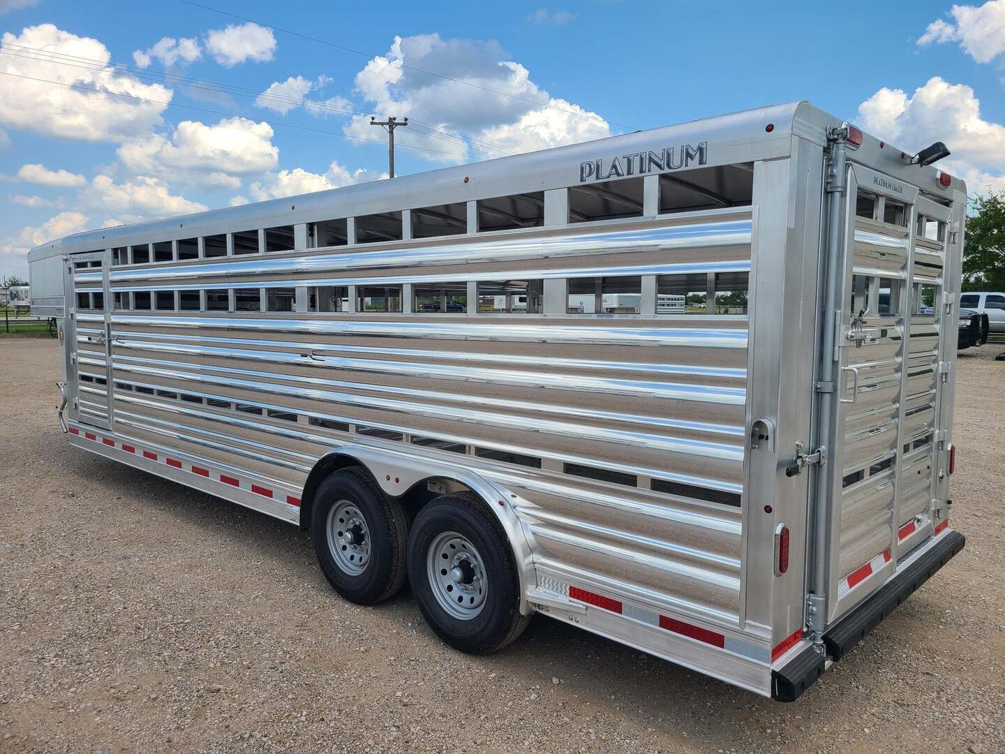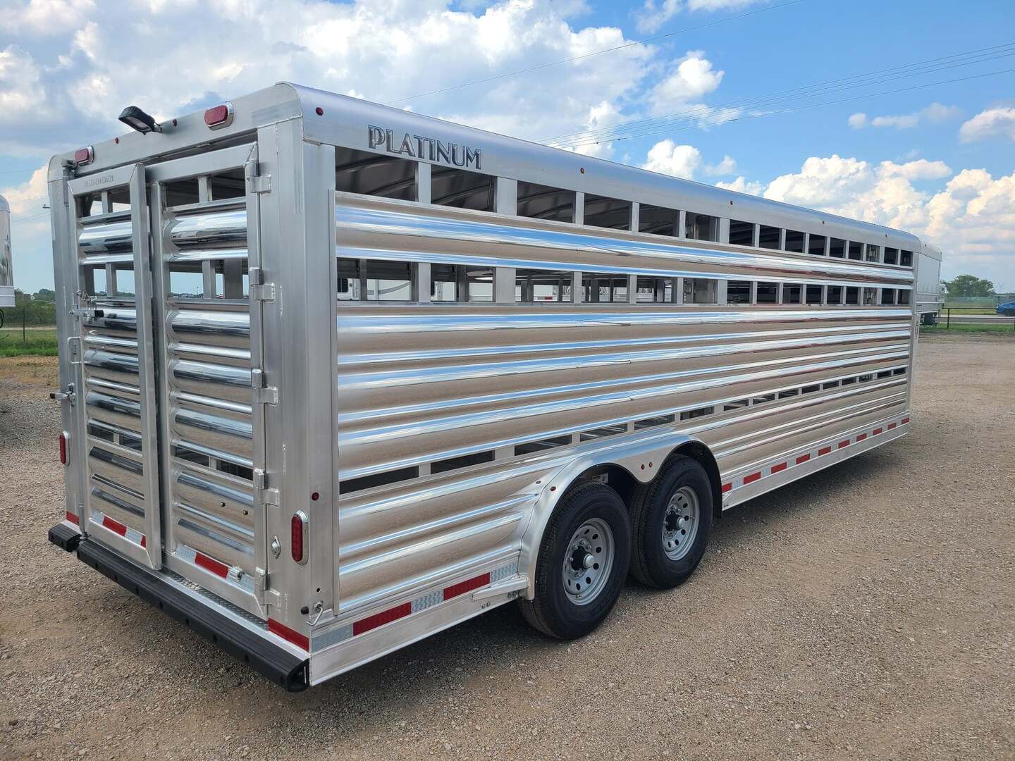 THIS TRAILER IS ON ORDER AND WILL ARRIVE IN JANUARY Platinum Coach 24’ Stock Trailer....7 TALL!! 8 x 24 x 7’ tall Mill Finish exterior skin 7000# axles with 10 ply tires & spare Two cut gates, 48” front, 120” middle, 120” back Slider on rear gate 36” stock escape door 2” air crack down low 7 lights on top rail One LED light per section LED load light at rear Mill Finish Exterior Skin 50” drop height, for more clearance at truck