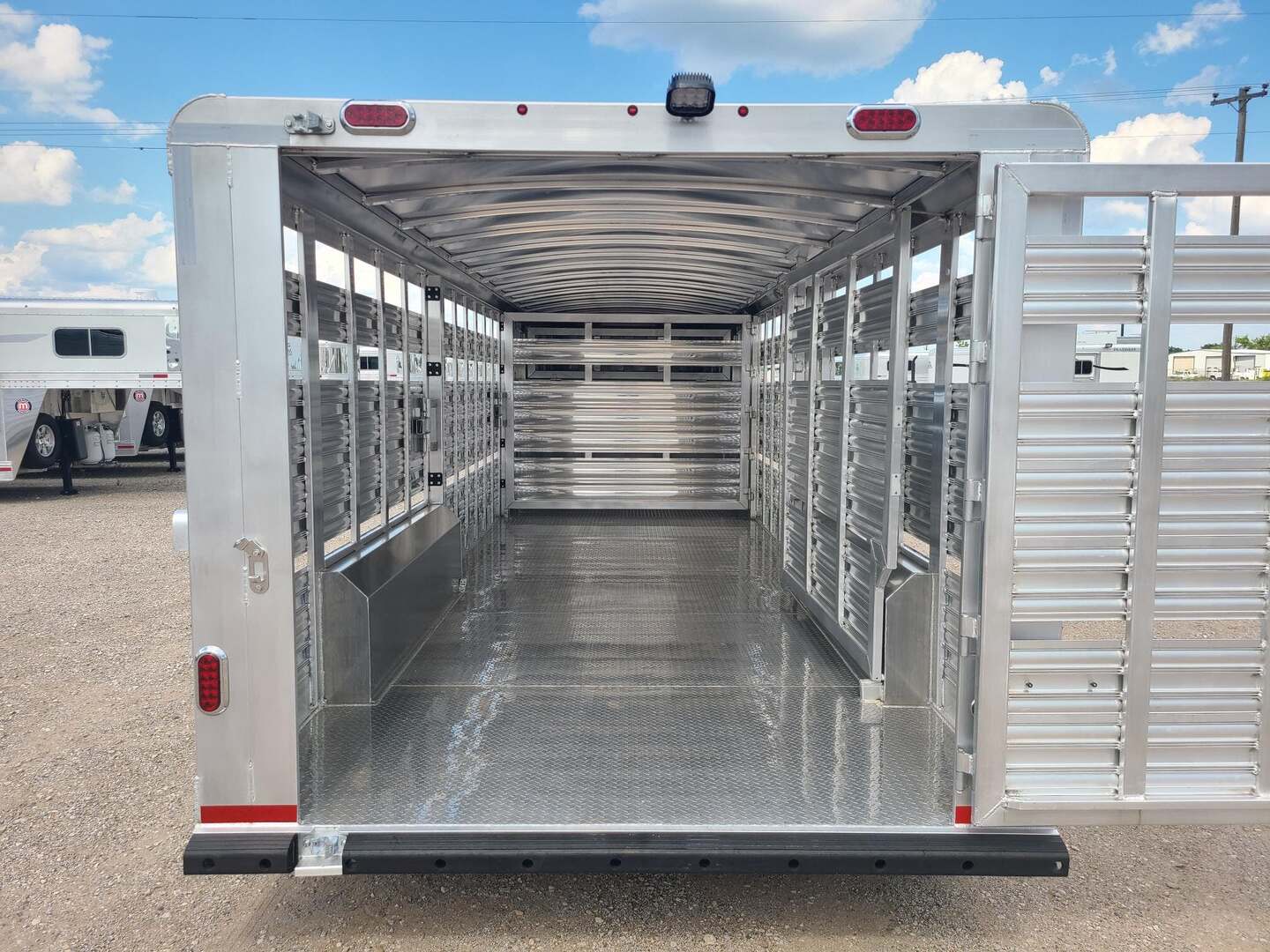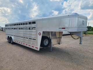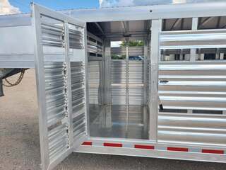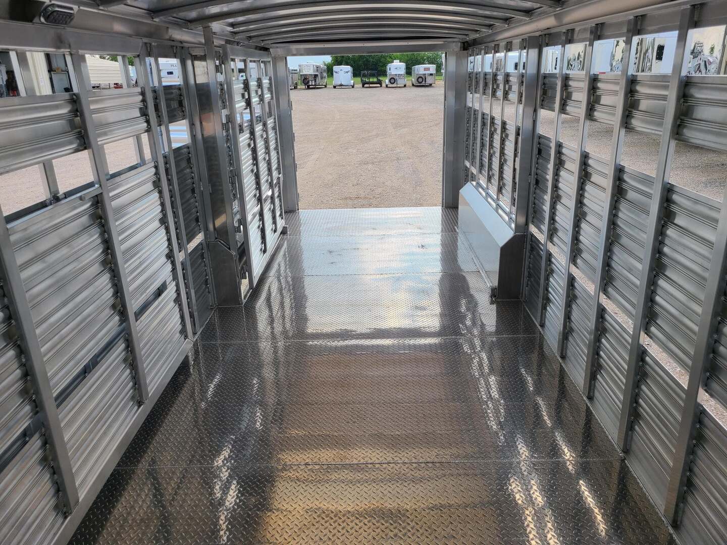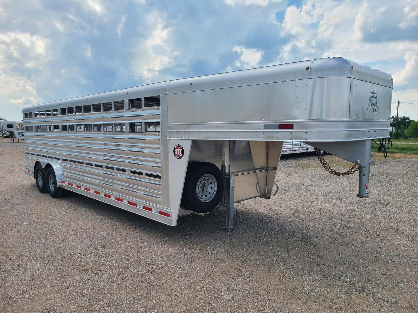 THIS TRAILER IS ON ORDER AND WILL ARRIVE IN JANUARY Platinum Coach 24’ Stock Trailer....7 TALL!! 8 x 24 x 7’ tall Mill Finish exterior skin 7000# axles with 10 ply tires & spare Two cut gates, 48” front, 120” middle, 120” back Slider on rear gate 36” stock escape door 2” air crack down low 7 lights on top rail One LED light per section LED load light at rear Mill Finish Exterior Skin 50” drop height, for more clearance at truck