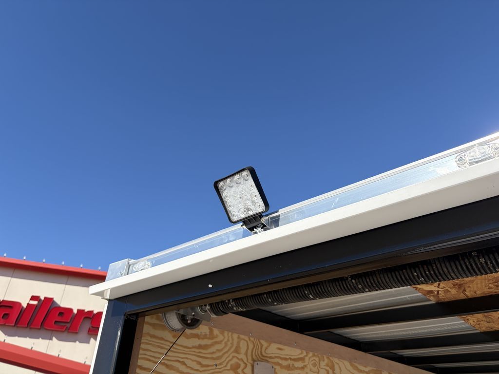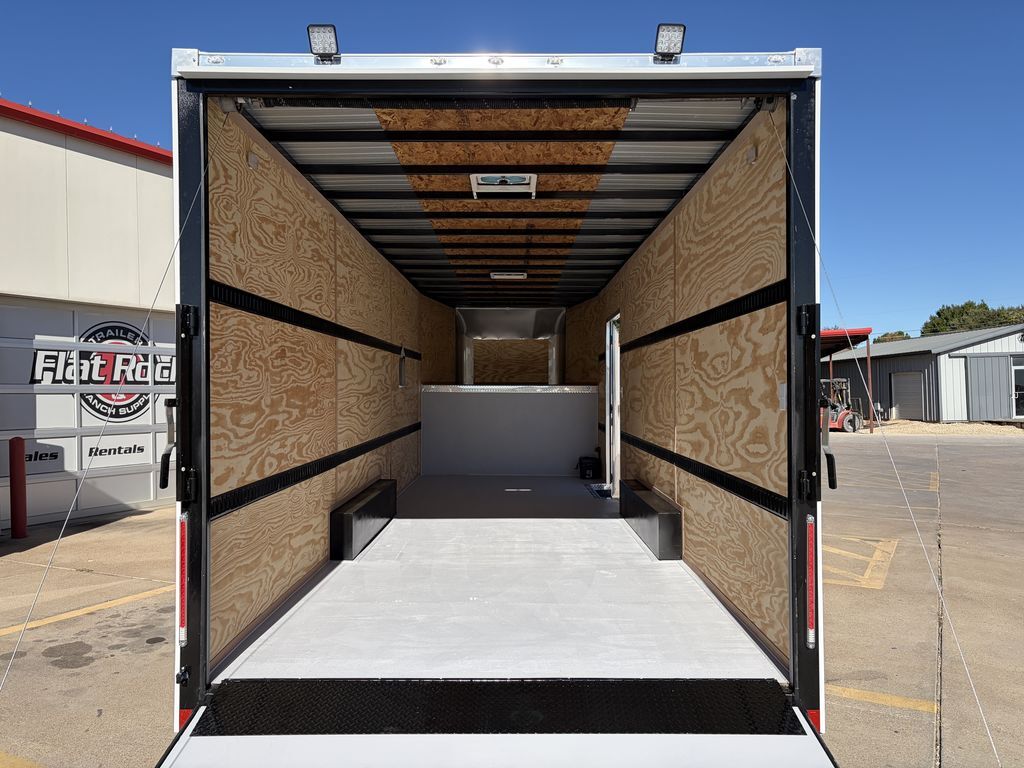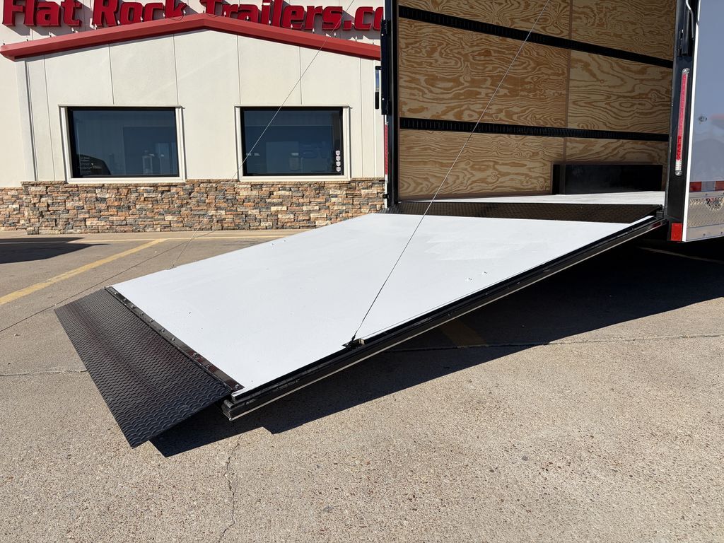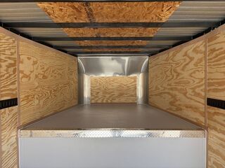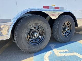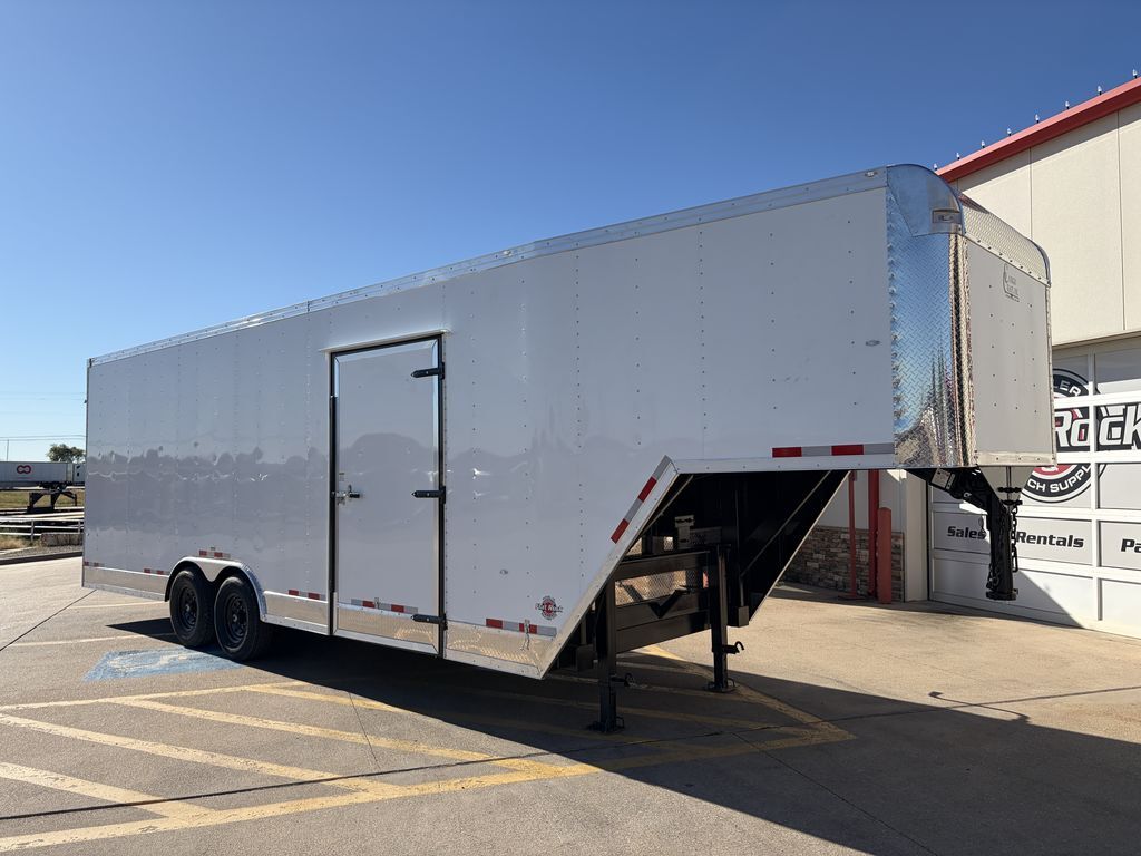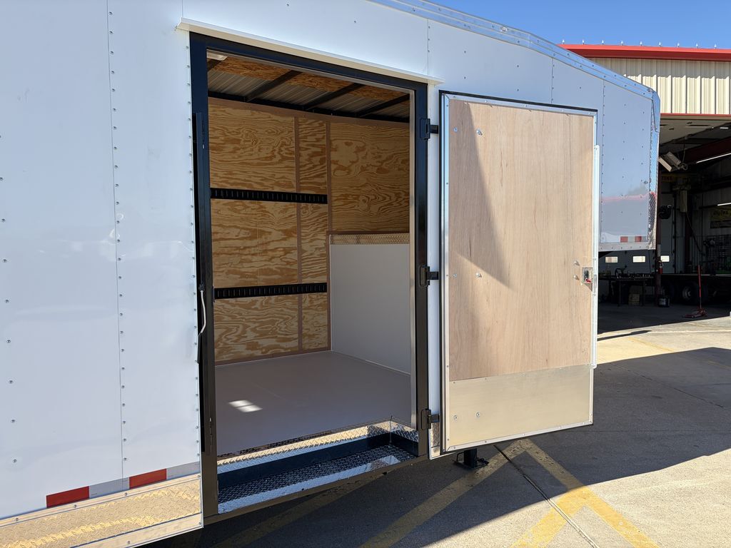 8.5’ x 32’ 14K GN Cargo Trailer (24’ + 8’) 2 x 7,000 lb. Brake Axles .040 Aluminum Skin Cast Corners Gray Painted Floors (20’) 1 in x 2 in Walls 4 x 12 V LED Dome Lights w/ Wall Switch 2 Rear Load Lights Battery and Front Box (Fully Self Contained) E Track (2 Strips on Each Wall) 48 in Side Door w/ RV Latch 8’ Interior Height Built in Door Step 2 x 10K Drop Leg Jacks H/D Spring Assist Rear Ramp 2 Steel Door Transition Flaps ST 235 80 R16 in Radials on Black Mod Wheels Smooth Aluminum Fenders Spare Tire Rack (Front) Empty Weight: 6,000 lbs. GVWR: 14,000 lbs. Carrying Capacity: 8,000 lbs.