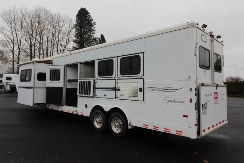 This trailer is LOADED with features! Take a look at the beautiful unique interior design and spacious Living Quarters. Key features include: 8ft Wide 8ft Tall 15ft Short wall Living Quarters On Board Generator - Onan MicroQuiet 4000 Fireplace Slide out Gorgeous interior with tons of storage Pantry w/ slide out rack Sound system with a subwoofer, interior and exterior speakers Exterior TV! Place for interior TV Interior features: Red Paisley ”Leather” soft touch walls Fancy ”Leather” soft touch ceiling Hickory Wood cabinetry And lower wall panels Decorative Window Valances - paisley leather inlay Day/night pleated window shades Slide out w/ 3 windows Leather Couch - Folds down into a bed - Storage behind Wood covers for Sink & Stove Top Stainless Steel dual kitchen sink 2 Burner stove top Tin backsplash Cabinets and Drawers under counter Microwave Glass door cabinet next to Microwave with Video output/TV setting controls. Fridge and Freezer with wood paneled doors Pantry with roll out wire rack food storage Radio & Speaker controls Subwoofer Carpeted bed area Window each side Rope lights around windows and ceiling inlay Rope lights in bunk area have a dimmer switch Mirrors at head of bed area Ceiling inlayed mirror with rope lights - Star design and outline Small storage areas on each side of bed Fireplace TV hook ups above fireplace Ducted furnace Pocket door to restroom Spacious Restroom Black toilet - matches interior decor Angled Shower - Opaque Glass shower door & Skylight Large wardrobe with interior light and clothes rod Large Bathroom counter Stainless steel sink Vanity & medicine cabinet Antique style oval mirror Towel bar Pass through door to horse area Exterior TV! Horse area, Exterior & other features: 4 horse trailer Escape door Lined and insulated horse area Full height stud divider 1st stall w/ airflow - Rubber mat to protect from kick damage Padded Dividers Mangers w/ Solid partitions 2 tie rings pers stall Drop down windows on head side AND tail side Roof vent above each stall Rubber floor mats and wall mats Interior lights Folding rear tack 4 place swing out saddle rack Headstall Holders 2 Blanket bars Small door organizer pouches Brush tray on door Ramp Two load lights above rear doors Porch light at LQ door LQ step (not pictured) Manger storage with individual doors 3rd Manger houses the Generator Hydraulic jack 2 Propane tanks Spare tire Battery box ** Descriptions Subject to Error** For more information on this trailer please contact Double J Trailers at 360-225-1234. Thank You! Financing available to qualified buyers! All trailer prices are cash prices. Thank you! Trades Welcome Two Lots To Better Serve You! Woodland Washington & Albany Oregon We have over 250 trailers in stock. Please view our entire inventory at [www.double-j.com](http://www.double-j.com/) thank you! *Double J imposes a surcharge of 3% on credit card purchases of amounts greater than $500*