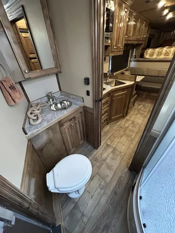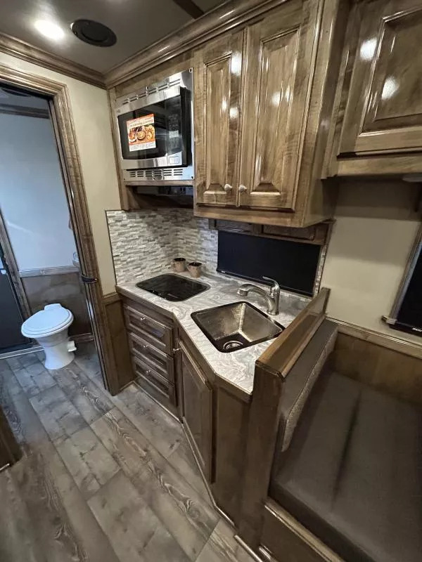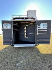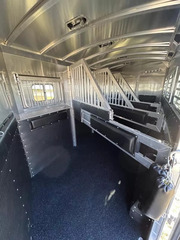 Key Highlights Premium Horse Area * 4-Horse Side Load design for smooth, safe loading * WERM flooring for superior traction, comfort, and easy cleaning * 18” deep feed mangers with exterior storage access * Drop-down windows on head and hip sides for ventilation * Padded dividers, rubber kick walls, and interior LED lighting * Rear tack with saddle racks, bridle hooks, and blanket bars All-Aluminum Construction & Exterior Features * Lightweight, corrosion-resistant, built to last * 8 ft hayrack with ladder for extra storage * Dual 8,000 lb torsion axles with electric brakes * 50-amp electrical service with converter and battery setup * Fresh, grey, and black water tanks with monitor panel Luxury Living Quarters by Outback Conversion * Handcrafted hardwood cabinetry with custom tile backsplash in the kitchen * Hand-pounded nickel sink * Full kitchen: refrigerator, cooktop, microwave, and stainless fixtures * Queen bed in gooseneck plus table that converts into a bed for added flexibility * Full bath with shower, toilet, vanity, and wardrobe * Upgraded 30# LP tanks for extended off-grid use * Ducted A/C, furnace, entertainment system, and ample storage *** Why You’ll Love It The 2026 Platinum 4-Horse LQ - Side Load combines showroom-quality finishes with rugged, ranch-ready functionality. From the custom Outback interior with hand-finished details to WERM flooring, deep feed mangers, and convertible table bed, every feature is designed to make life easier for both horse and owner. For more information contact us at (512-746-2515)