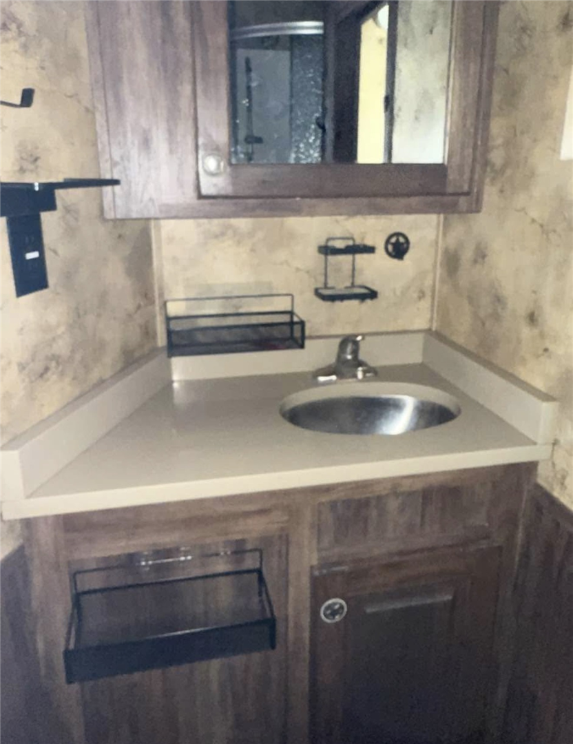 * Bedroom lots of closet space and cabinets with pocket doors for privacy